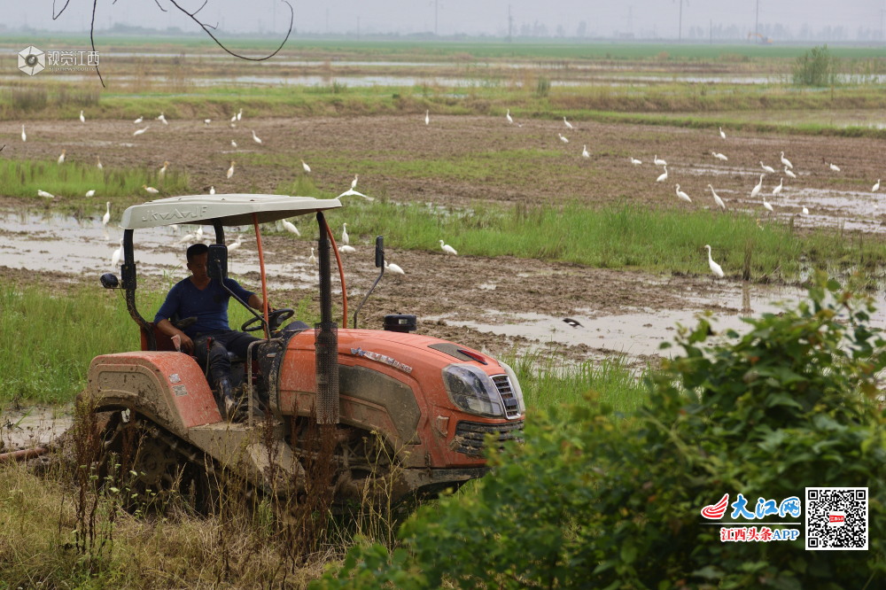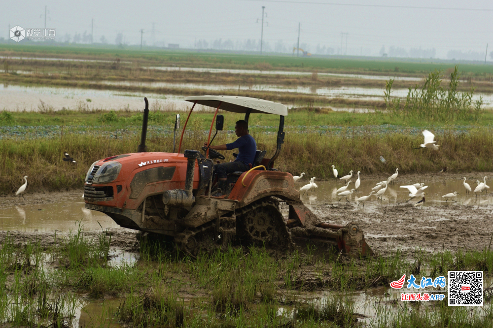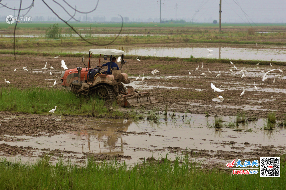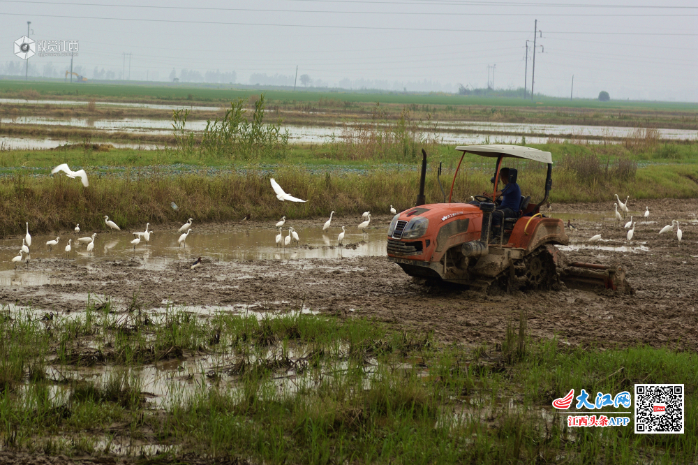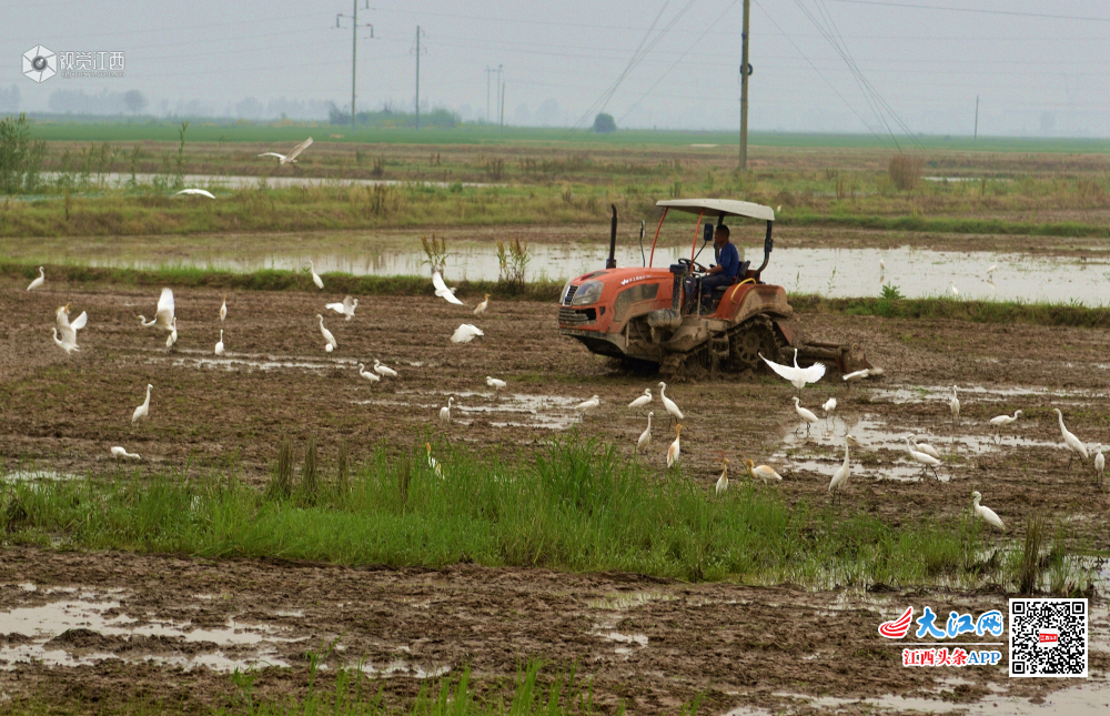 途经珠湖农场,路旁农田有拖拉机在不停来回耕地,许多白鹭、牛背鹭紧紧跟着觅食,一派和谐场景。