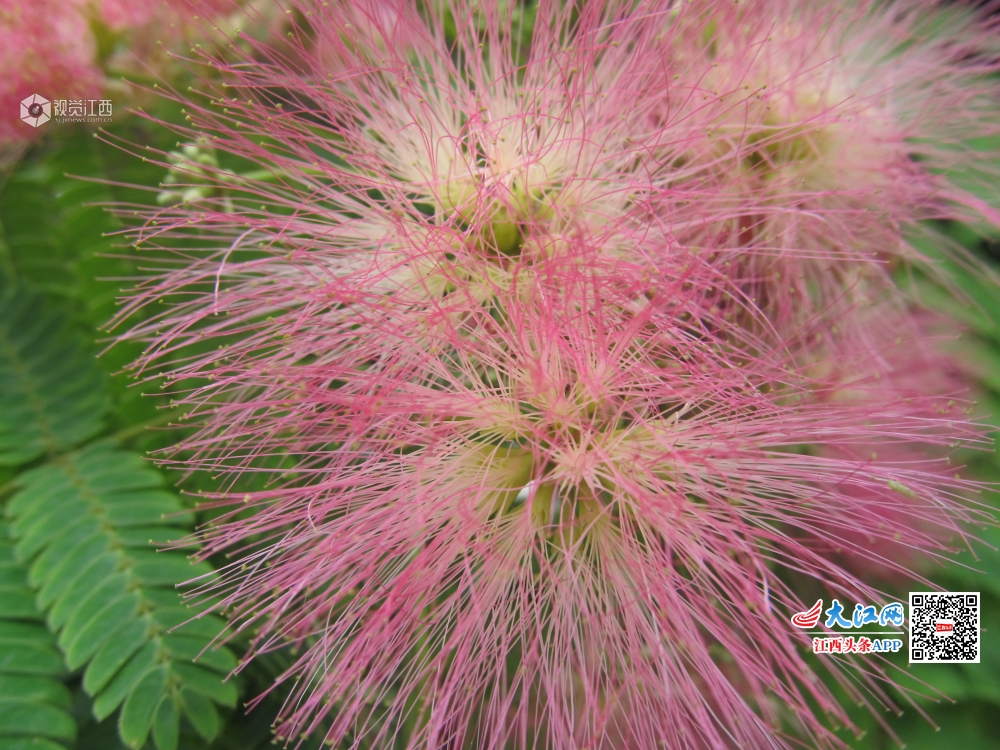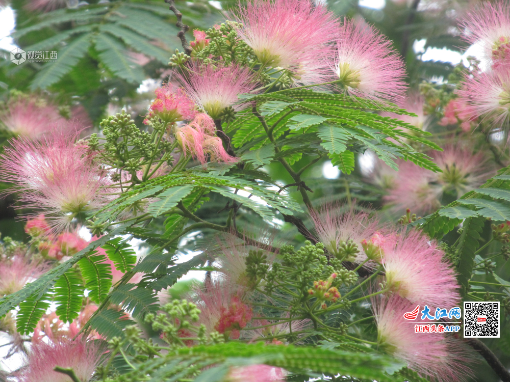 5月29日,在安福县中山公园里的合欢树花开正艳,满树绿叶红花,翠碧摇曳。