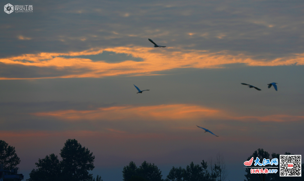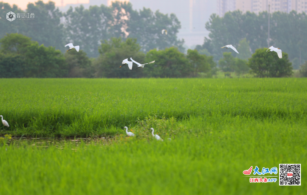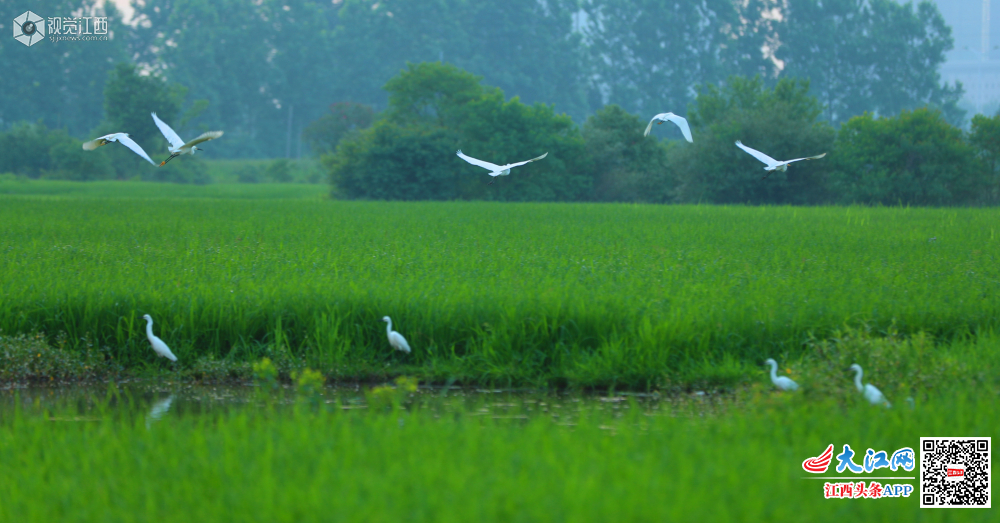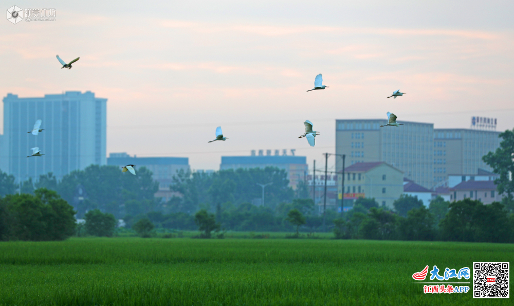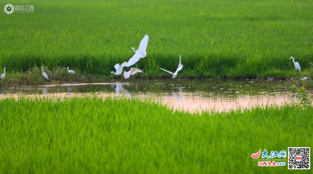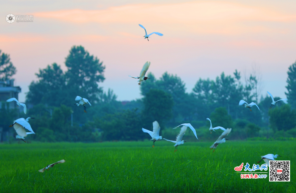 5月29日清晨,在江西省吉安市泰和县澄江镇上田村生态水稻田园,成群结队的白鹭,迎着朝霞,时而展翅翱翔,时而塘边波漫步。一只只、一群群,戏水嬉戏,奏响了夏日晨曲,呈现一幅白鹭晨舞美景图。