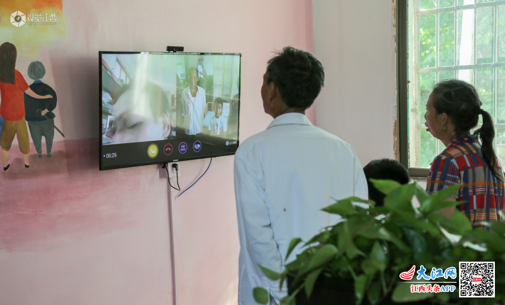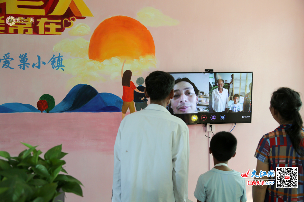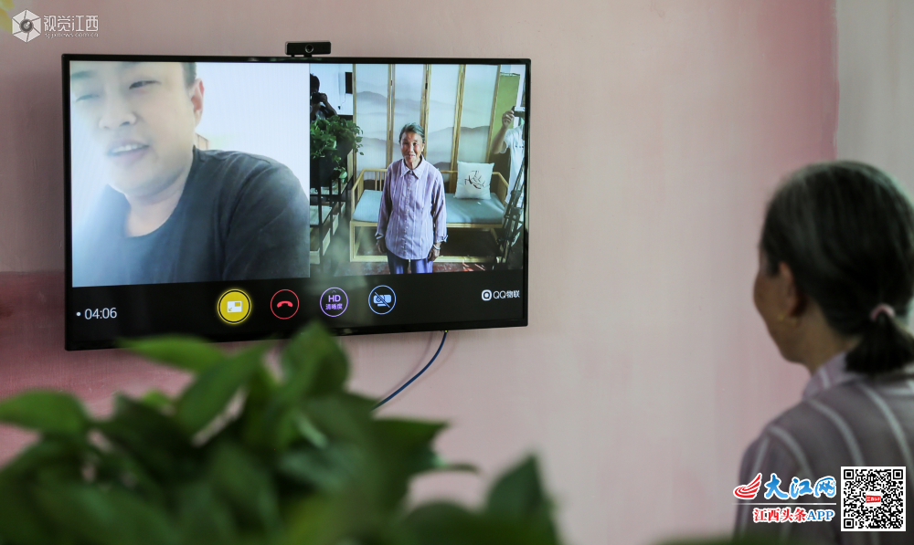 6月4日,仙女湖区凤凰湾办事处东坑村肖雅文和爷爷奶奶在村里的“亲情小屋”和远在福建工作的父亲视频通话。
