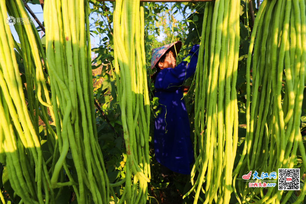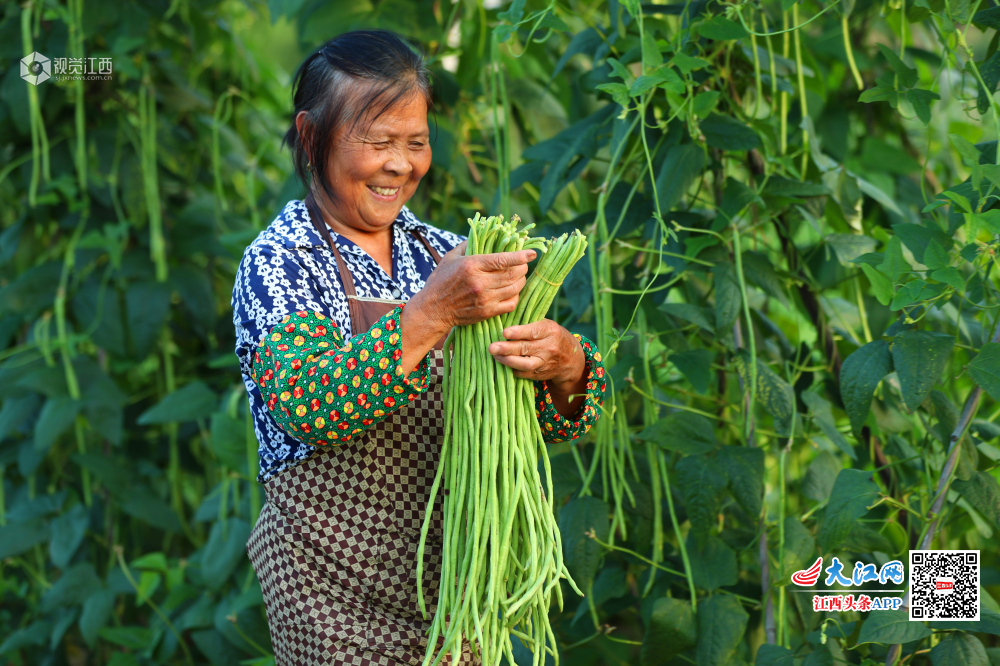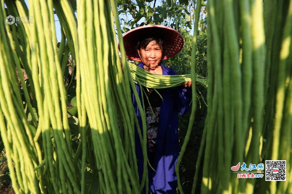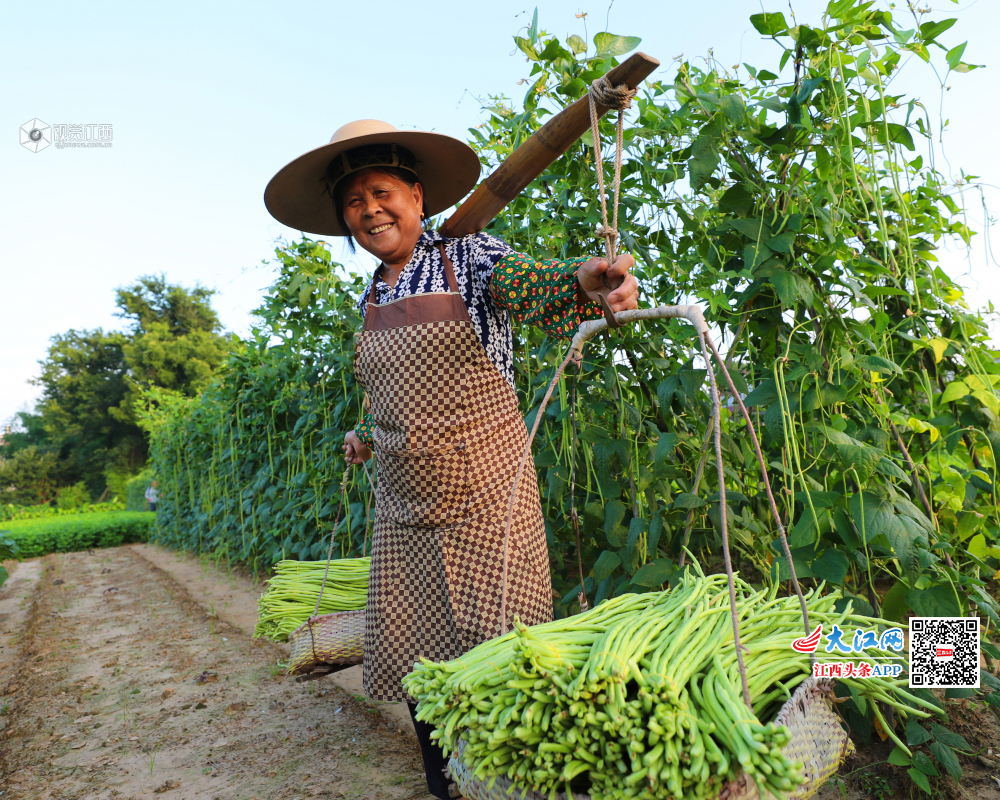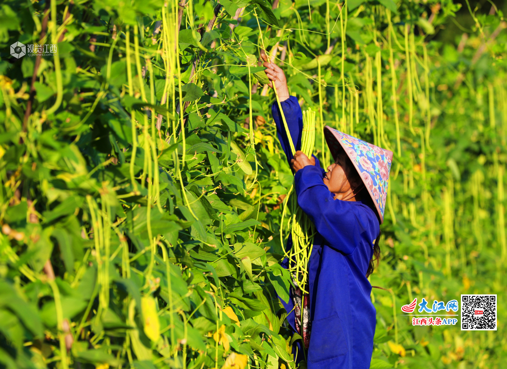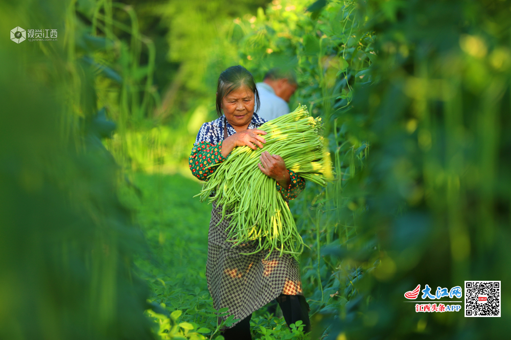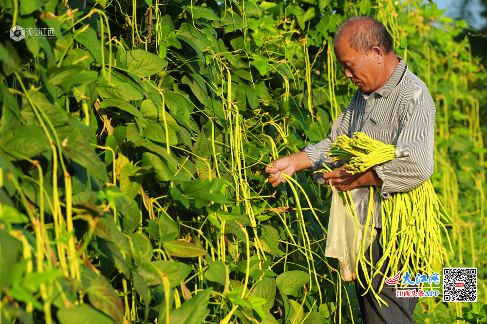 6月15日,在江西省吉安市泰和县绿色蔬菜种植基地,农民正忙着采收豆角。