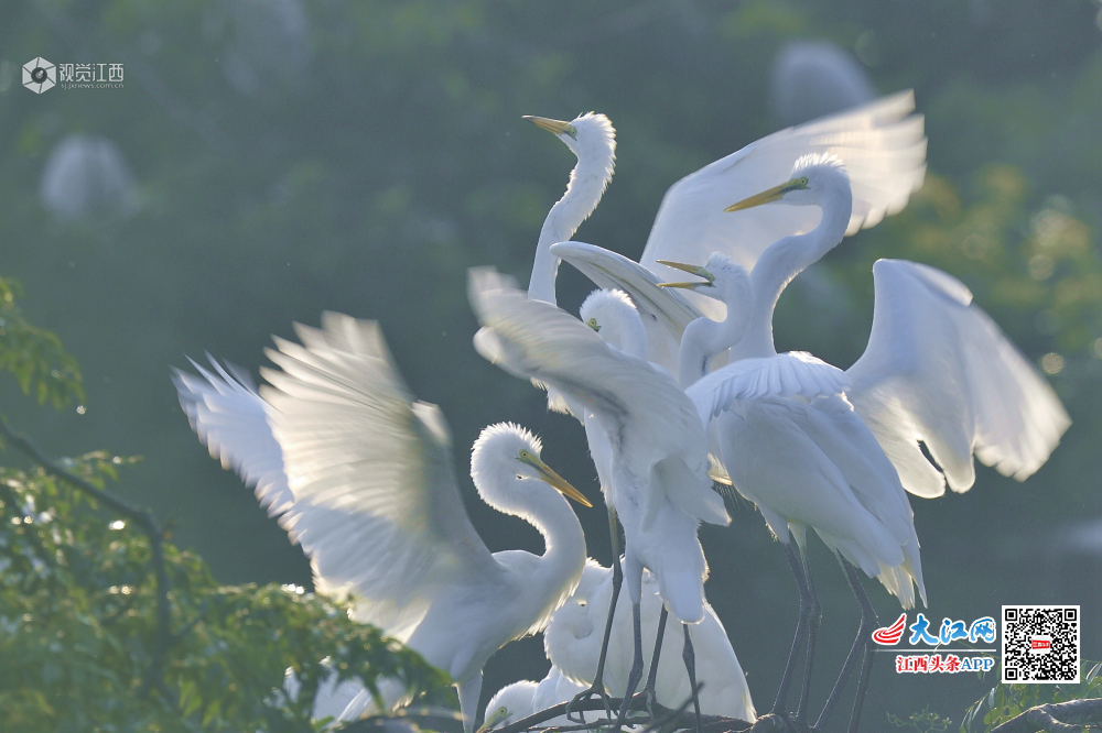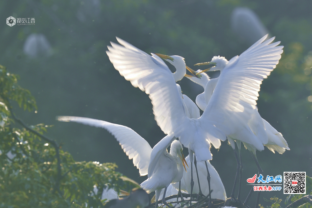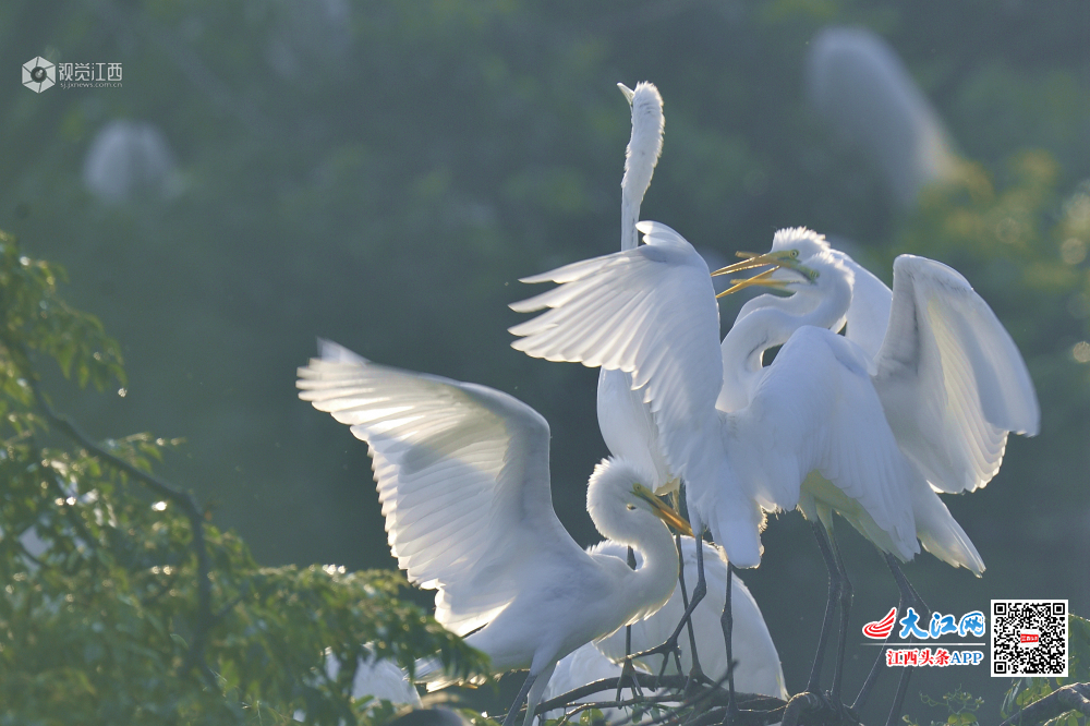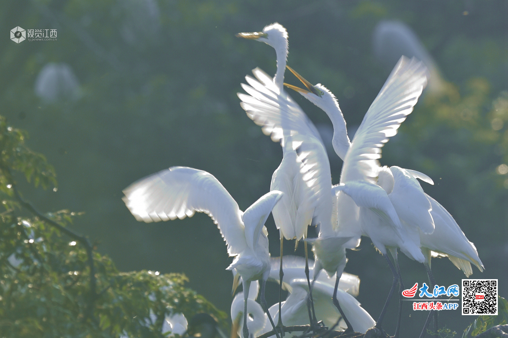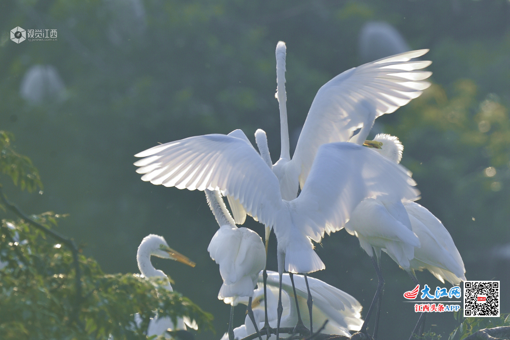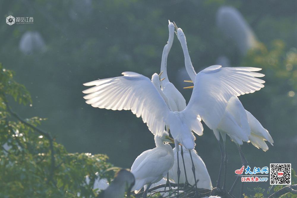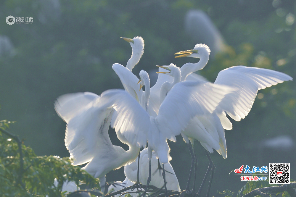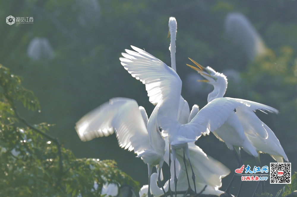 天香园的新生小白鹭长大了,围着妈妈争食。
