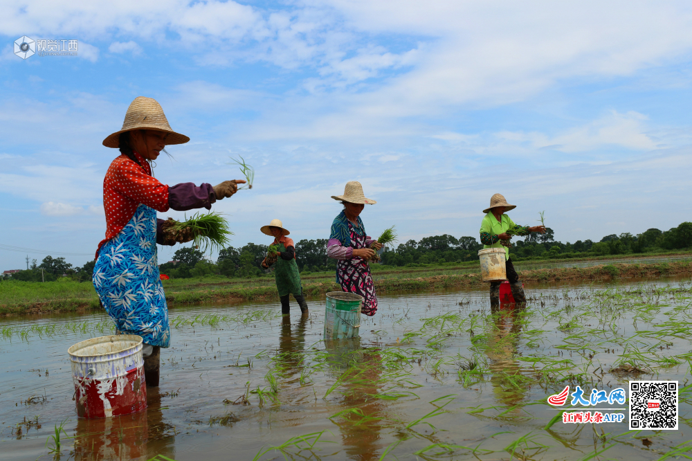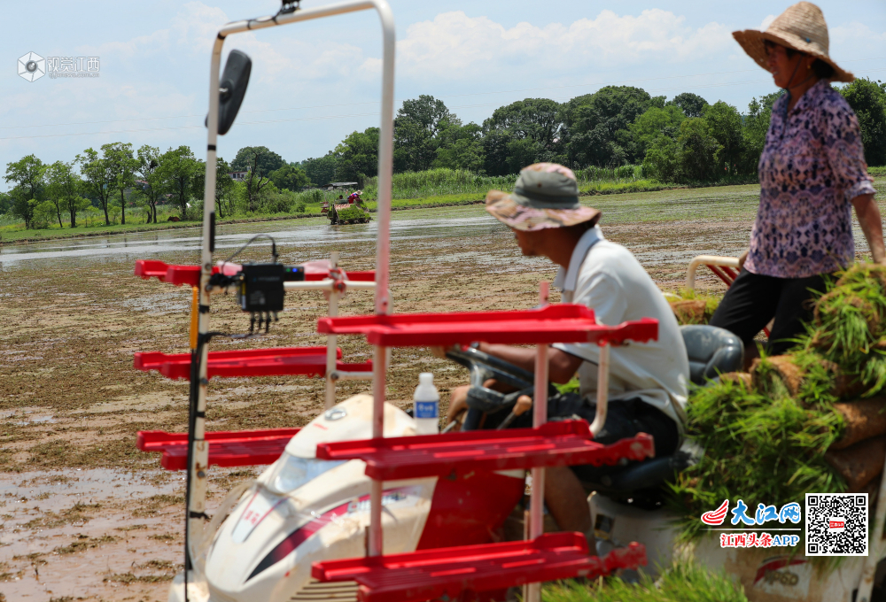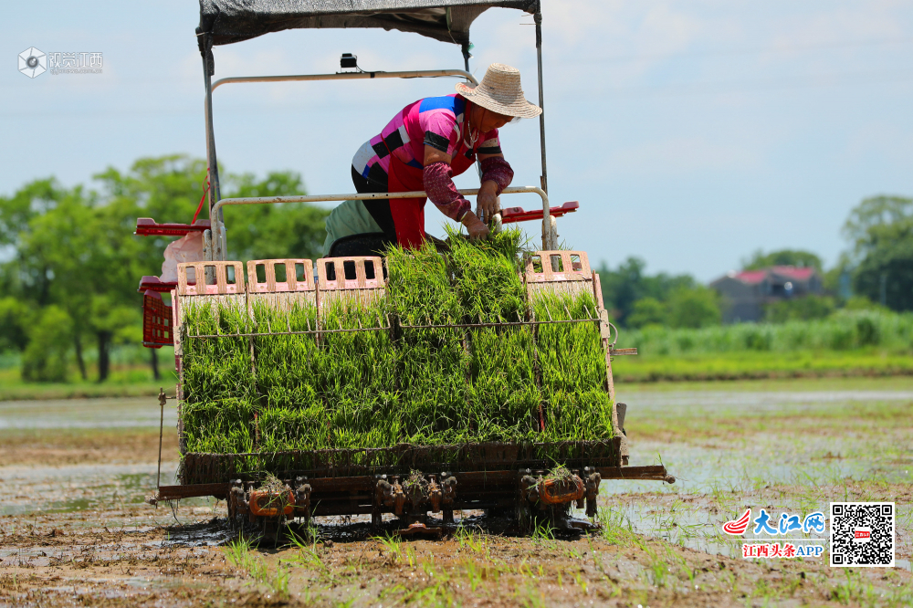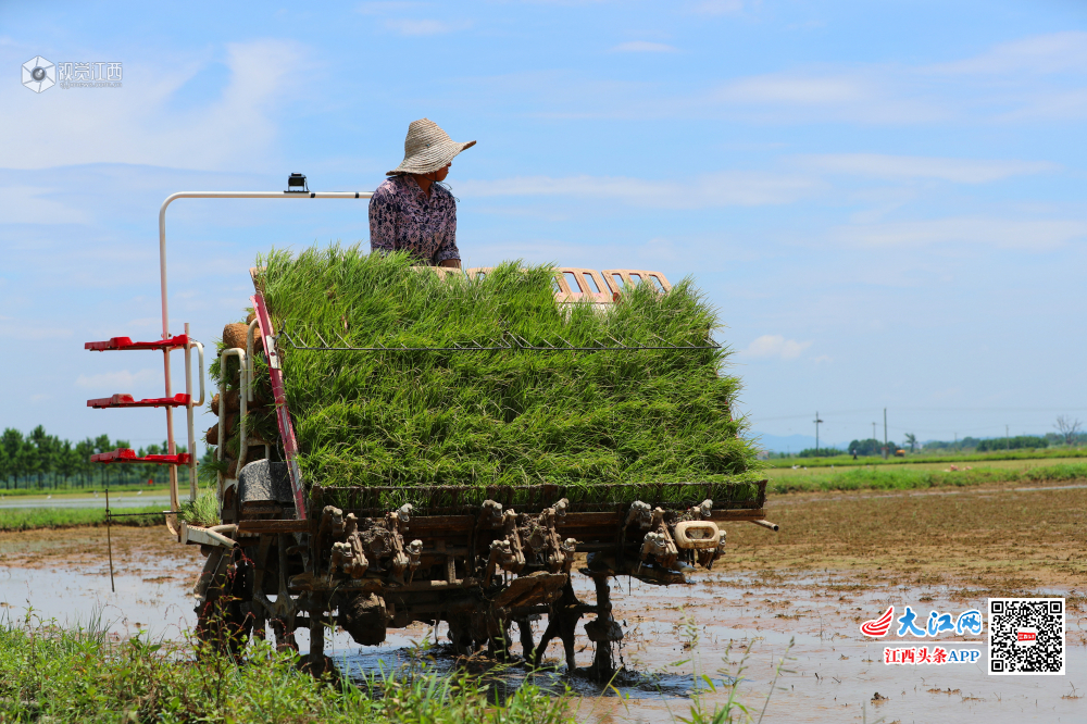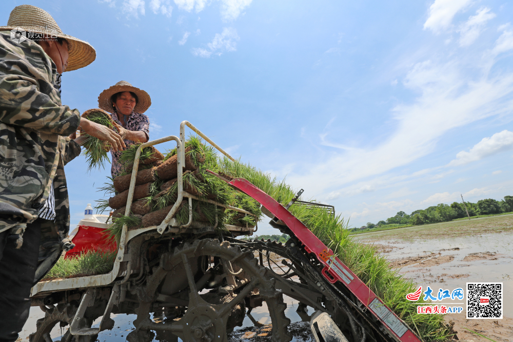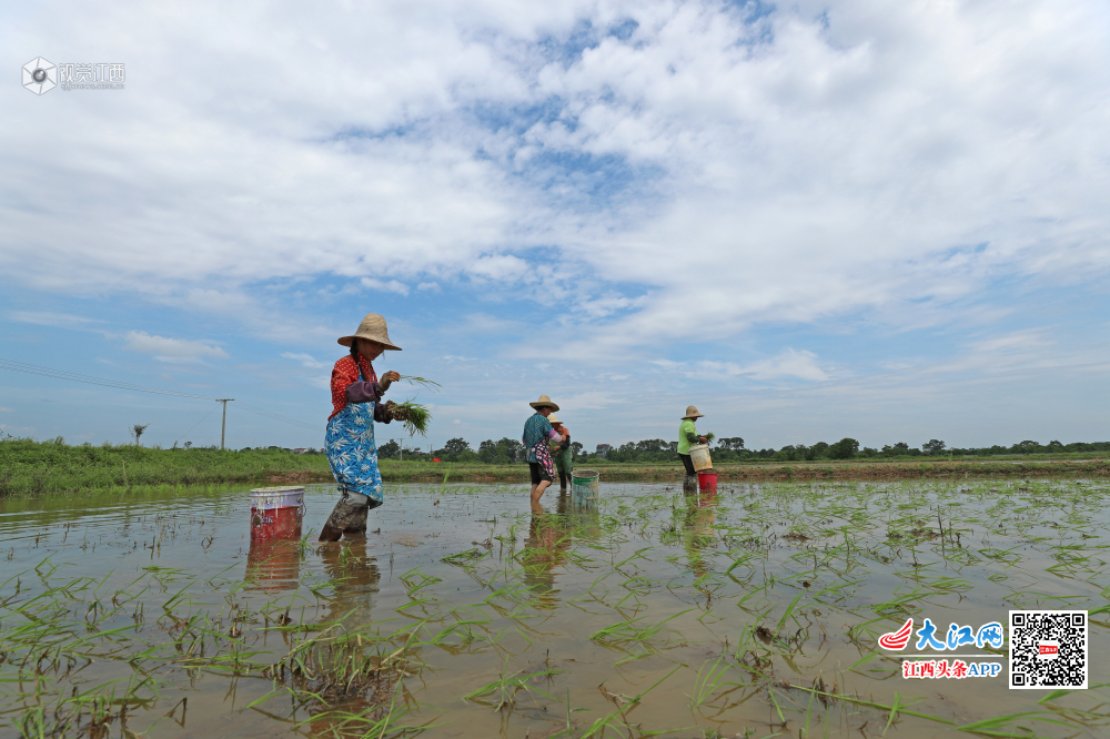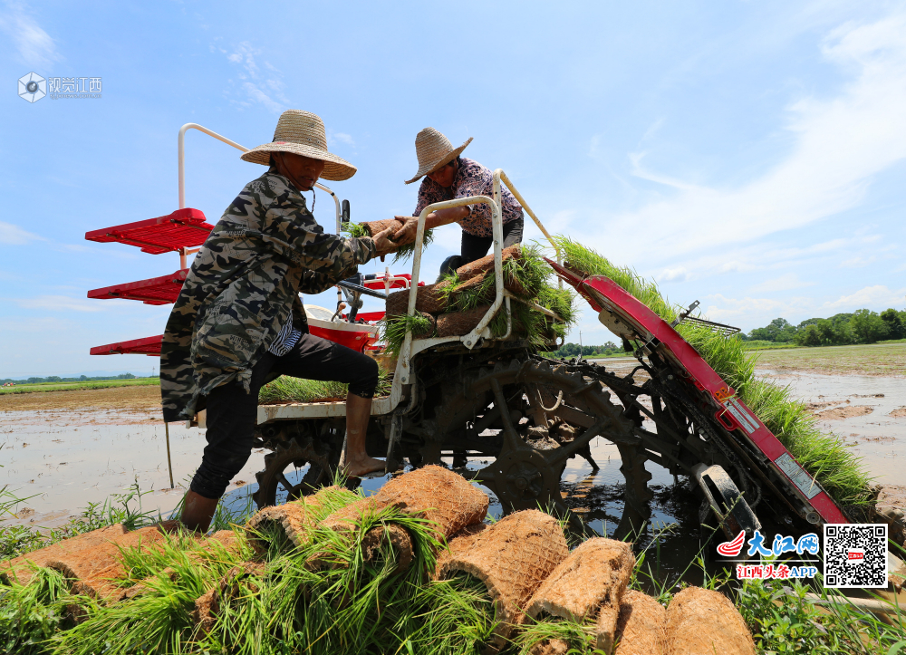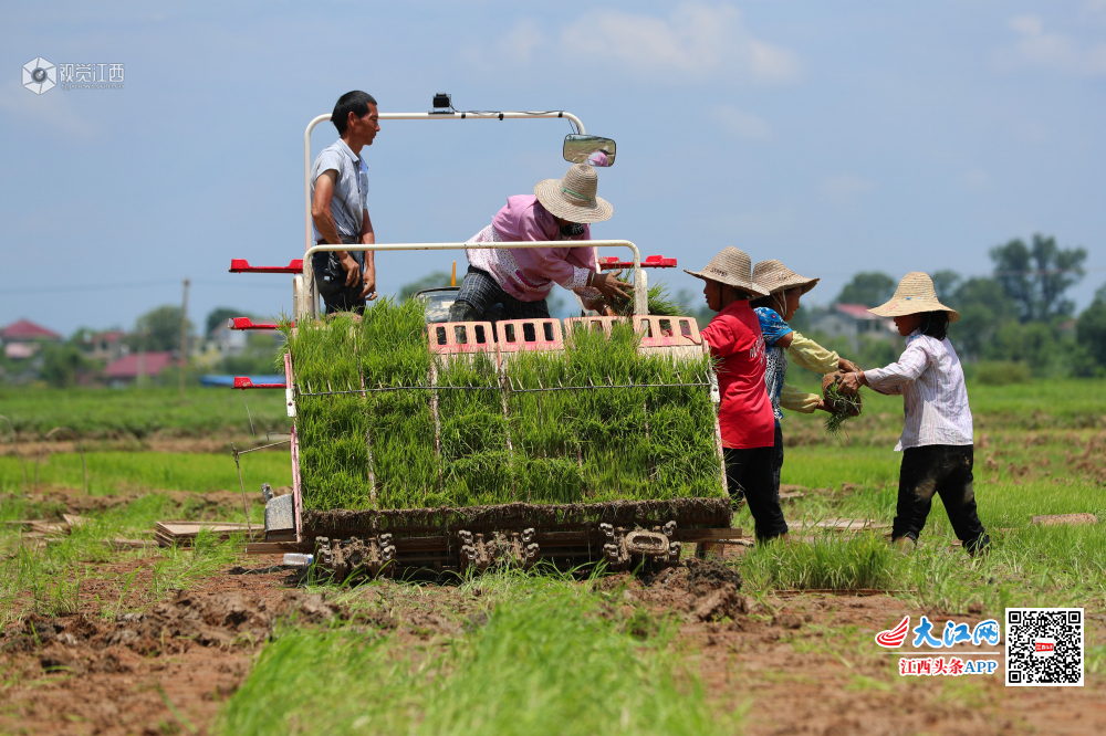 6月19日,在江西省吉安市泰和县沿溪镇仓岭村,农民抢抓农时栽插中稻,夏日田园一派繁忙景象。