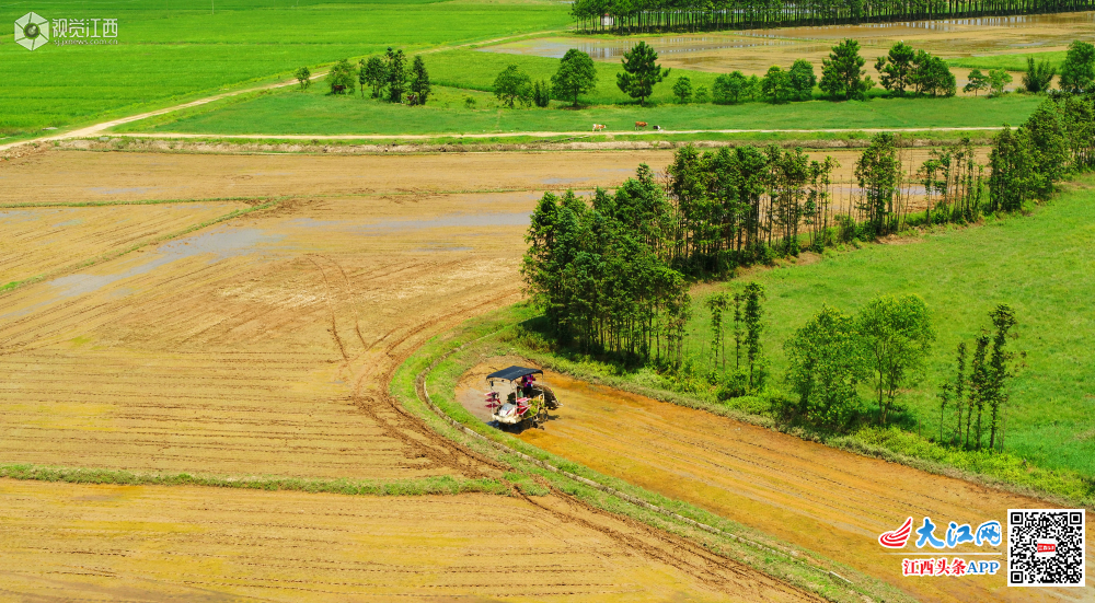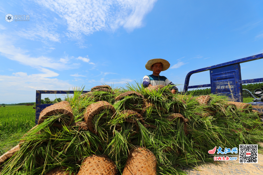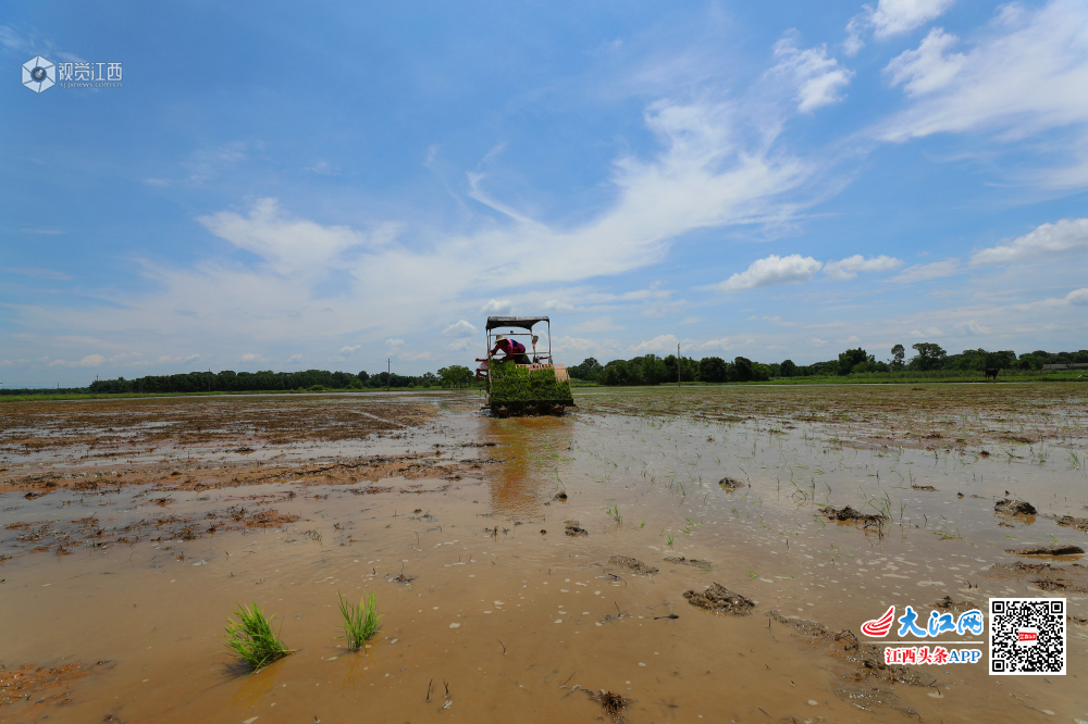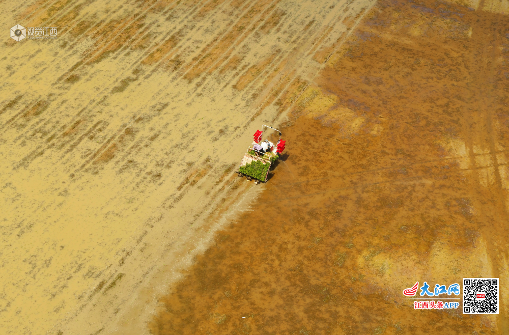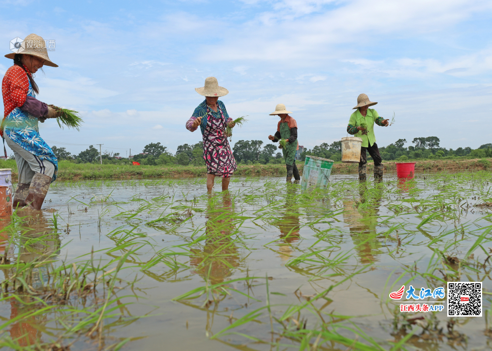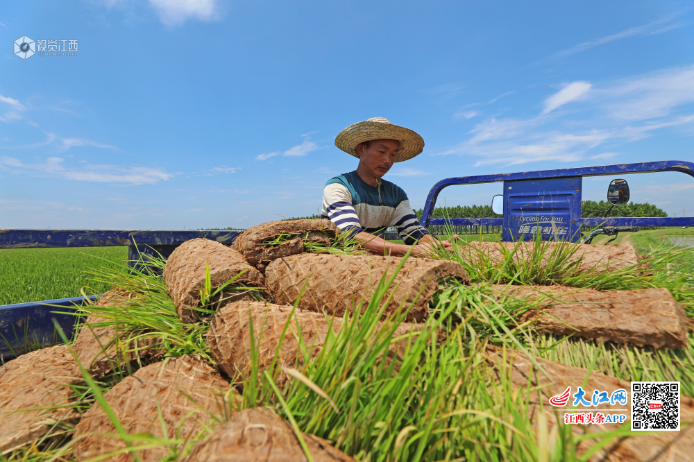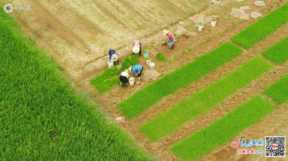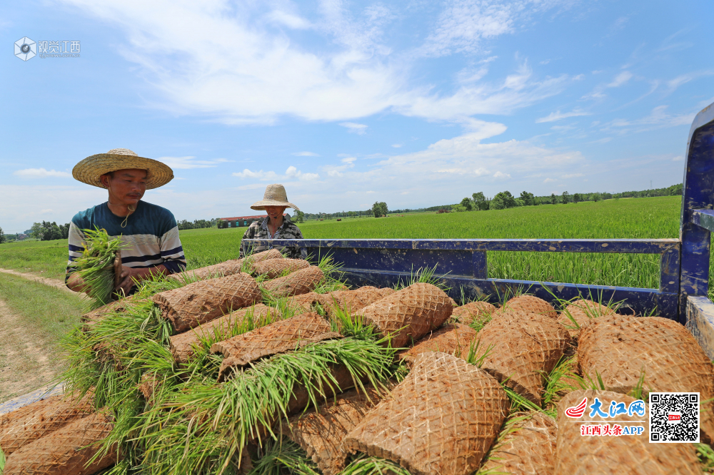 6月19日,在江西省吉安市泰和县沿溪镇仓岭村,农民抢抓农时栽插中稻,夏日田园一派繁忙景象。