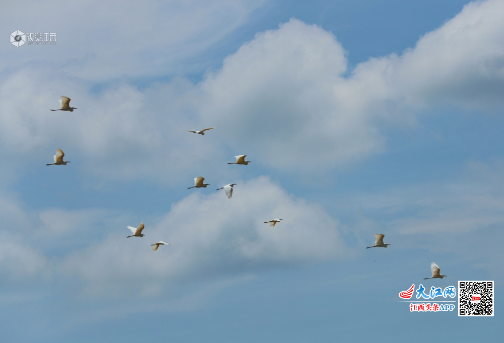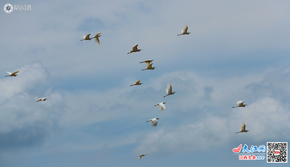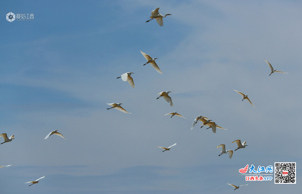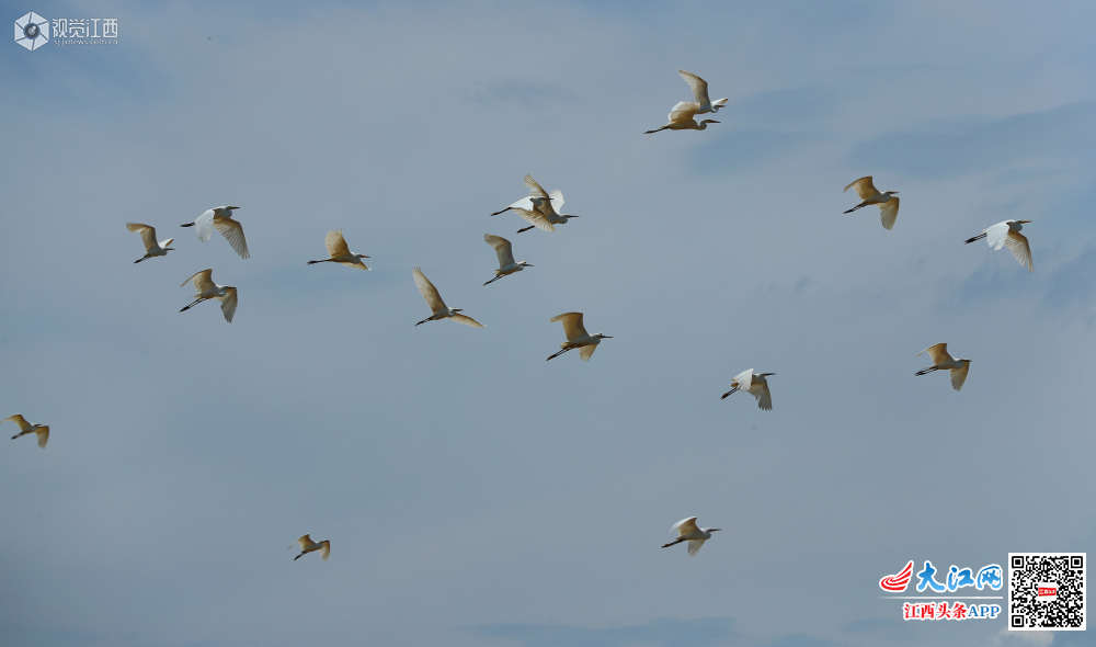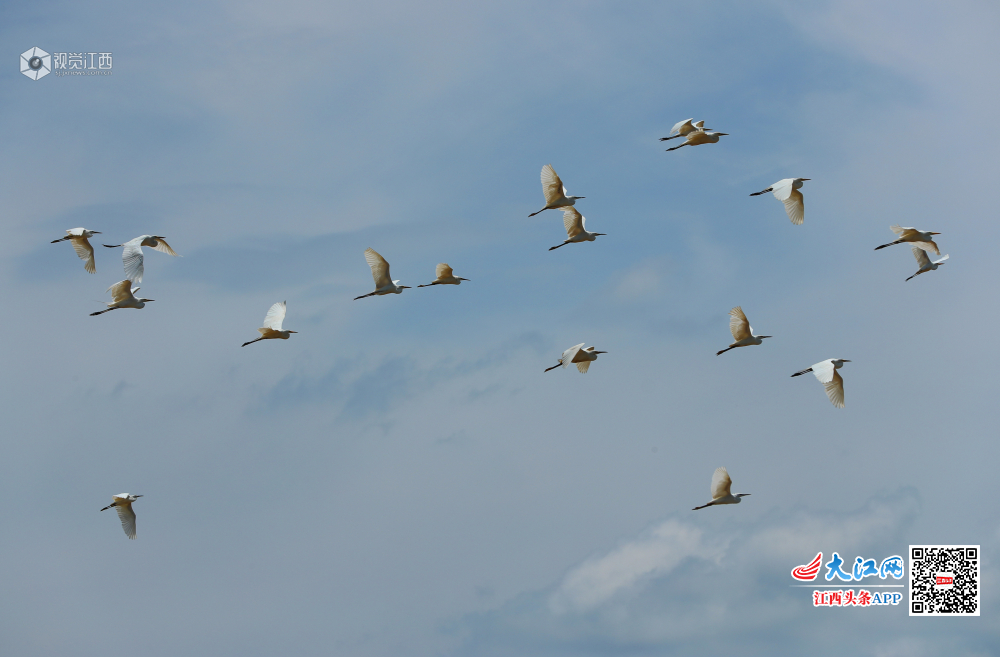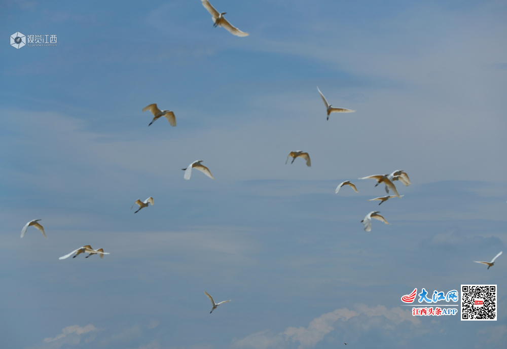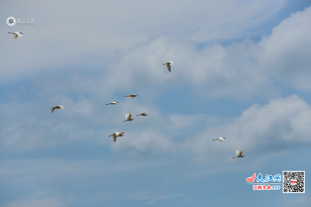 6月19日,江西省吉安市泰和县沿溪镇仓岭村的一片稻田上,一群白鹭或展翅飞翔,或行走在田间地头觅食,构成一幅夏日生态风景画。