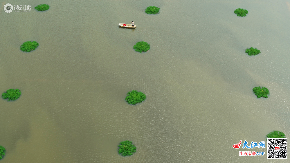 6月21日,在江西省吉安市泰和县沿溪镇仓岭村“草、鱼、虾”生态养殖基地,养殖人员在基地水面上劳作。水面上圆形的水草,排列有序、整齐划一,与水面上劳作的小船相映成趣,蔚为壮观,构成一幅夏日水上生态画卷。