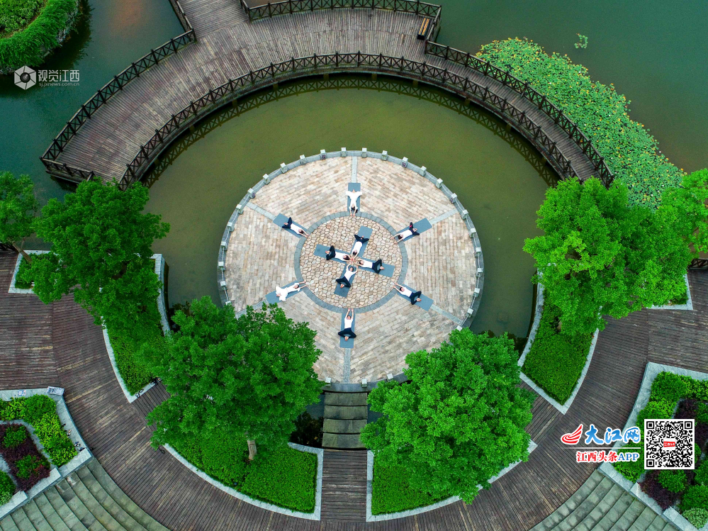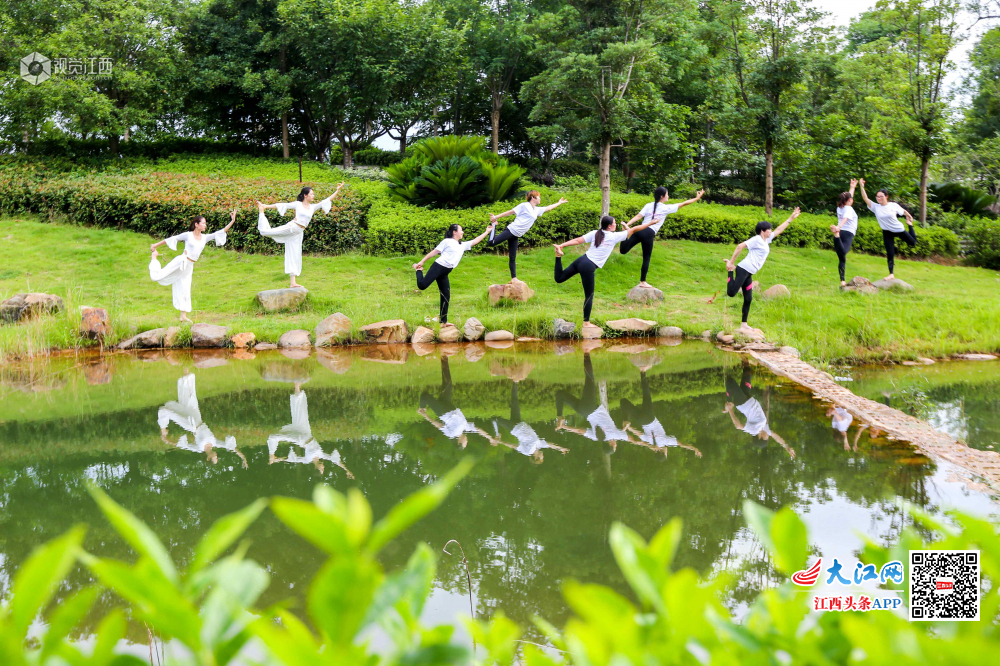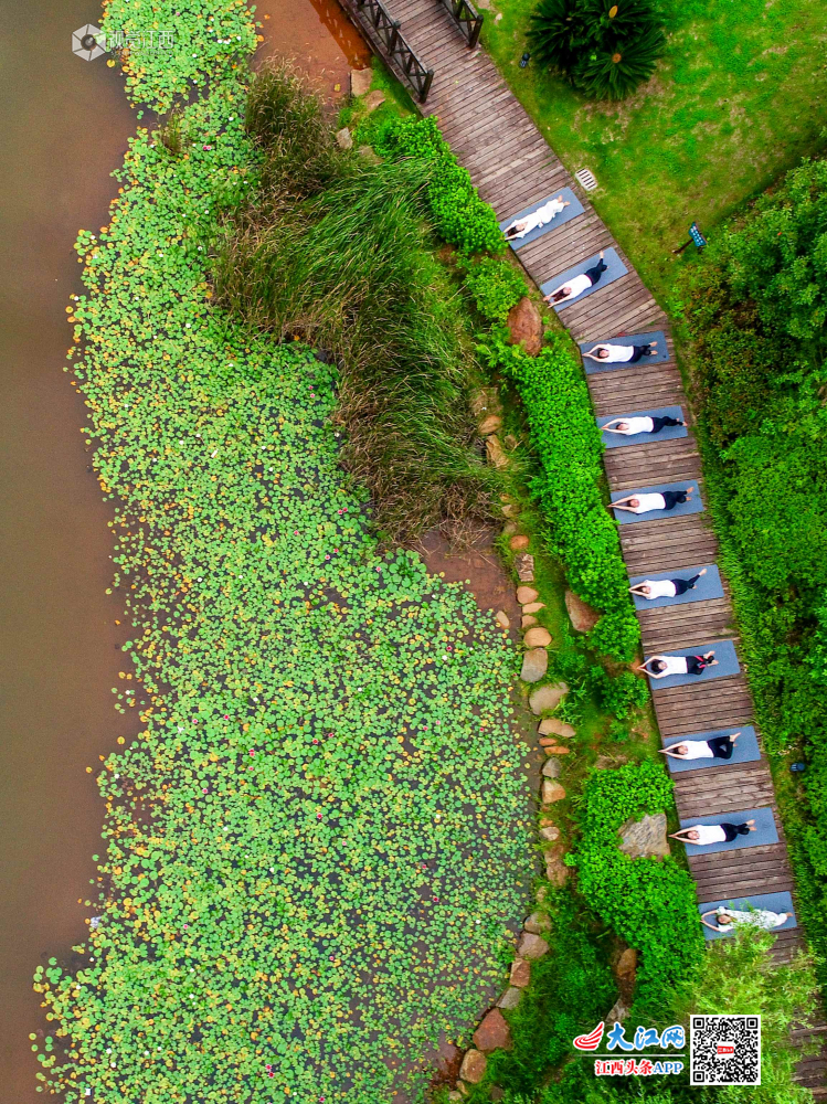 6月21日,瑜伽爱好者在峡江县锦绣湖湿地公园练习瑜伽。当日是国际瑜伽日,峡江县的瑜伽爱好者来到户外练习瑜伽,在夏日清晨舒展身心,畅享人与自然和谐之美。
