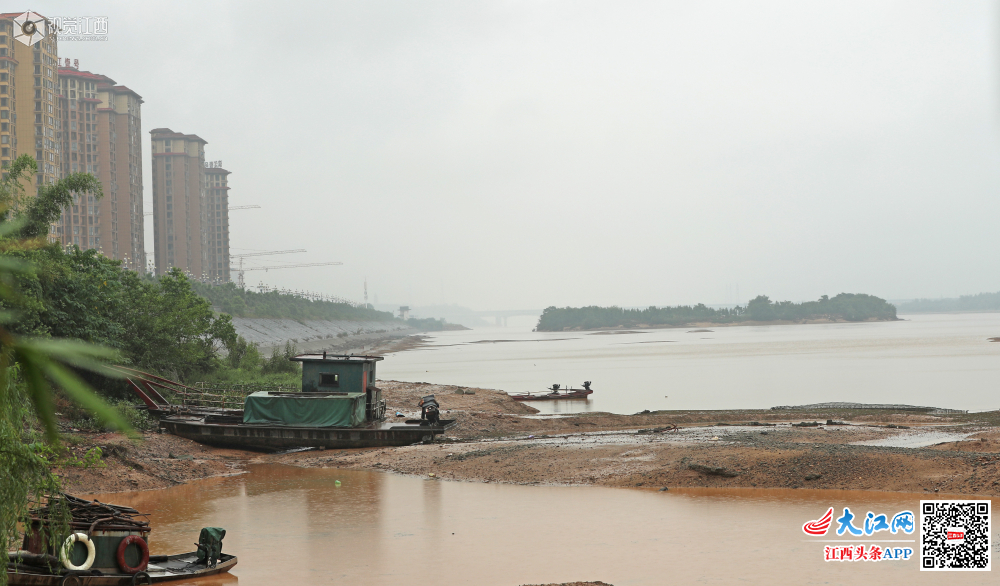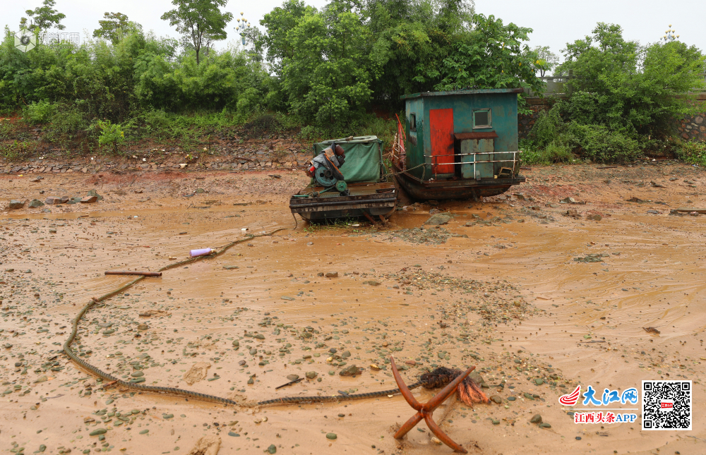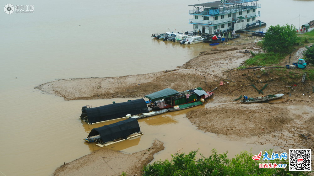 6月23日,在江西省吉安市泰和县赣江段,开闸放水腾库容后,船只搁浅在江边、河滩裸露水面,赣江在汛限水位以下运行,迎接即将到来的强降雨。