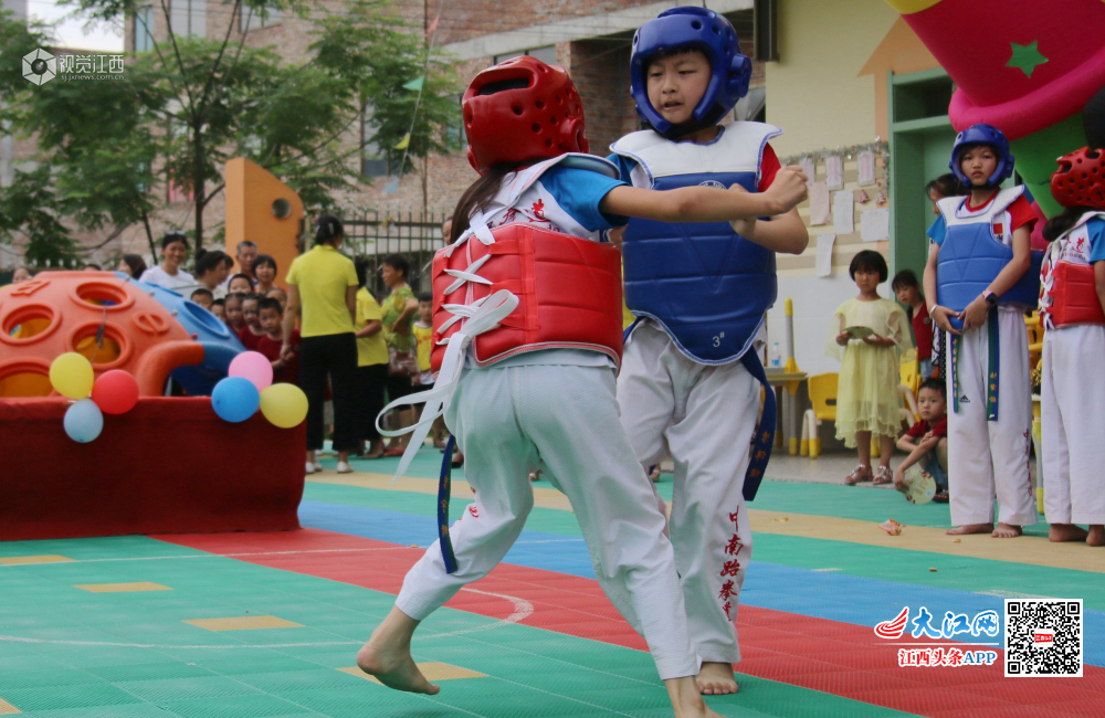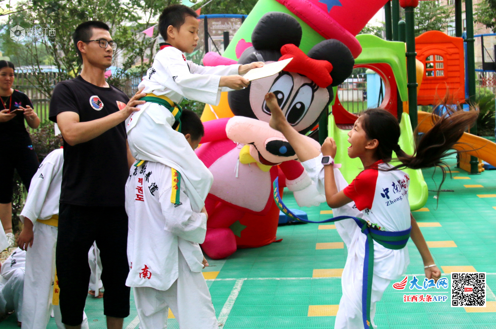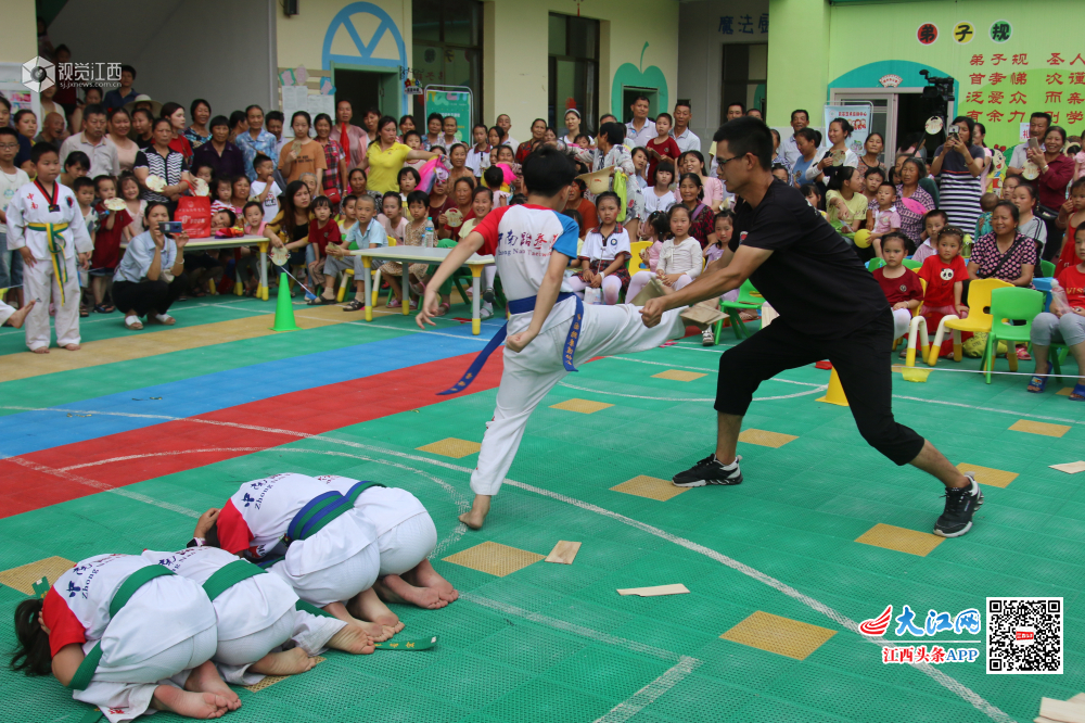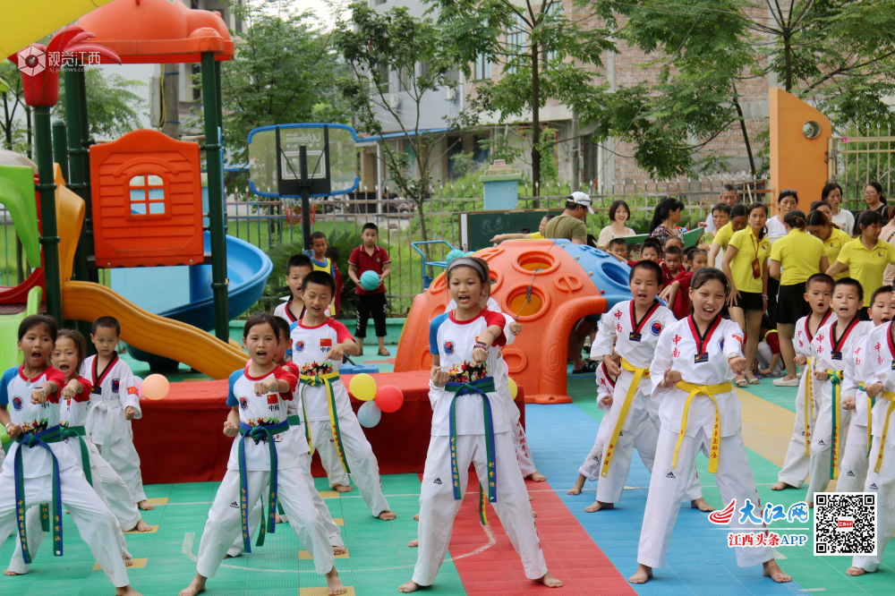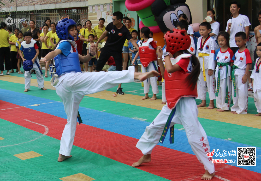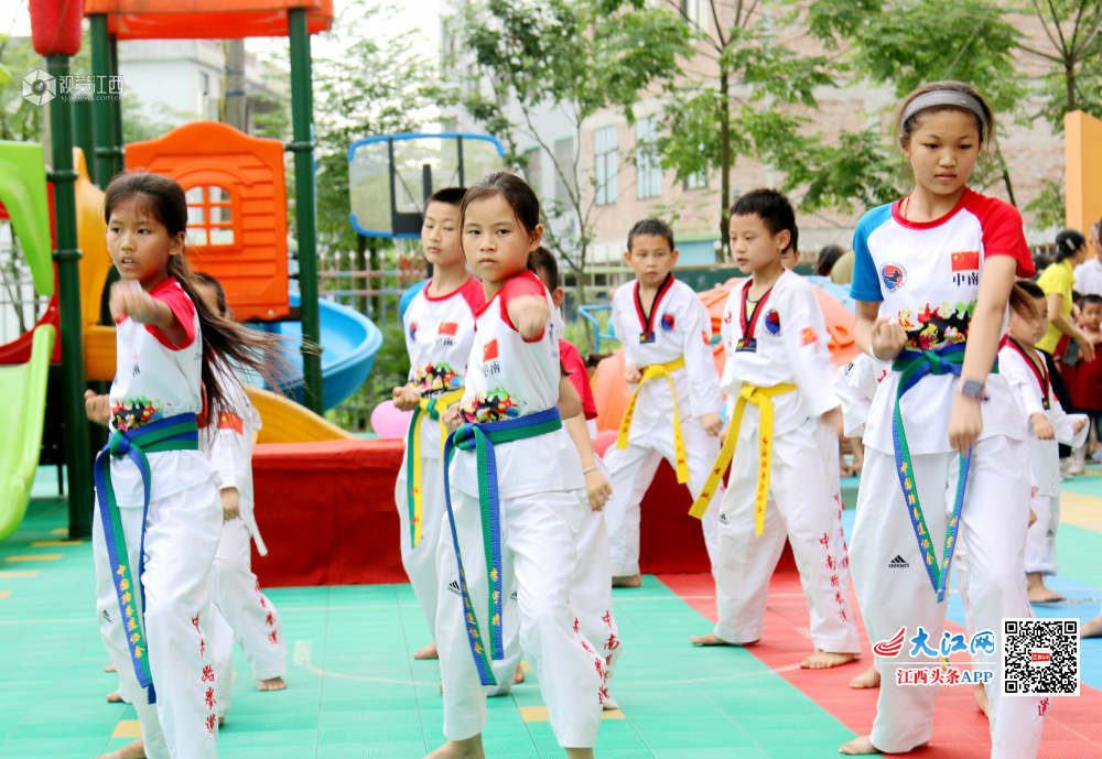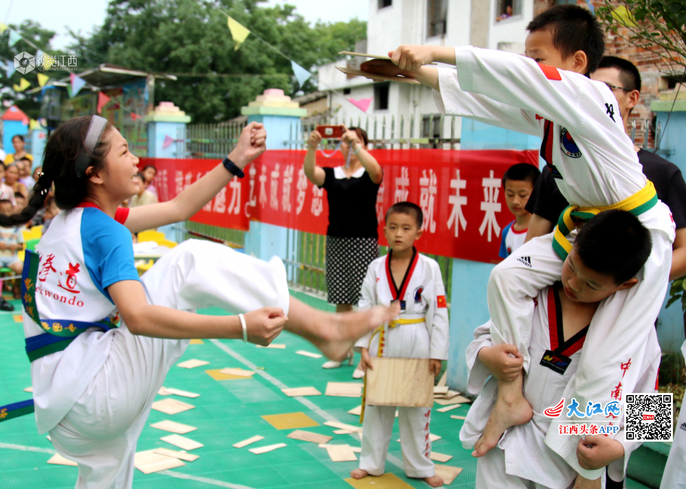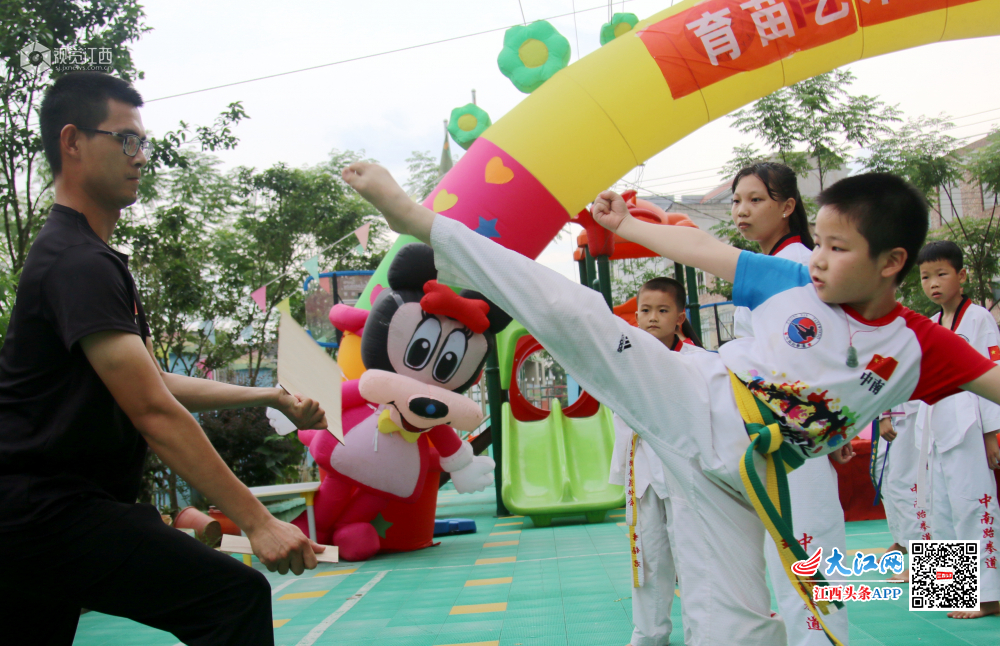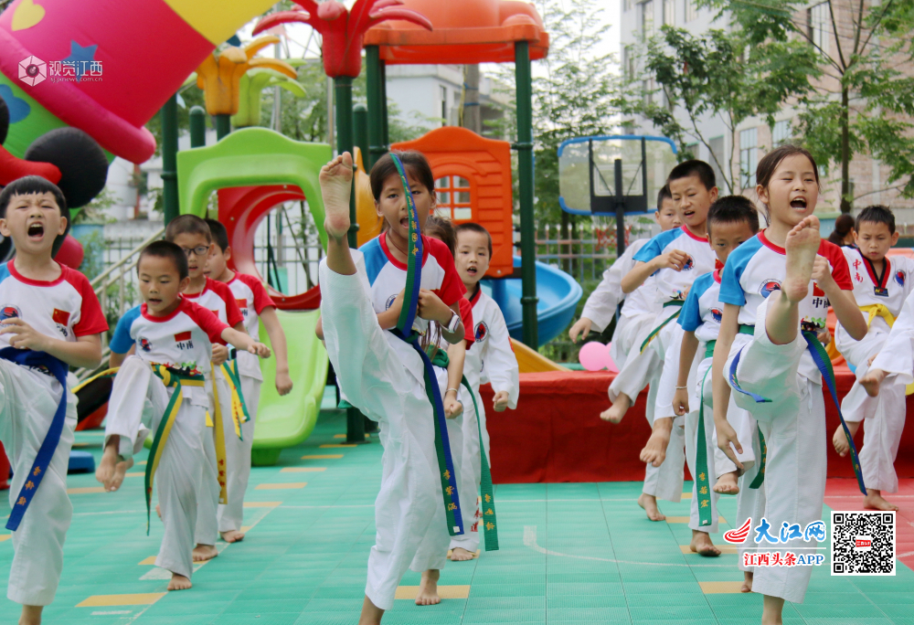 6月24日,江西省遂川县的萌孩子在表演跆拳道,气势惊人。敬礼、抬脚、踢腿、出拳……一招一式有板有眼,引得现场观众不断鼓掌叫好。
