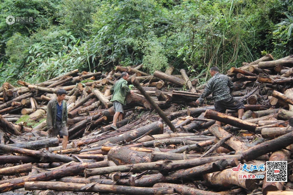受7月5日以来持续强降雨影响,山体滑坡、洪涝等对明月山林场造成不同程度的破坏,致林区公路多处受淹。林场干部职工第一时间赶到现场进行处置,并帮助当地政府转移群众,安排专人进行后续的救灾处理。洪水冲垮了林区道路,冲毁了林木,冲散了成堆的原木,据初步统计,今年水灾致该场损失在220万元左右。图为7月10日,明月山林场雇请民工对受损林区进行清理。