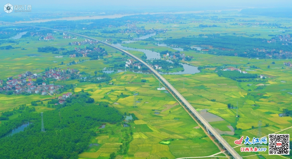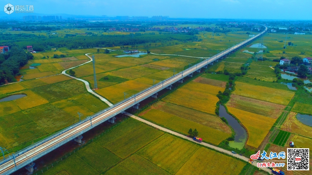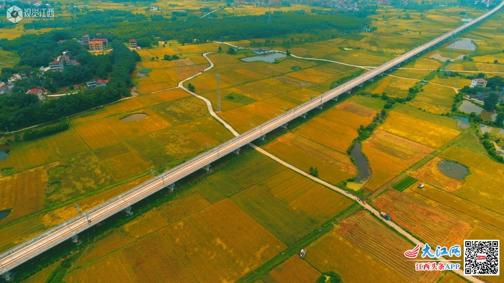 7月11日,在江西省吉安市泰和县塘洲镇龙口村,昌赣高铁犹如一条白色巨龙,穿越一望无际的稻田,与村庄相映成趣,构成一幅夏日田园风景如画。