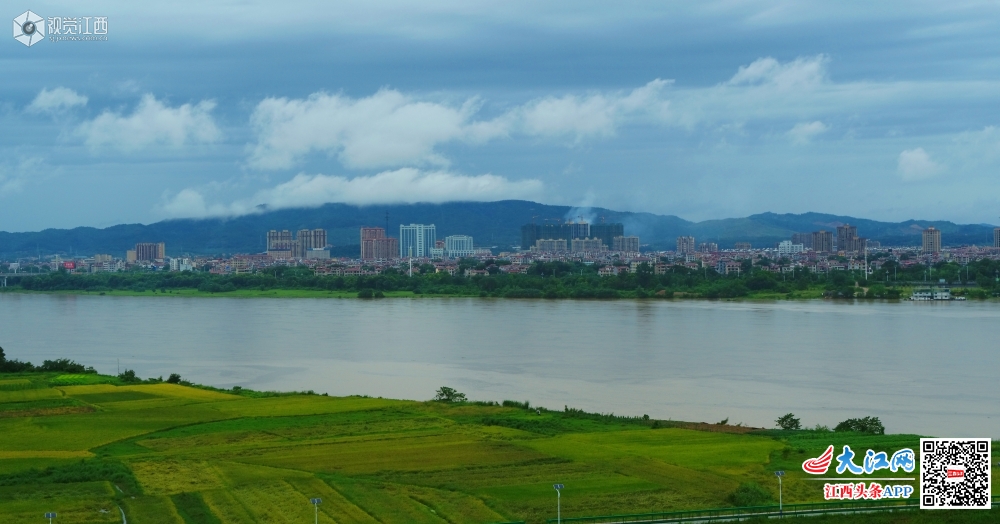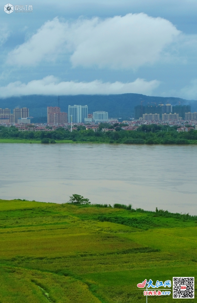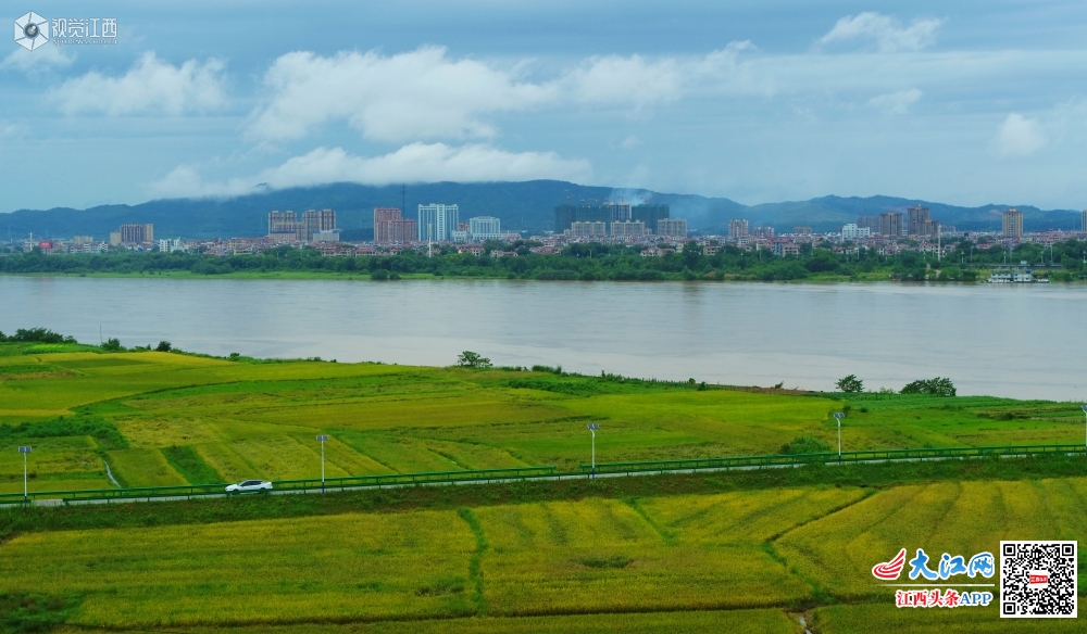 7月13日,航拍雨后的江西省吉安市泰和县城一角,云雾缥缈的远山,平整泛黄的稻田,静静流淌的赣江,鳞次栉比的建筑,相映成趣,构成一幅美不胜收的夏日山水风景画。