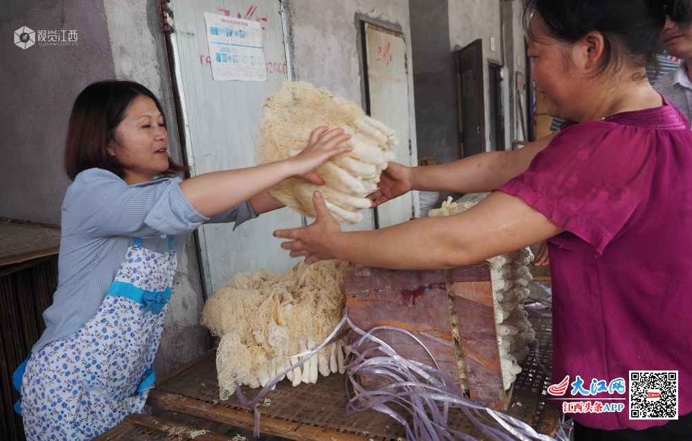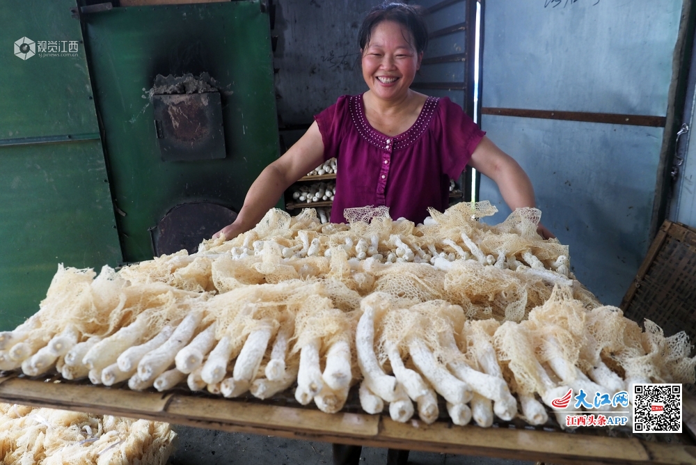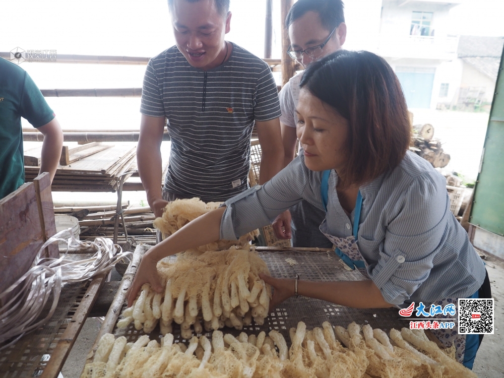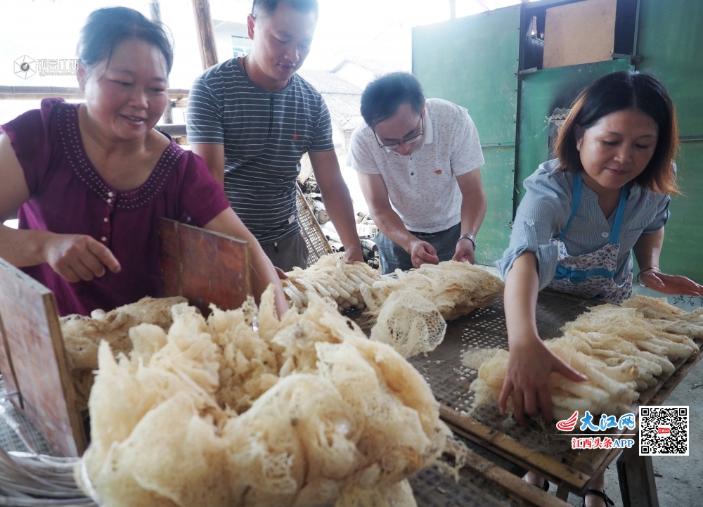 2019年7月16日,江西省南丰县紫霄镇明阳村驻村扶贫干部正在竹荪菇基地帮助农户烘干刚采摘的竹荪菇。今年,紫霄镇大力发展竹荪菇、茶树菇、白莲、冷水茭白等特色农产品带动贫困户通过土地流转、劳力务工和入股分红等方式脱贫致富,效果显著。
