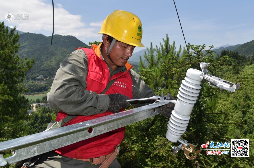 2019年7月18日,国家电网江西电力(遂川)员工冒高温在遂川县汤湖镇安村水库紧急抢修更换受损的10千伏线路高压低落保险,及时排除用电故障。