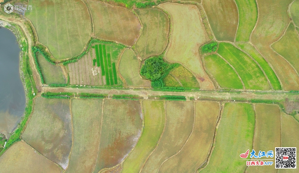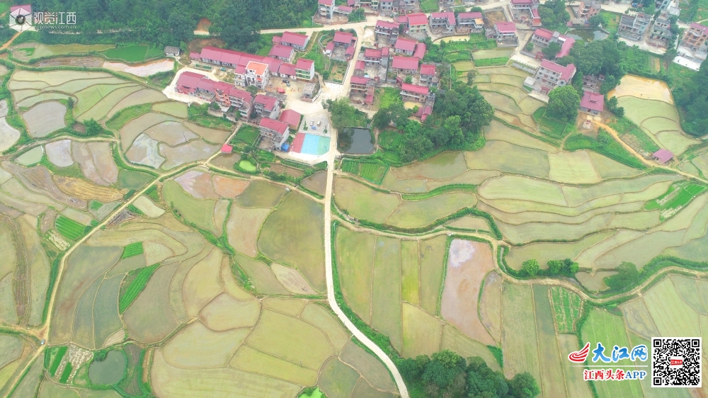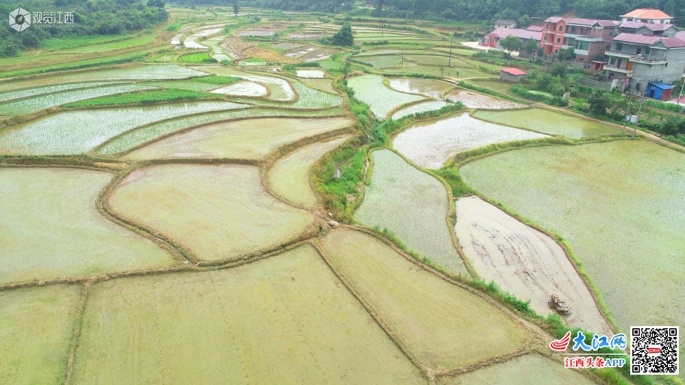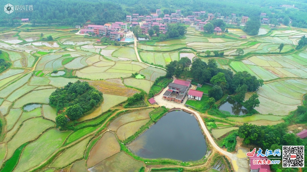 7月20日,在江西省吉安市泰和县冠朝镇小径村,形状各异的稻田与村庄相映成趣,构成一幅美轮美奂的夏日田园风景画。