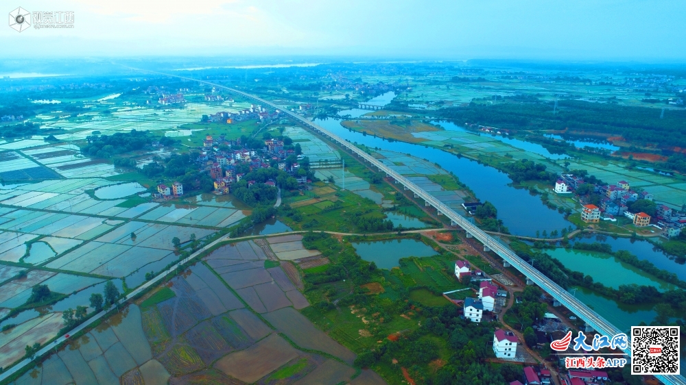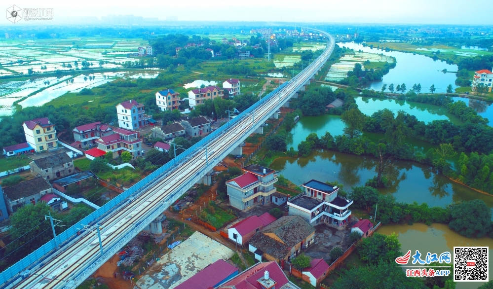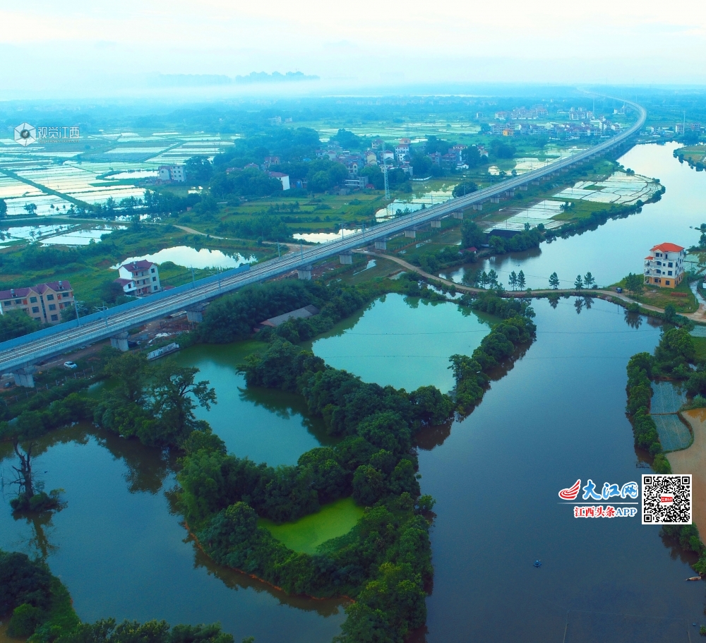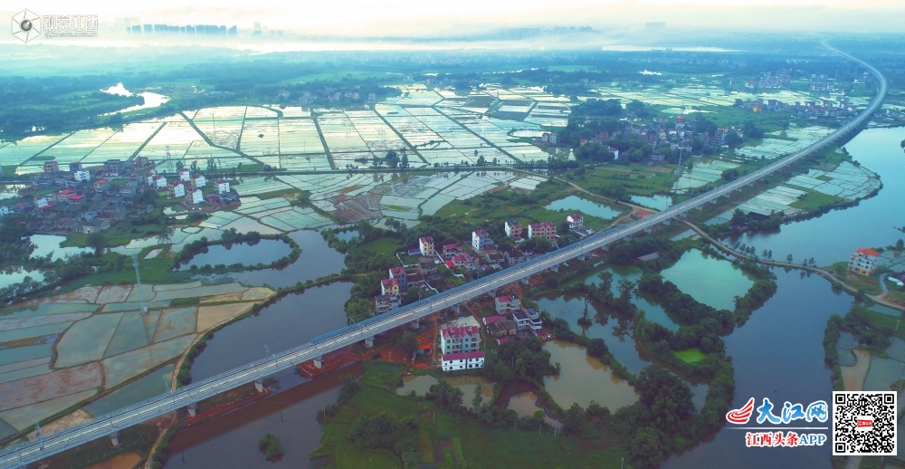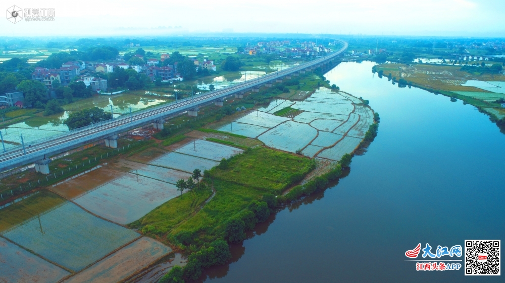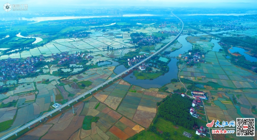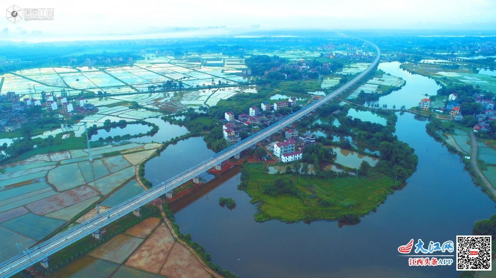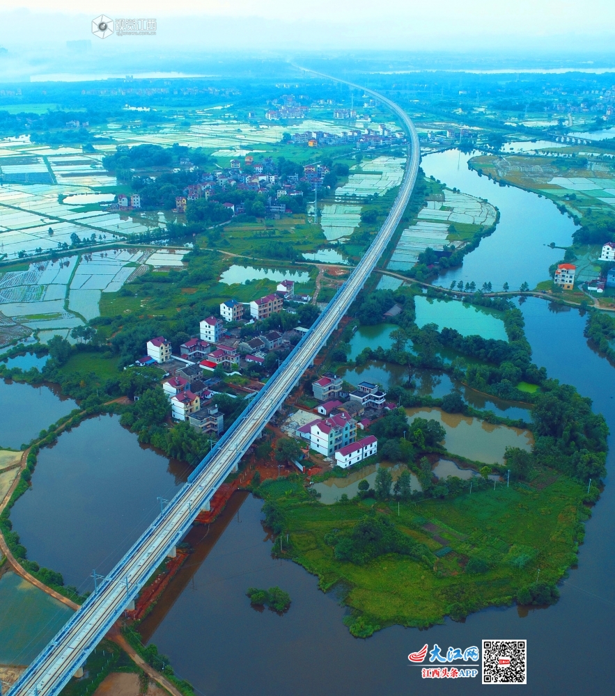 7月21日,航拍位于江西省吉安市泰和县塘洲镇境内的昌赣高铁泰和赣江特大桥,无人机空中俯瞰,犹如一条白色长龙,蜿蜒而过,穿越一望无际的稻田,与村庄相映成趣,如诗如画,蔚为壮观,构成一幅美不胜收的夏日田园风景画。