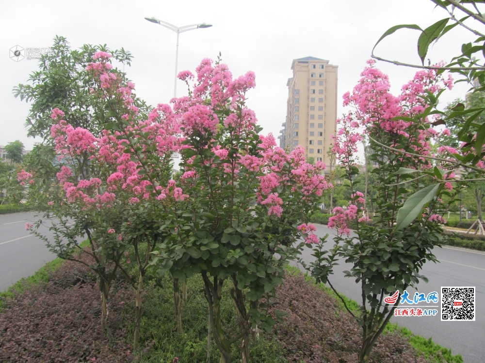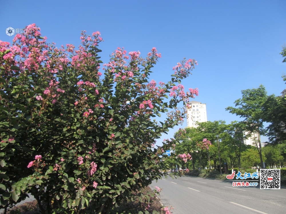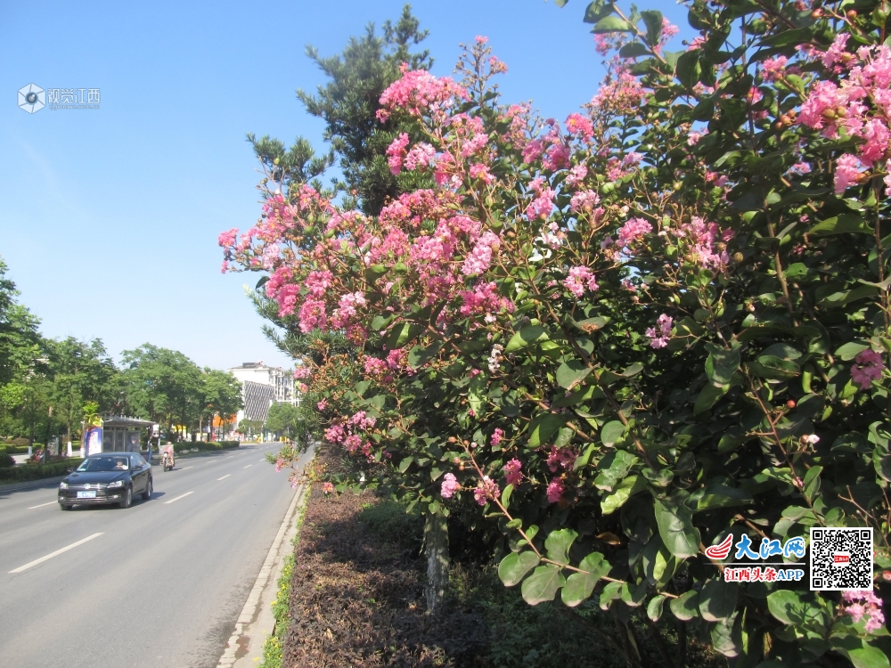 7月29日,中伏时节,在江西省安福县泸水河大道、省道吉福、安莲等道路两旁的紫薇花竞相开放,为城乡增色添景。