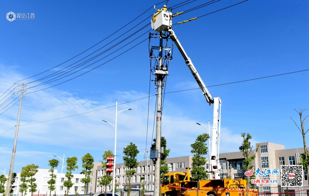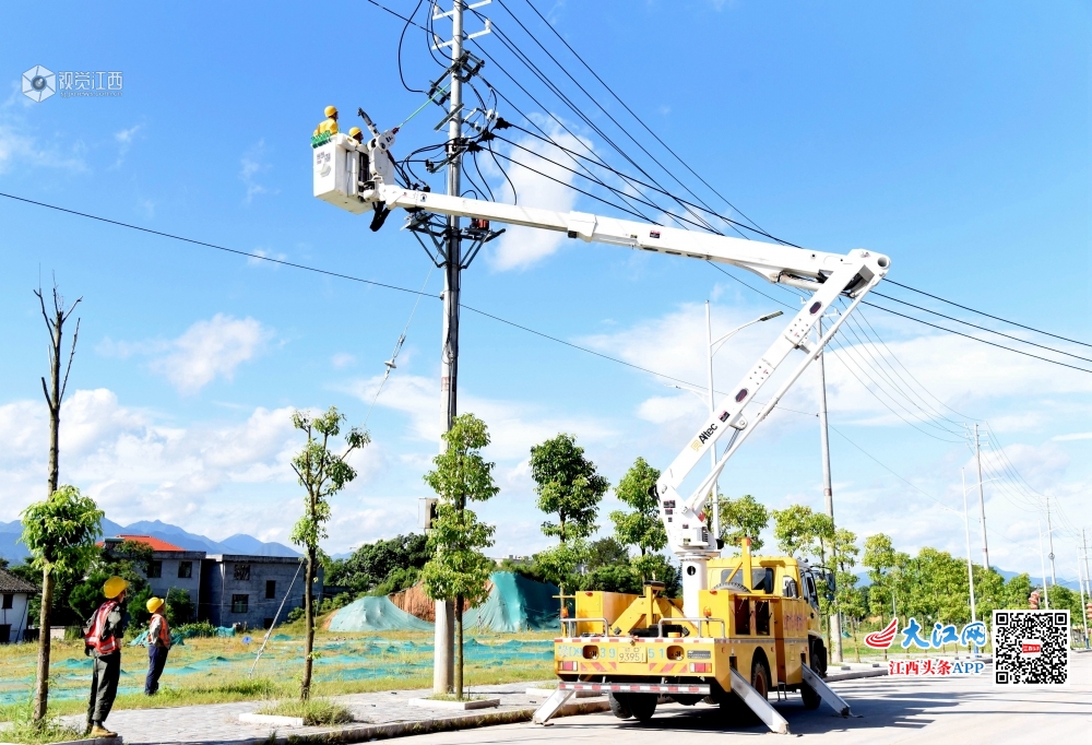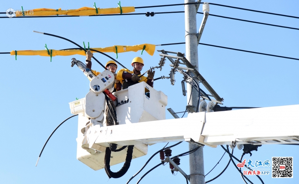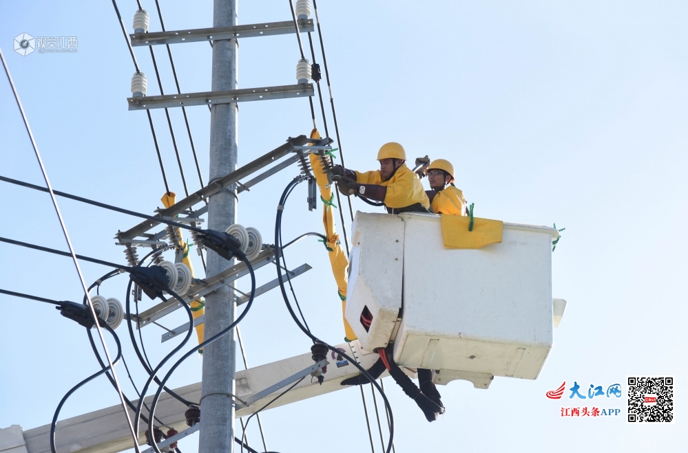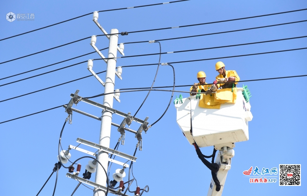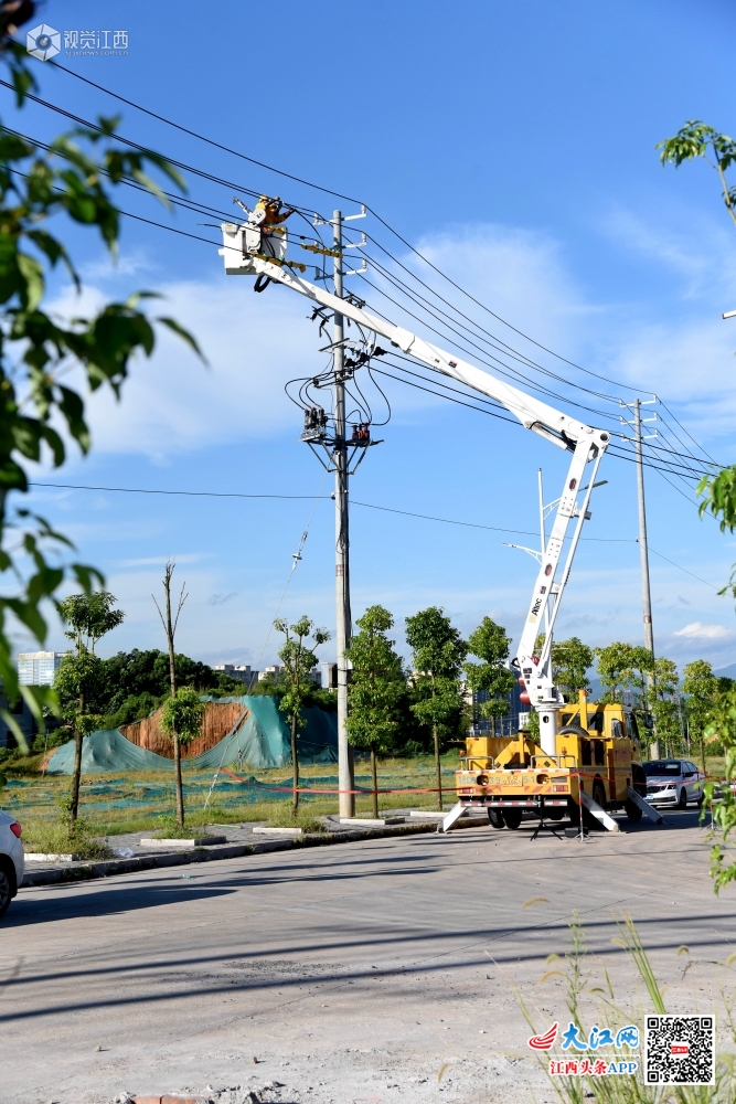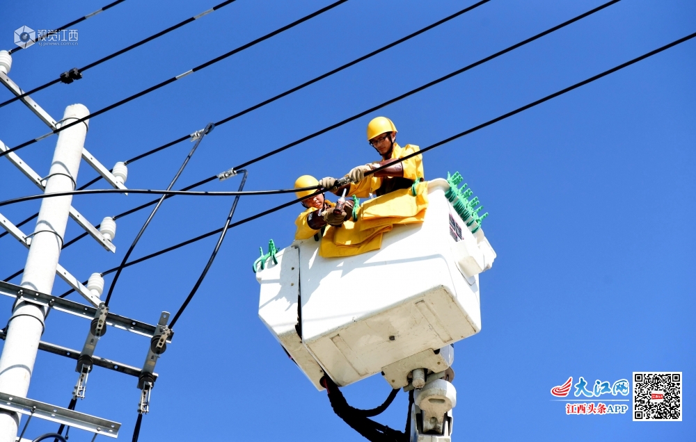 2019年7月31日,江西遂川县供电公司“电路医生”技术人员冒着高温、穿戴厚重的绝缘装,为一企业进行带电搭接电源服务,确保企业生产正常用电。