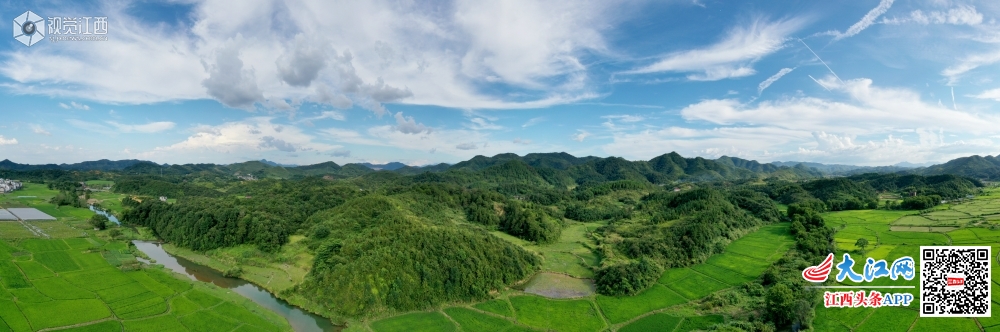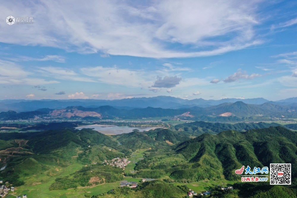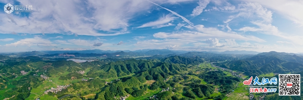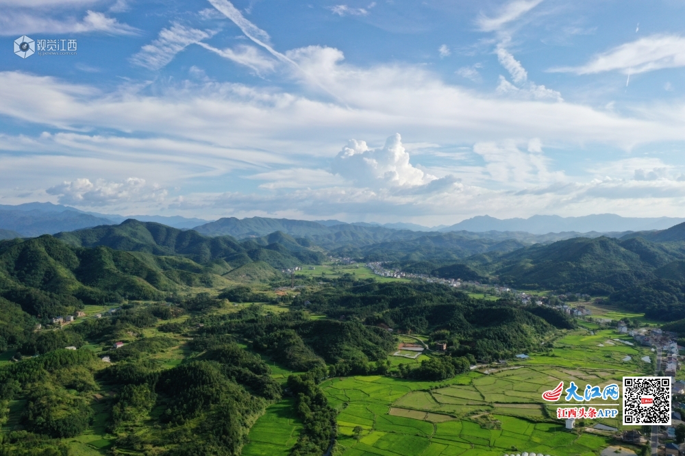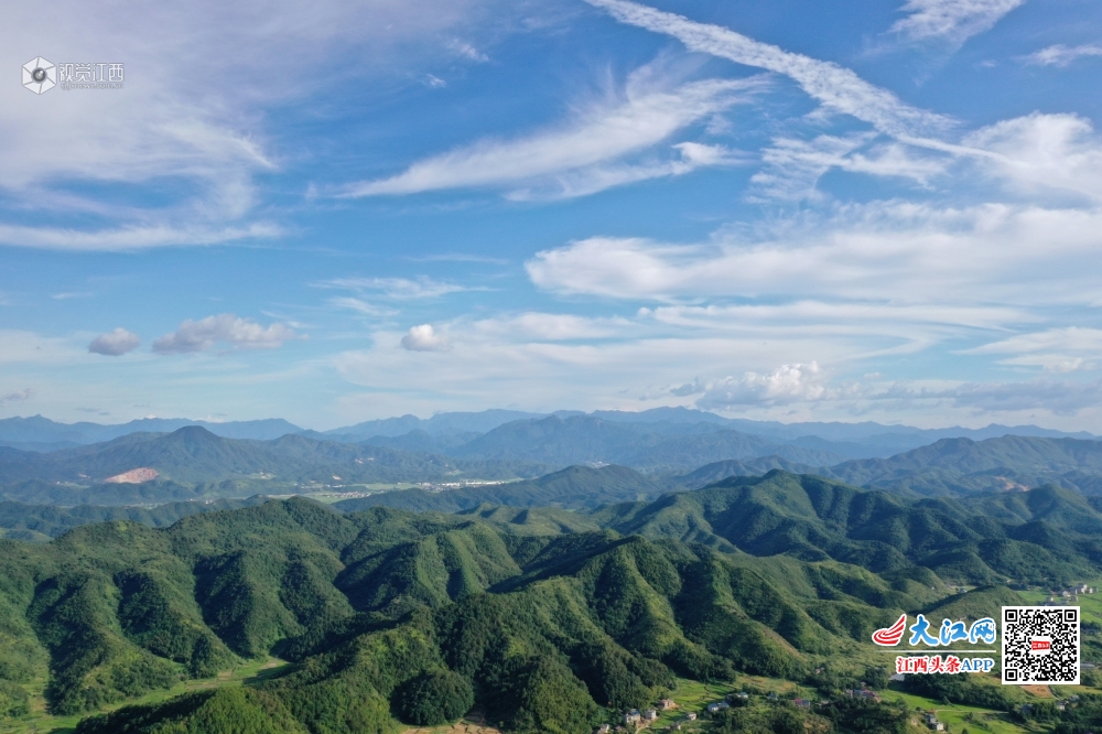 2019年8月2日,航拍江西省上饶市铅山县虹桥乡,云朵飘在湛蓝的天空上,与山峦形成一幅美丽画卷。