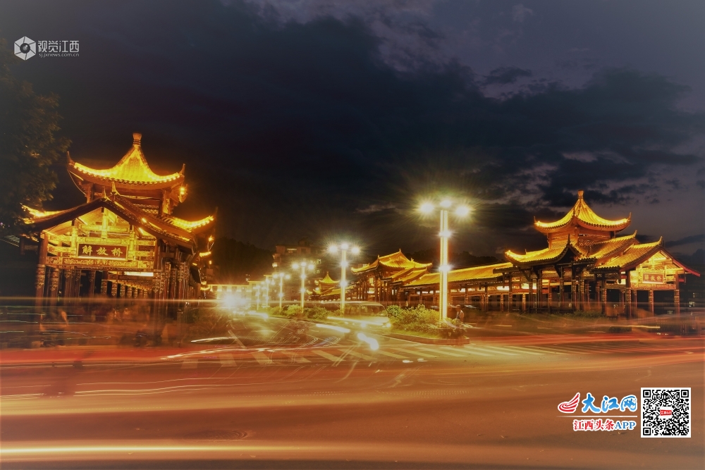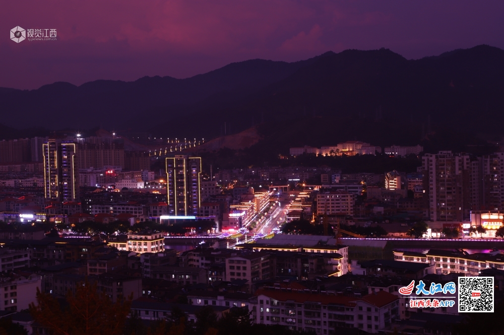 华灯初上的全南县城,身披彩衣、光带缭绕、交相辉映、车水马龙,精致小城的迷人夜晚由此开始。高台瞭望,笼罩在紫霞中的小城楚楚动人,繁星点点、万家灯火,一份温馨舒适的幸福感油然而生。