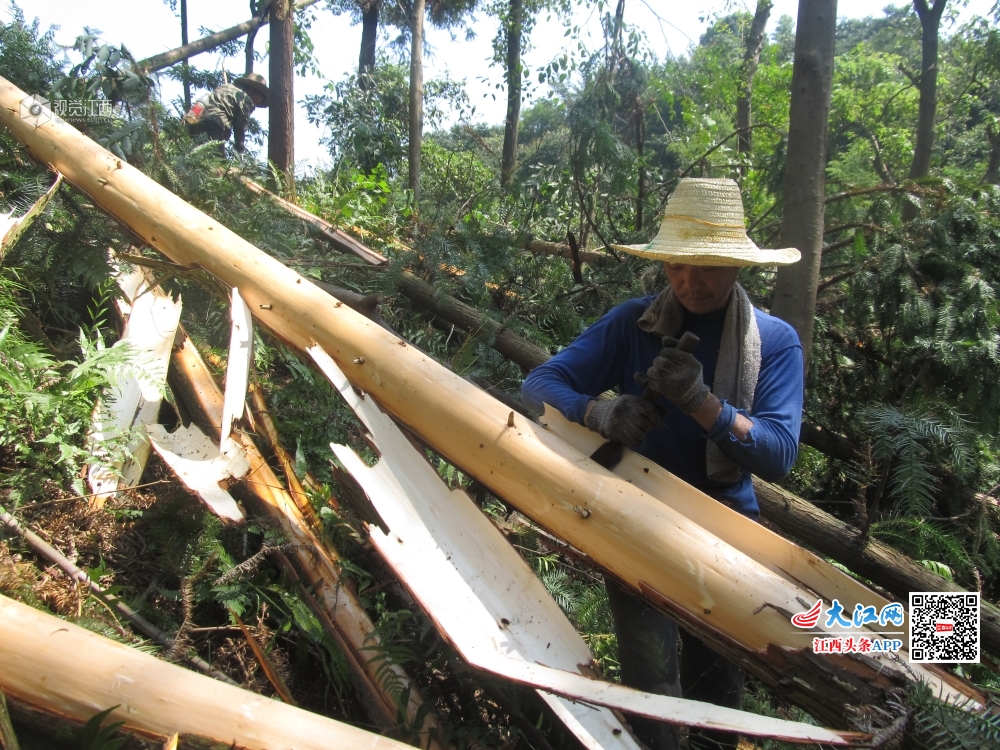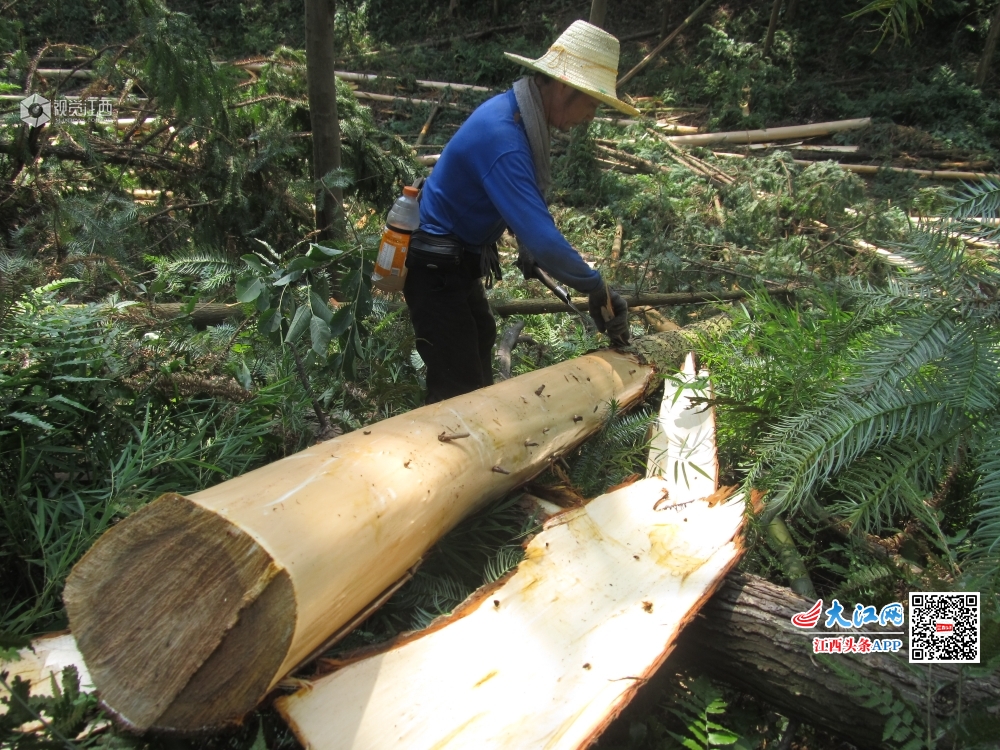 8月23日,在安福县北华山林场城门拍卖山场,民工正在对拍卖山场的红心杉木,进行刮皮加工销往外地。