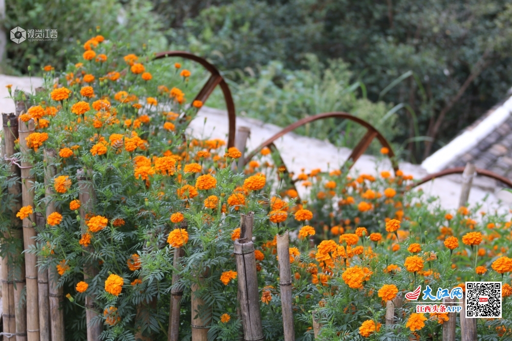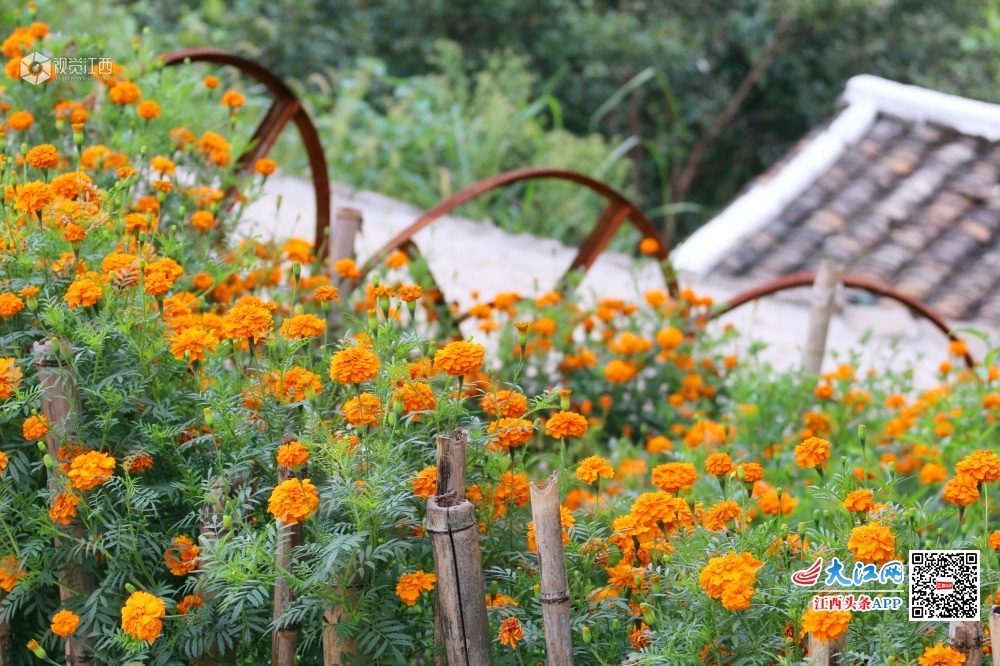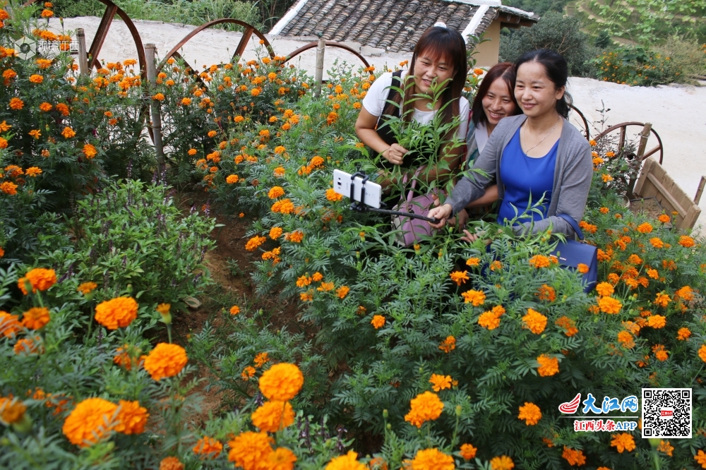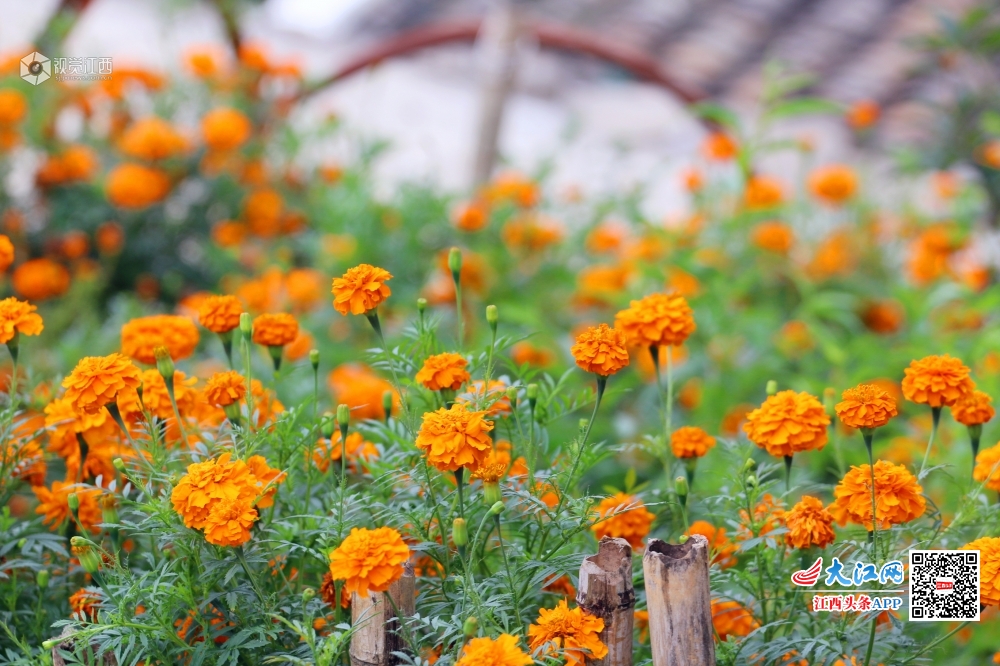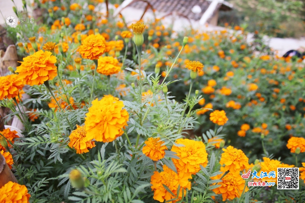 2019年8月24日,在江西省遂川县左安镇桃源村,群众房前屋后的万寿菊正在竞相绽放,花团锦簇,以耀眼金黄色,把周围点缀得色彩缤纷,游客正在赏花拍照。