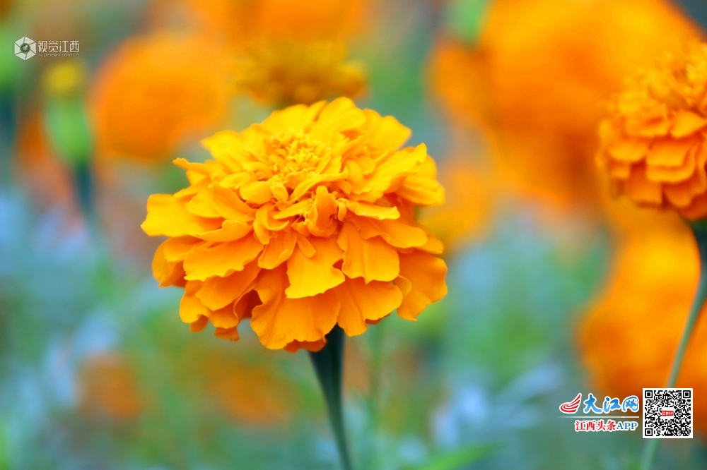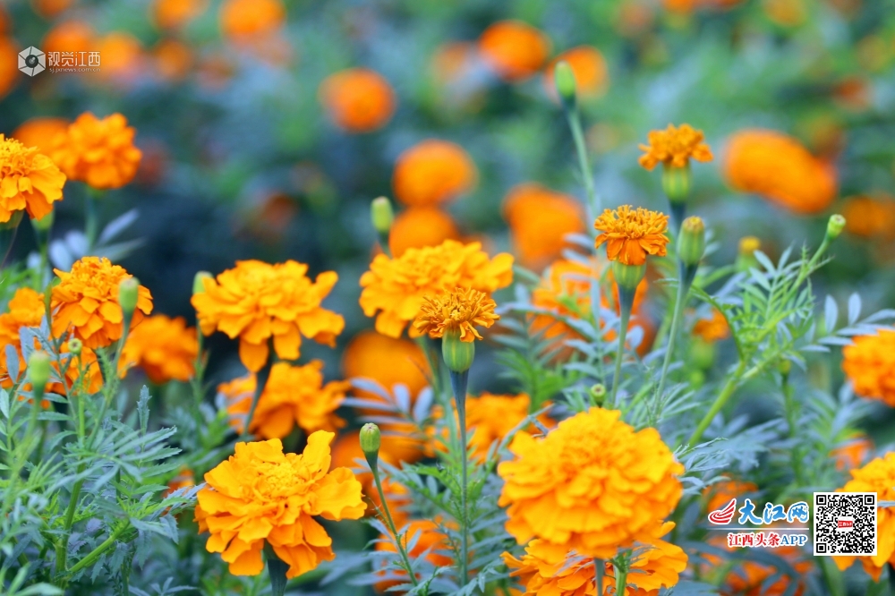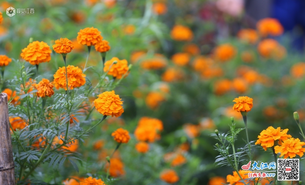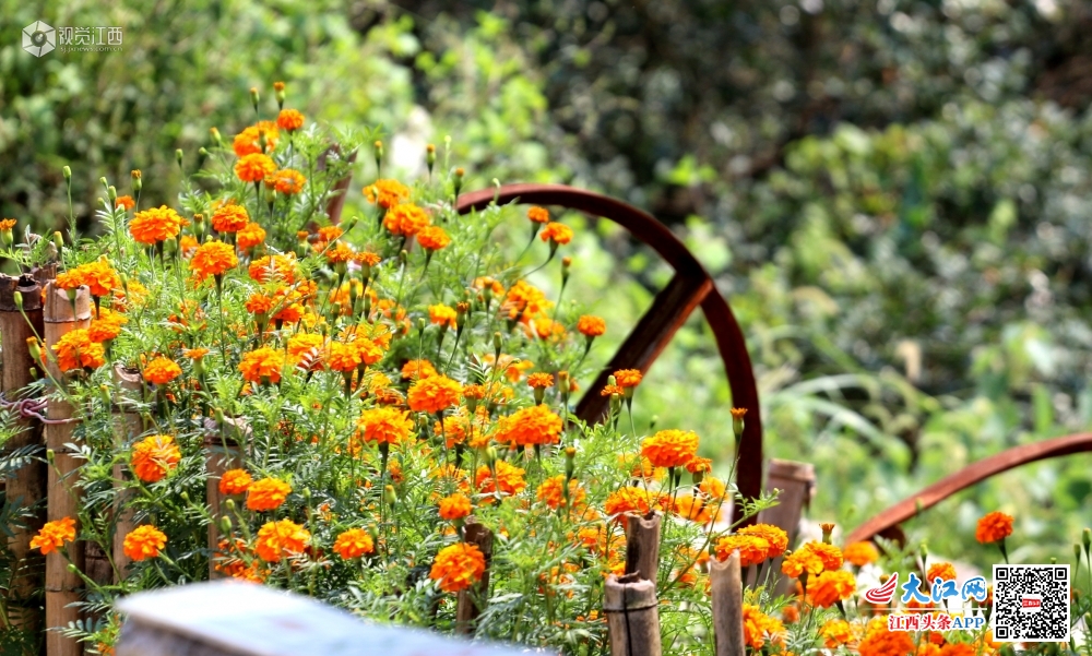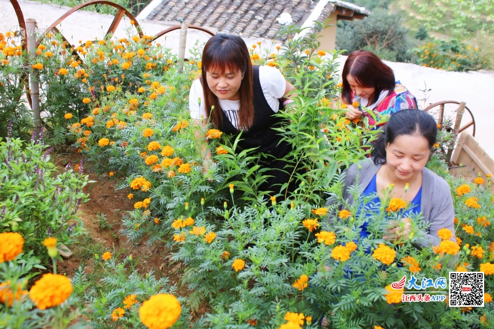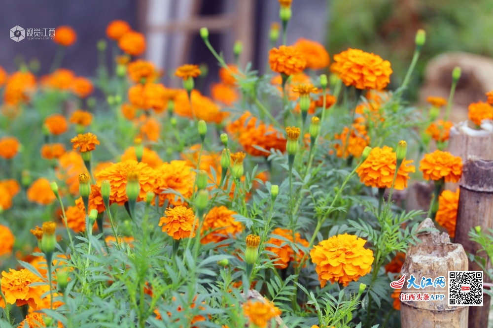 2019年8月24日,在江西省遂川县左安镇桃源村,群众房前屋后的万寿菊正在竞相绽放,花团锦簇,以耀眼金黄色,把周围点缀得色彩缤纷,游客正在赏花拍照。