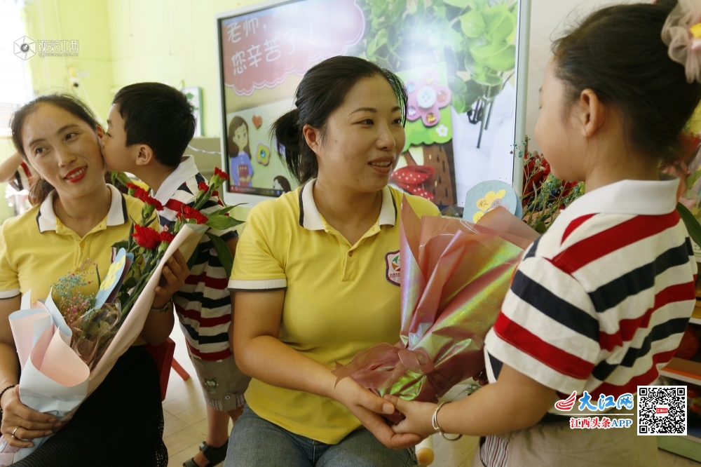 9月9日,南丰县琴城镇社区幼儿园的孩子为老师献上鲜花和贺卡。