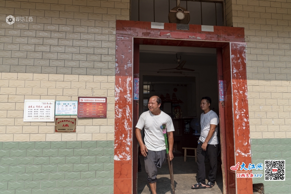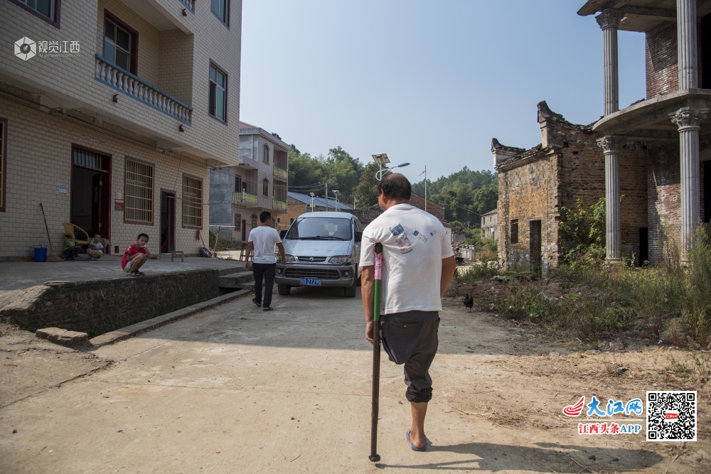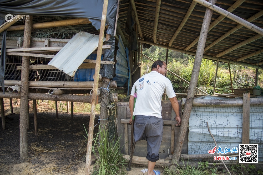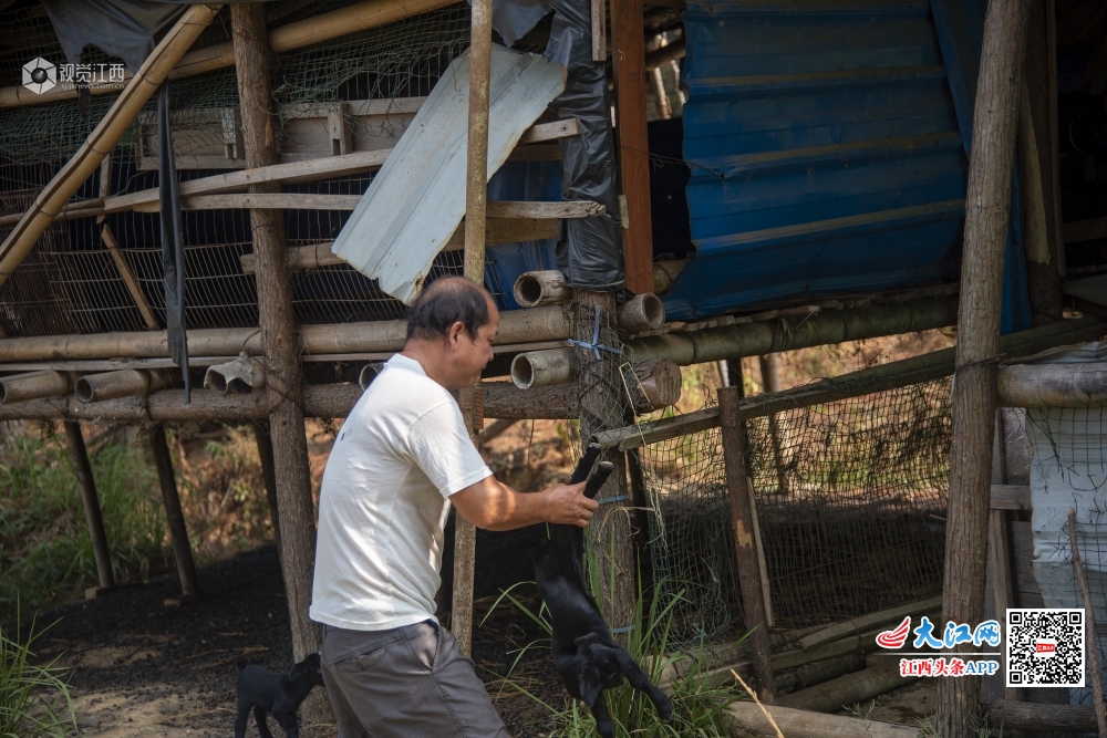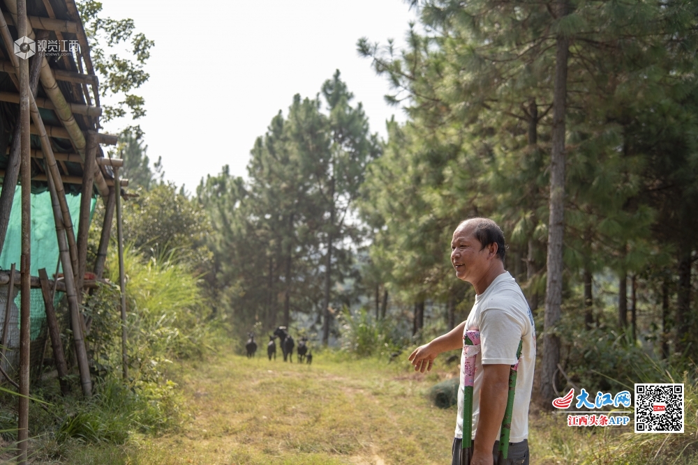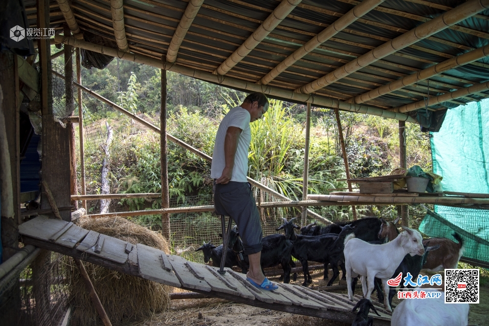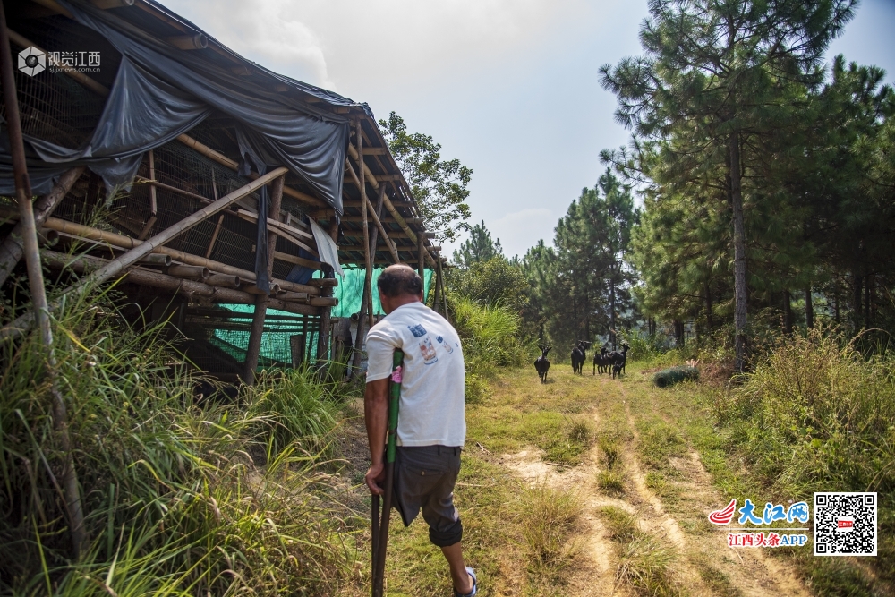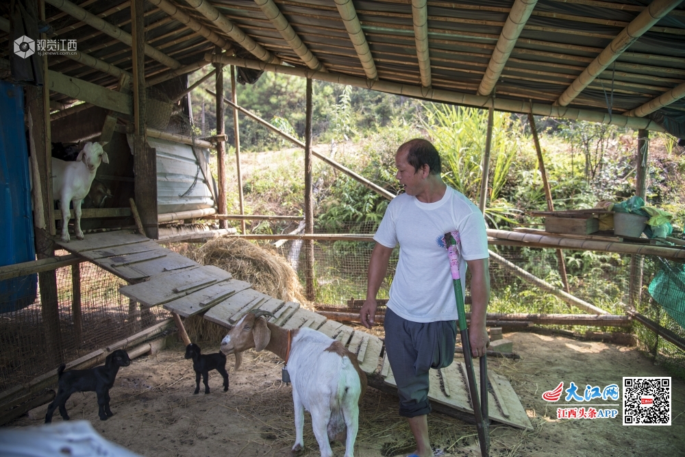 江西省吉水县双村镇桐木村城元自然村的残疾人刘米根,在当地镇村干部帮扶下,靠着一条腿发展山羊养殖走上脱贫致富路。(2019年9月15日摄)