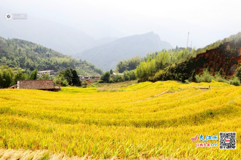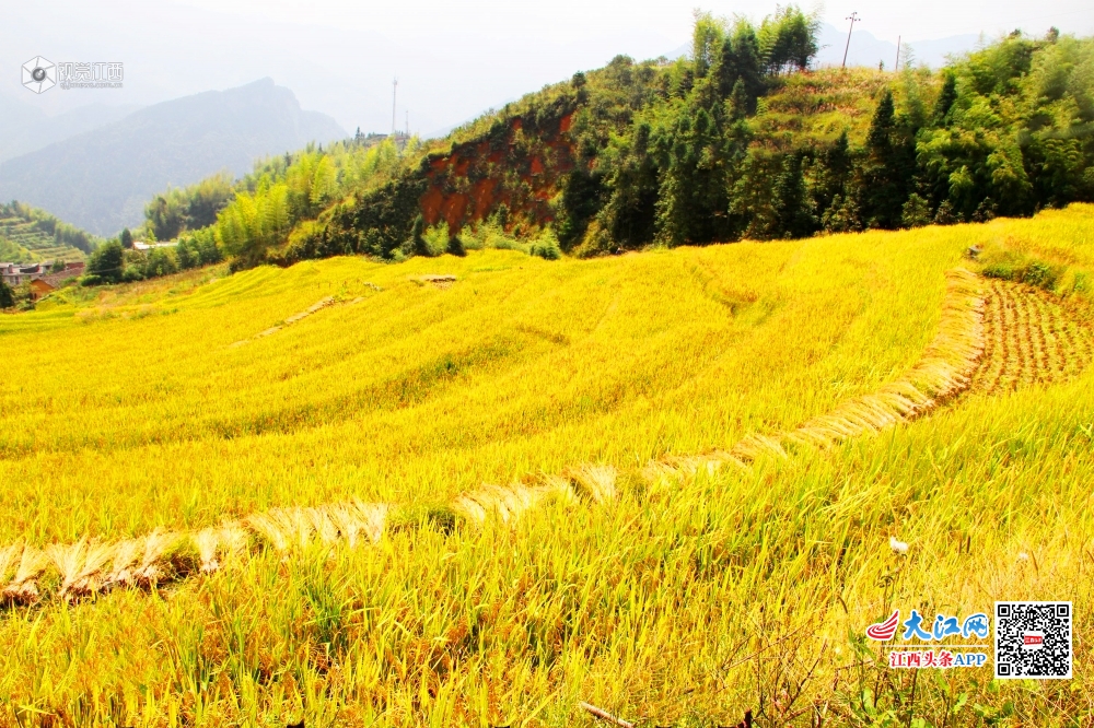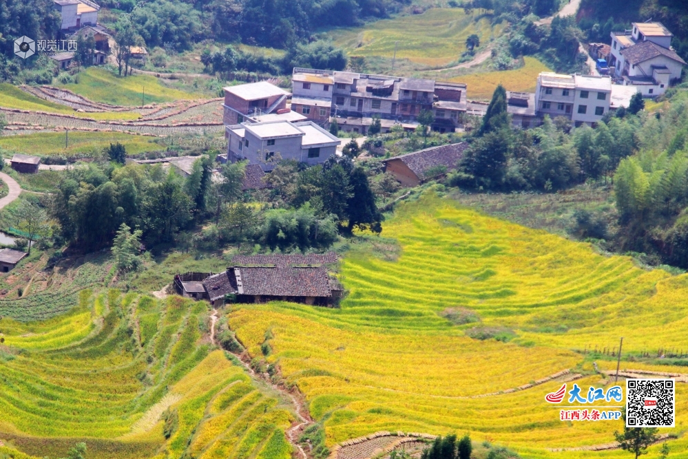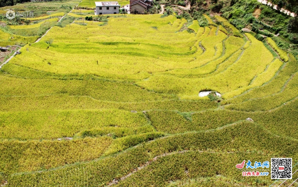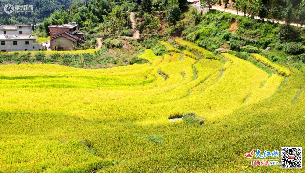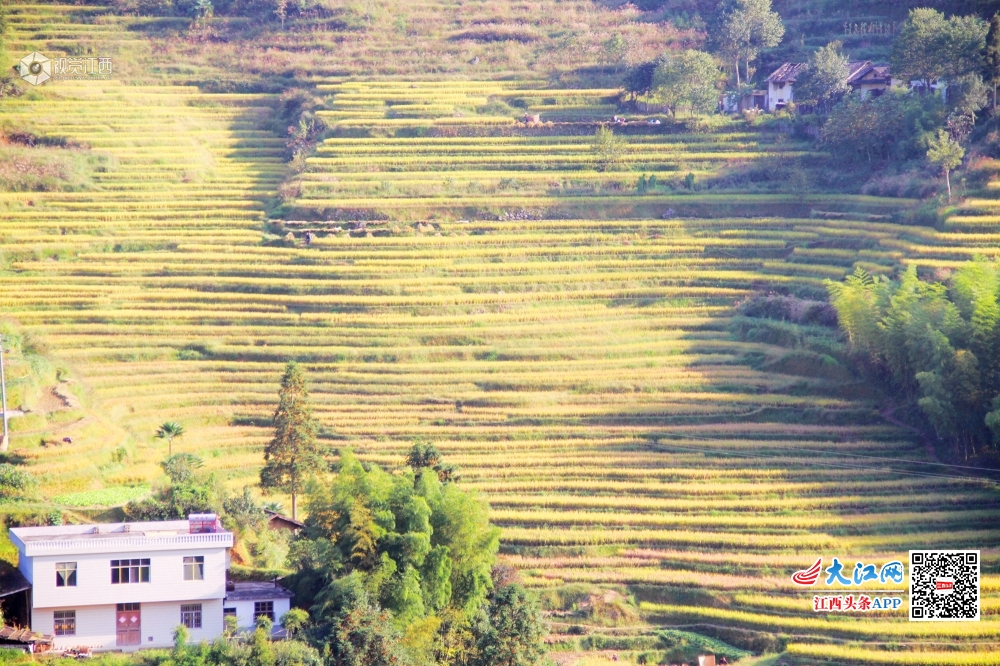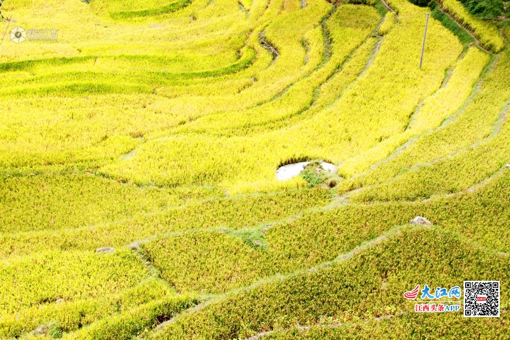 秋日时节秋风开始把江西遂川丰收在望的稻谷染成了色彩斑斓,一层层山间梯田,仿佛腰间系着无数条金色的彩带线条,镶嵌在大地与房舍、群山构成大山里一幅幅如诗如画、美不胜收的“油画”景观。