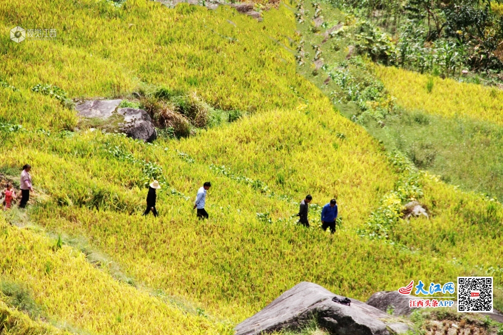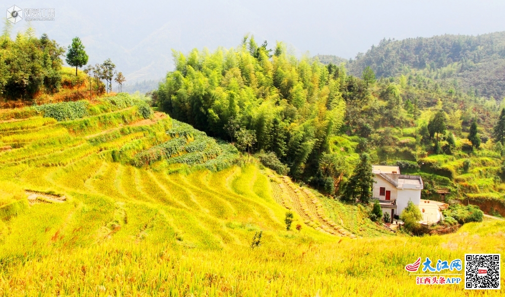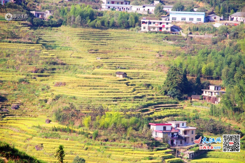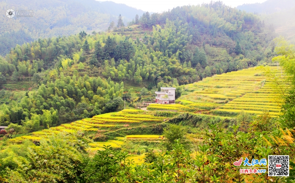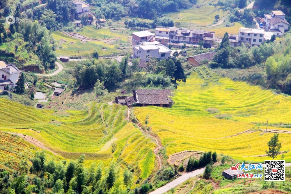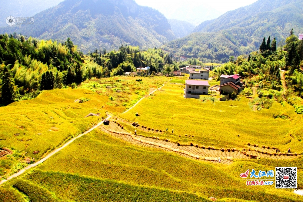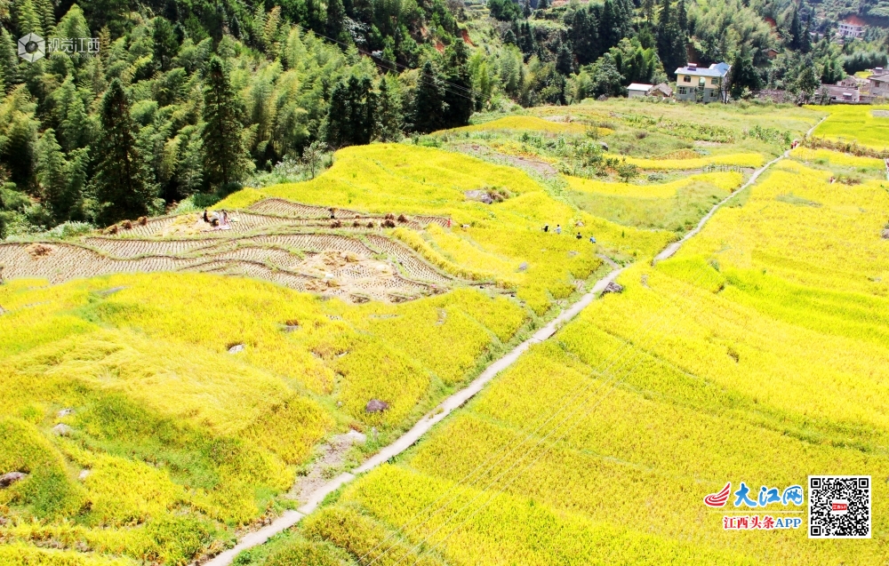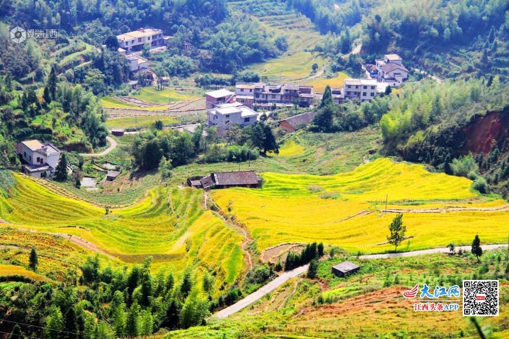 秋日时节秋风开始把江西遂川丰收在望的稻谷染成了色彩斑斓,一层层山间梯田,仿佛腰间系着无数条金色的彩带线条,镶嵌在大地与房舍、群山构成大山里一幅幅如诗如画、美不胜收的“油画”景观。