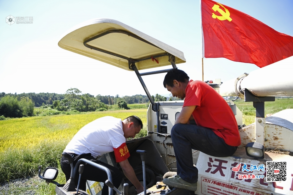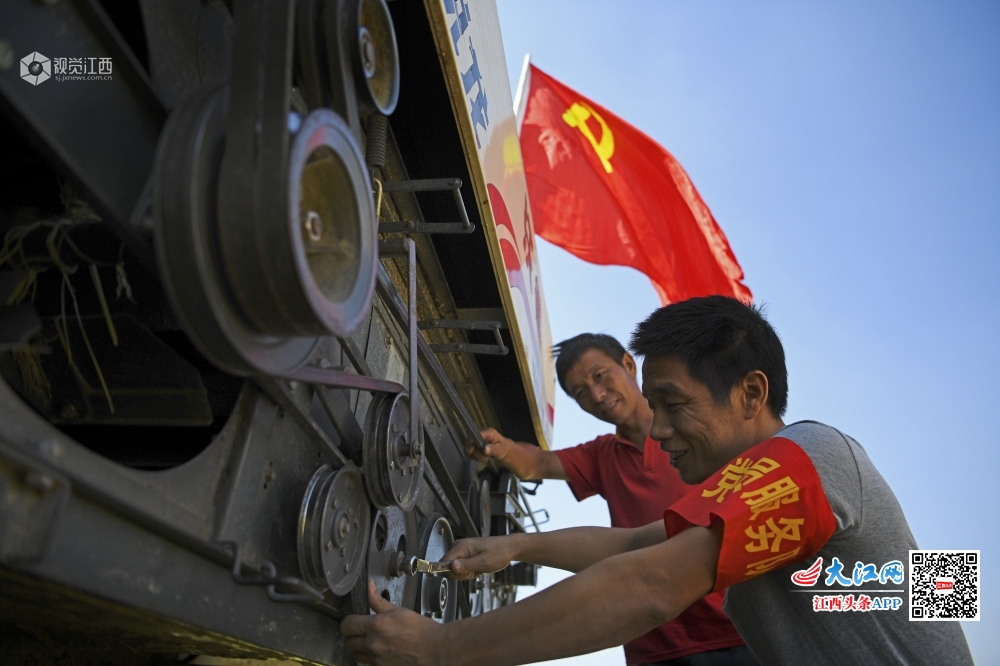 2019年9月20日,在江西省上饶市铅山县汪二镇汪二村田畈,该县农技党员服务队正在为村民检修收割机。为扎实开展“不忘初心、牢记使命”主题教育活动,庆祝新中国成立70周年,近日,铅山县农业机械化管理局组织全体党员开展党员志愿者服务队活动,深入全县各乡镇(中心),对收割机进行全面体检,确保秋收顺利进行。