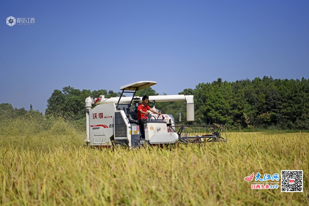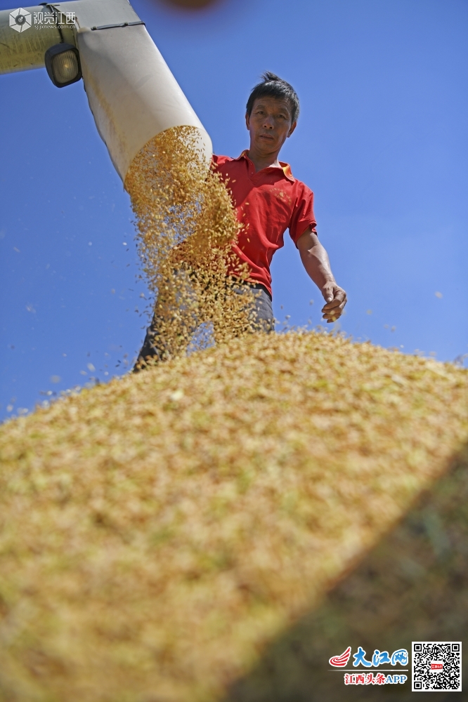 2019年9月20日,在江西省上饶市铅山县汪二镇汪二村,村民正在收割秋粮。初秋时节,铅山县16.7万亩中稻稻田一片金黄,水稻进入收割季节,当地农民纷纷组织农用机械进田收割、运谷晾晒,一派繁忙。