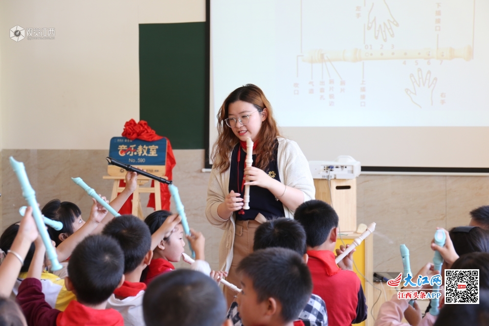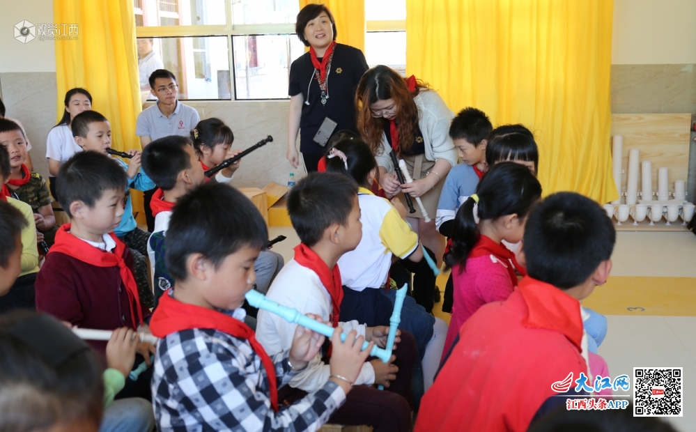 2019年9月24日,壹基金壹乐园音乐教室项目捐赠仪式在江西省遂川县堆子前平安希望小学举行。当日,来自深圳、上海的探访团、“壹基金”公益基金会志愿者们还在音乐教室手把手为孩子们传授吹奏笛子知识,并与孩子们互动。