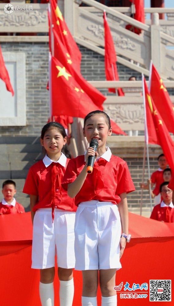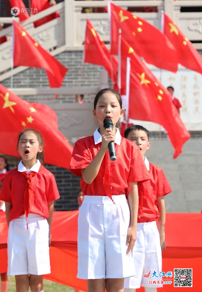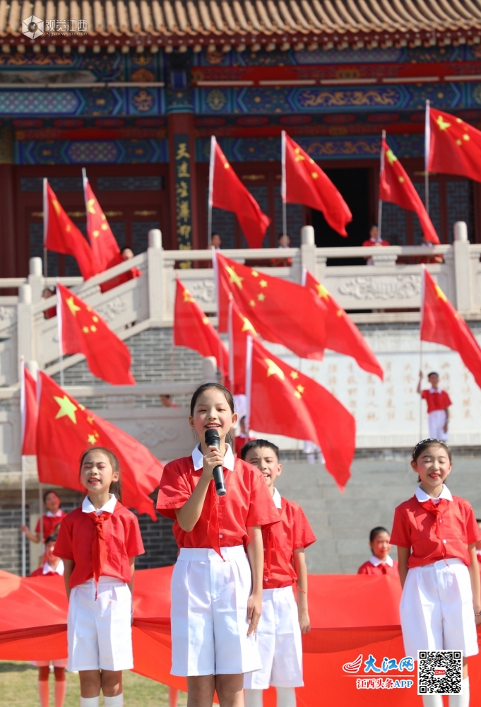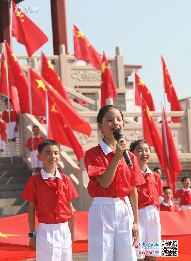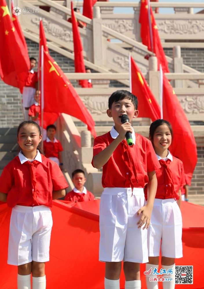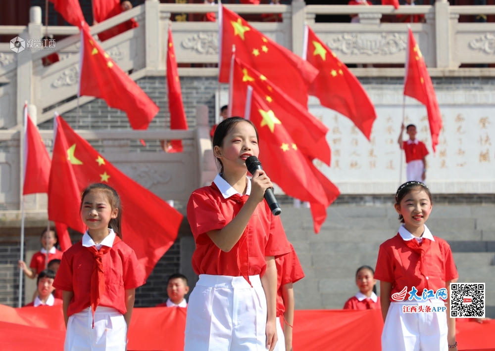 2019年9月28日,江西省吉安市泰和县实验小学学生在千年快阁朗诵《祖国,我想告诉您》,喜迎新中国成立70周年。
