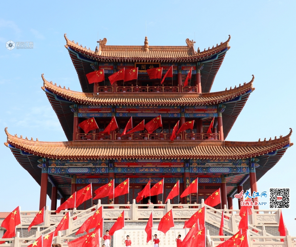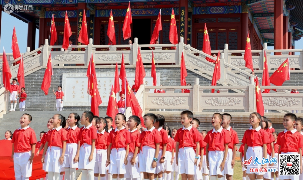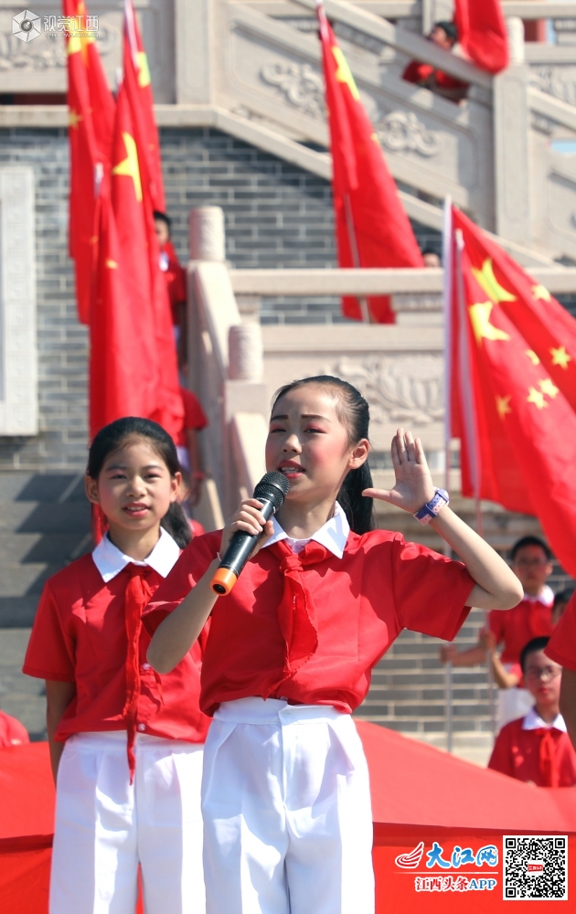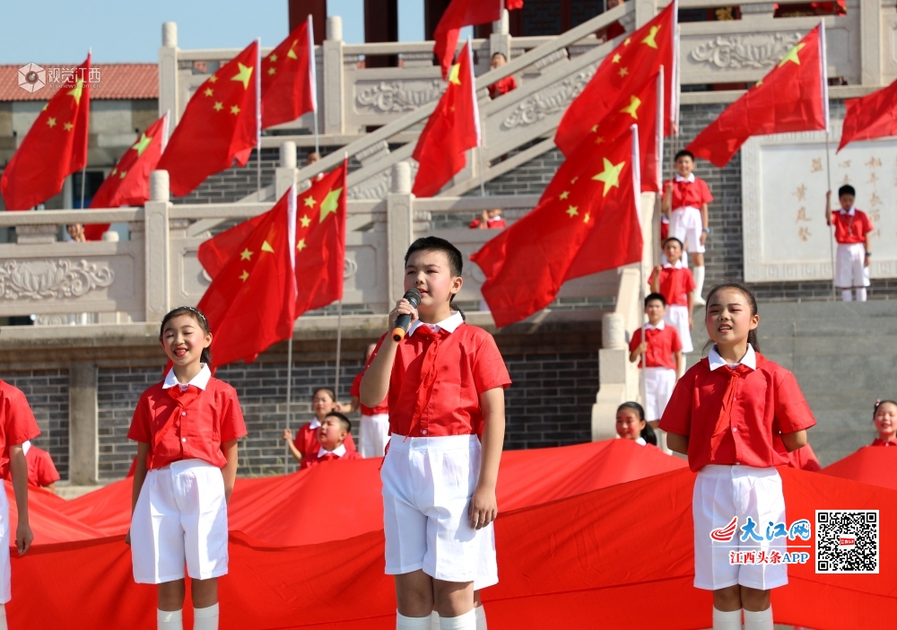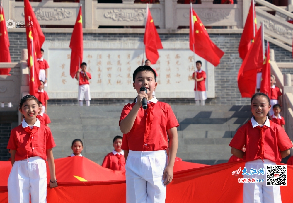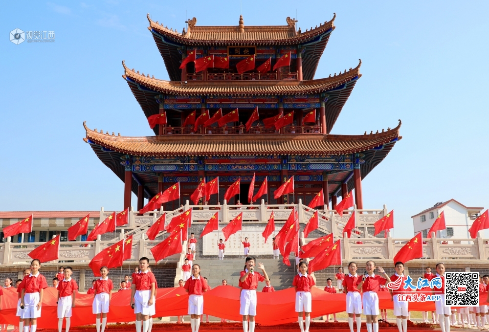 2019年9月28日,江西省吉安市泰和县实验小学学生在千年快阁朗诵《祖国,我想告诉您》,喜迎新中国成立70周年。
