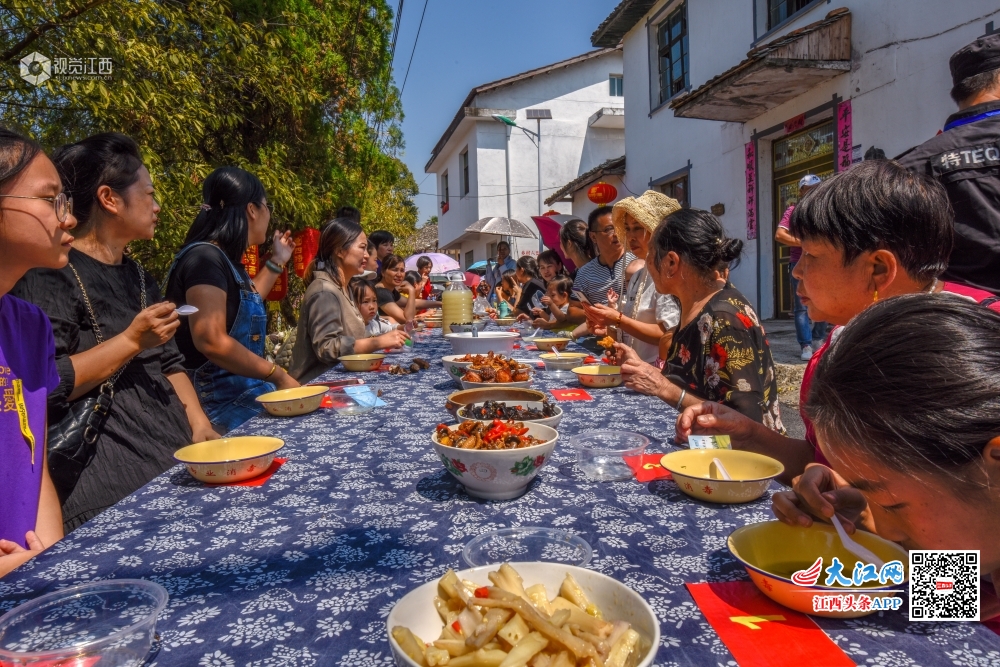最具特色的千人长桌宴吸引着四面八方的游客。村民像往年一样,拿出自家做的传统饭菜,摆成宴席,一桌桌地接龙从村头排到村委。
