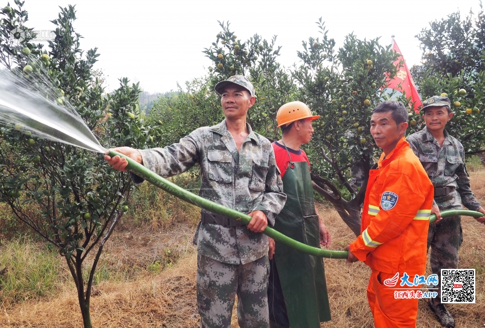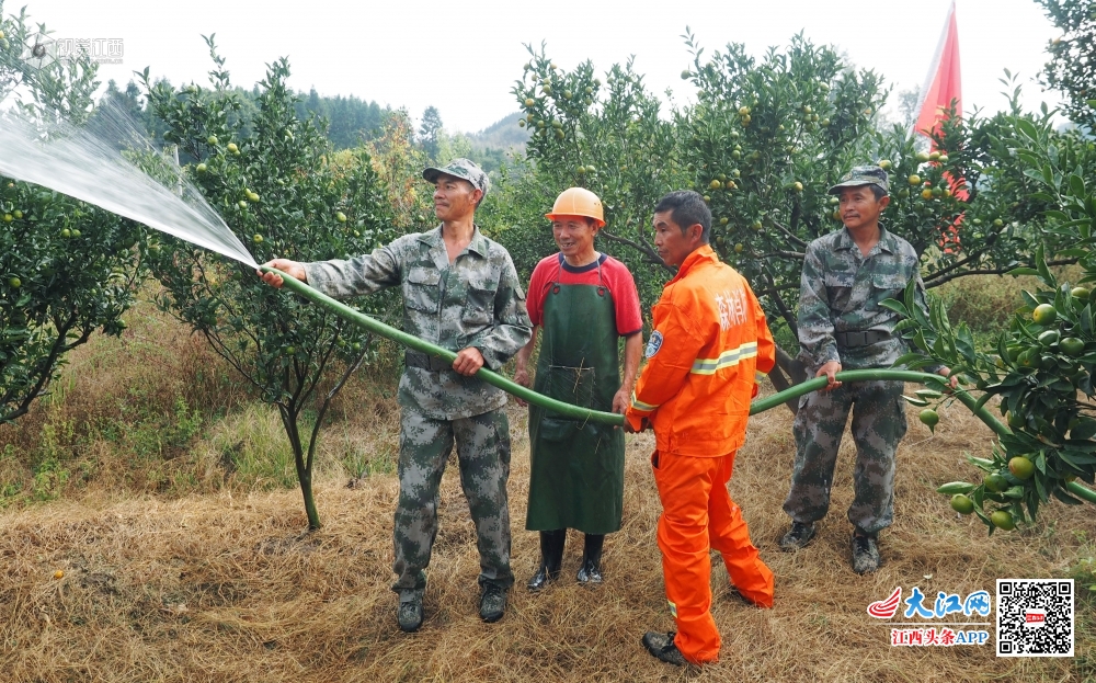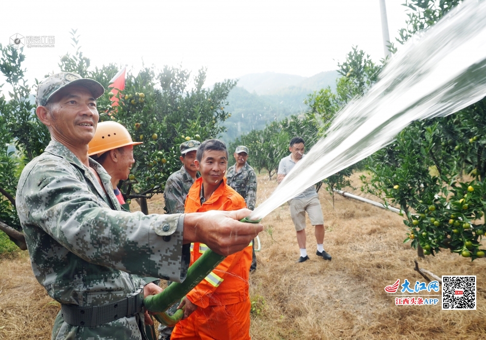 2019年10月5日,江西省南丰县紫霄镇应急小分队民兵正在该镇丰江村帮助缺少劳力的困难群众利用节水灌溉设施浇灌橘树。针对当前持续干旱少雨天气,南丰县组织党员干部、民兵节日坚守岗位、深入抗旱一线,通过加强旱情监测、人工增雨、科学调度水利灌溉设施等措施,帮助农民群众抗击“秋旱”,确保农业丰收。