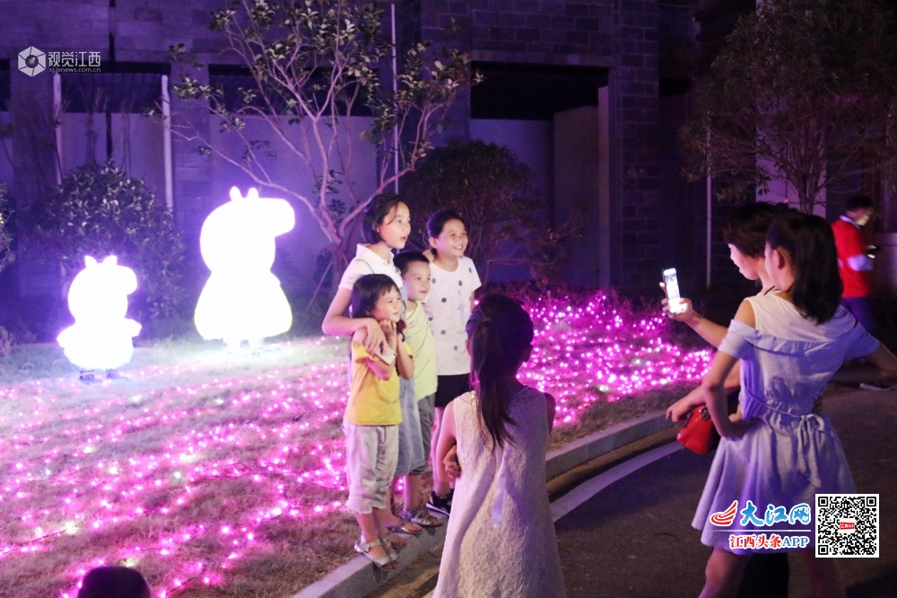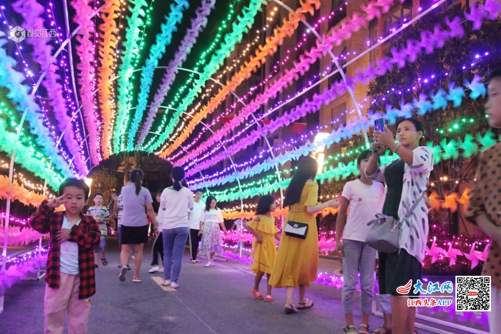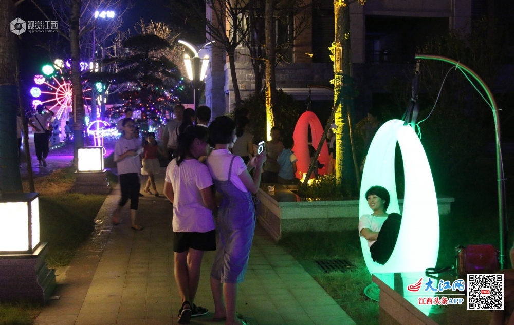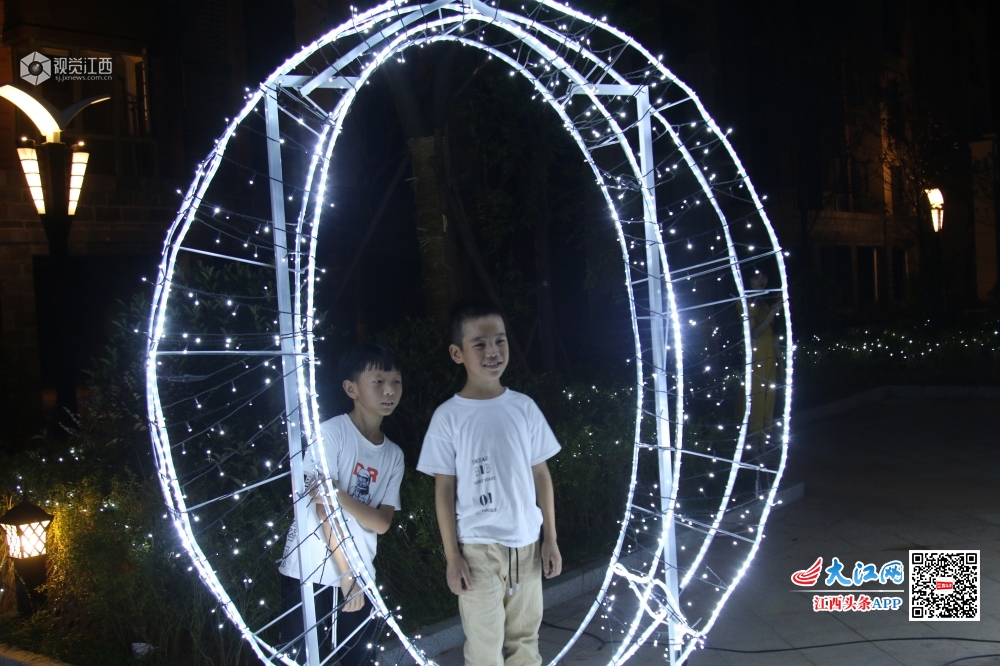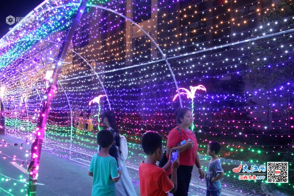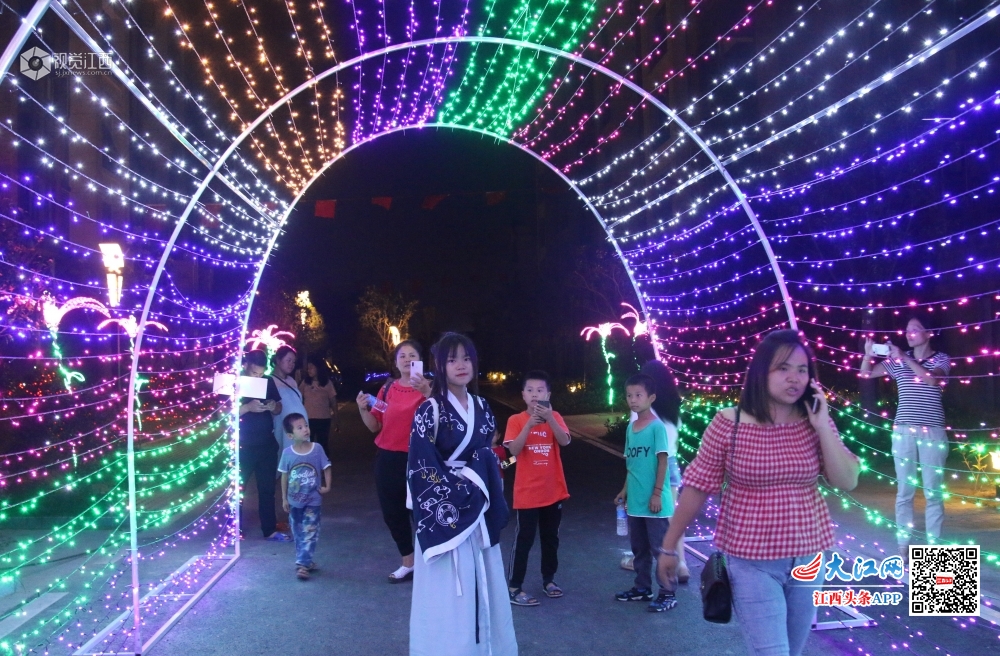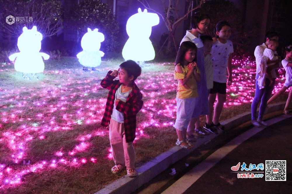 2019年10月4日,江西省遂川县市民们在金域首府小区里观看美轮美奂的夜景灯光秀。十一长假期间,江西省遂川县在广场、街道、小区,每晚到处上演出精致的小型灯光景观秀,演绎一幅美轮美奂的画面,呈现出一派喜庆祥和、国泰民安的国庆氛围,市民们一饱眼福。