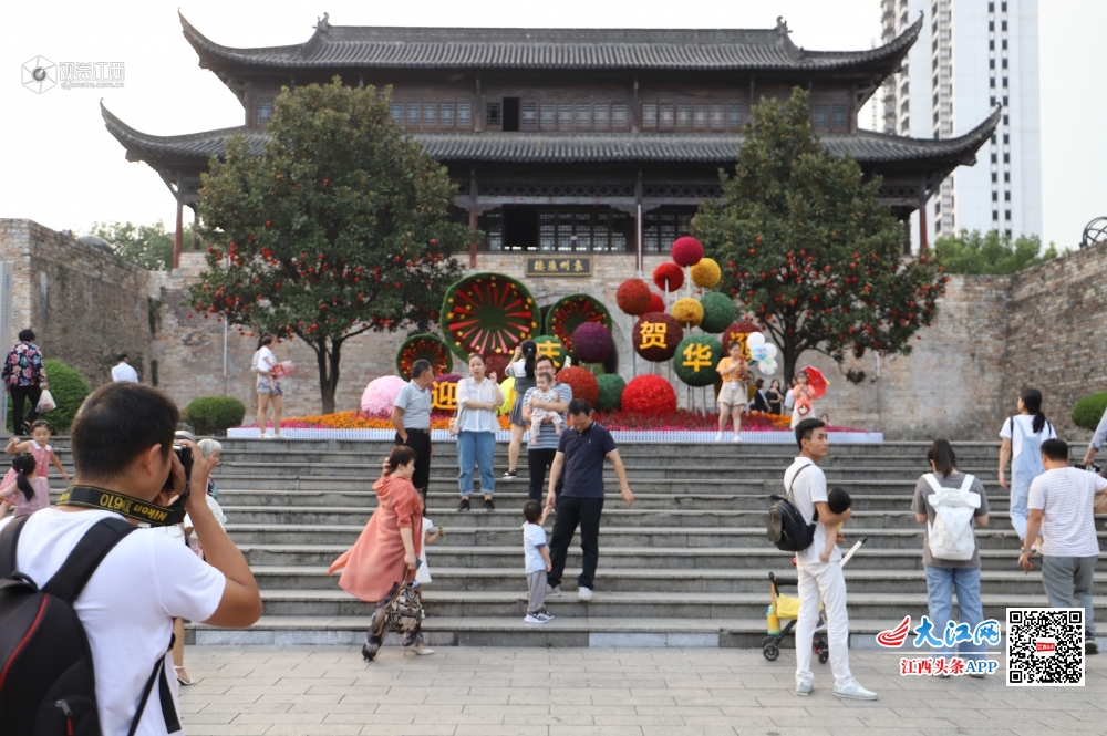 10月5日,国庆假期临近尾声,宜春市地标性建筑——袁州谯楼附近依旧游人如织。游客们纷纷在古谯楼前“七十华诞·四季春城”主题绿雕旁合影留念,记录下幸福美好的时刻。