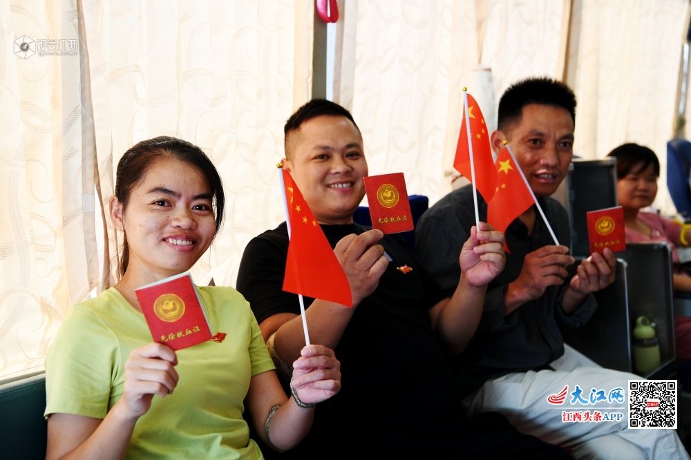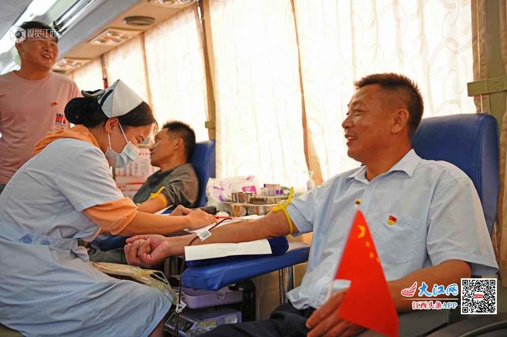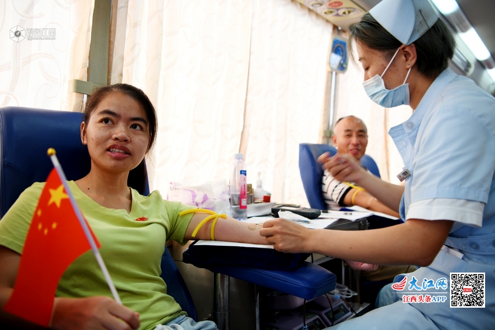 2019年10月6日,在江西省上饶市铅山县河口镇辛弃疾广场,为庆祝新中国成立70周年,弘扬“我为祖国献热血”无偿奉献精神,该县陈坊乡长寿畲族村党支部组织党员、县人大代表、乡人大代表开展义务献血活动。