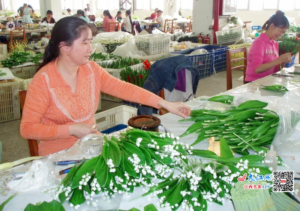 2019年10月7日,在位于江西省遂川县工业园区西区的新鹏工艺品有限公司车间内工人们正在生产人造花。国庆假期,该公司各车间机声隆隆一片繁忙,工人们赶制生产高档仿真人造花、树等外销工艺品订单。该公司生产的产品质量上乗、经济实用,畅销国内,并远销欧美多个国家。