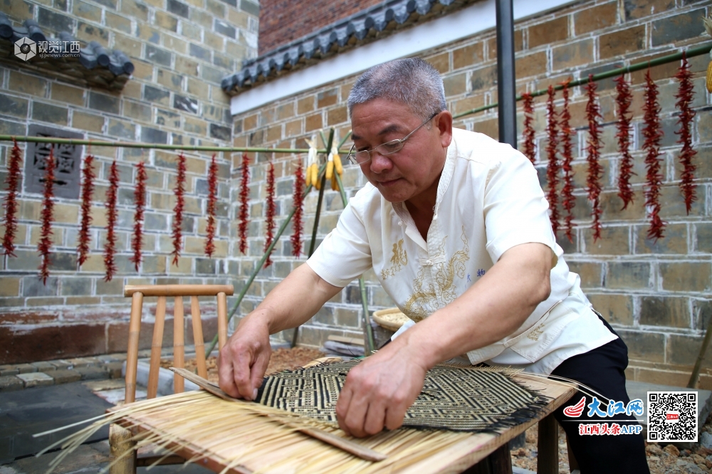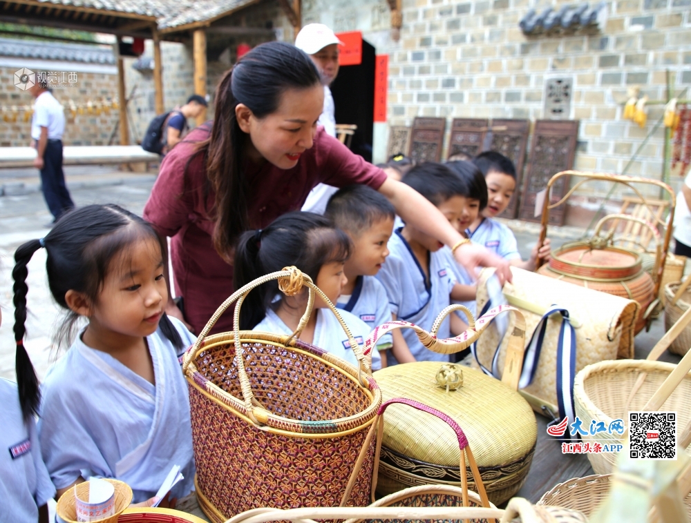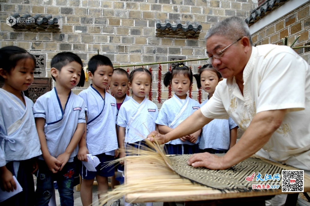 10月12日,分宜县市级非遗竹编传承人李年根在该县民俗古屋陈家大院内给幼儿园的小朋友现场编织图案精美的竹席子,教孩子们学非遗,长知识,激发孩子们对非物质文化遗产的兴趣。