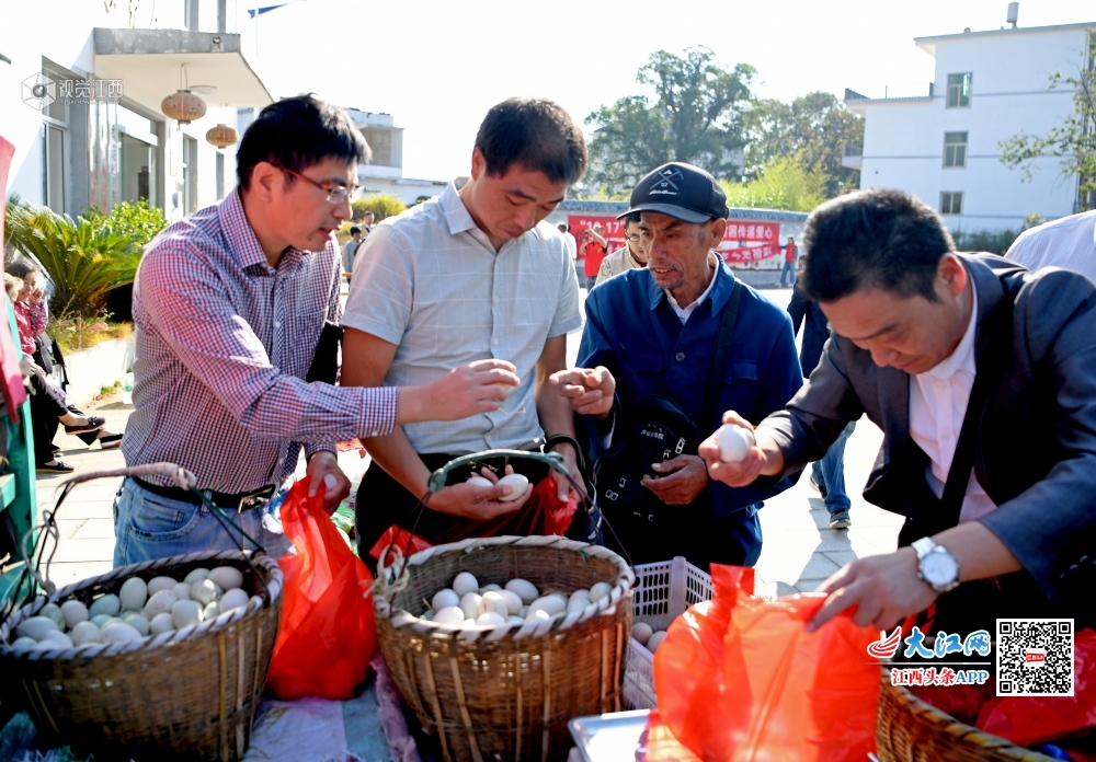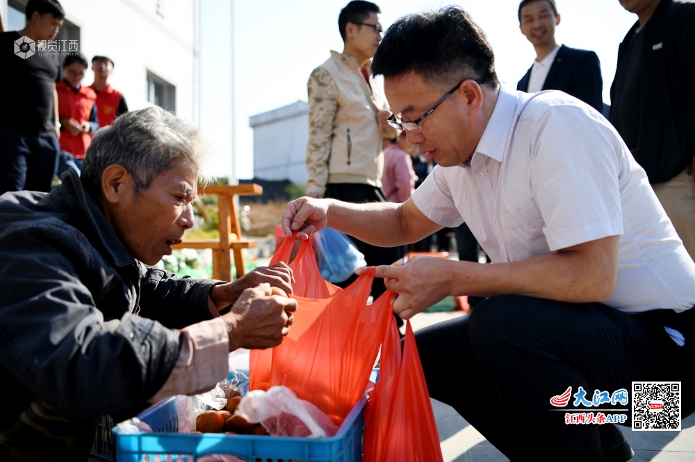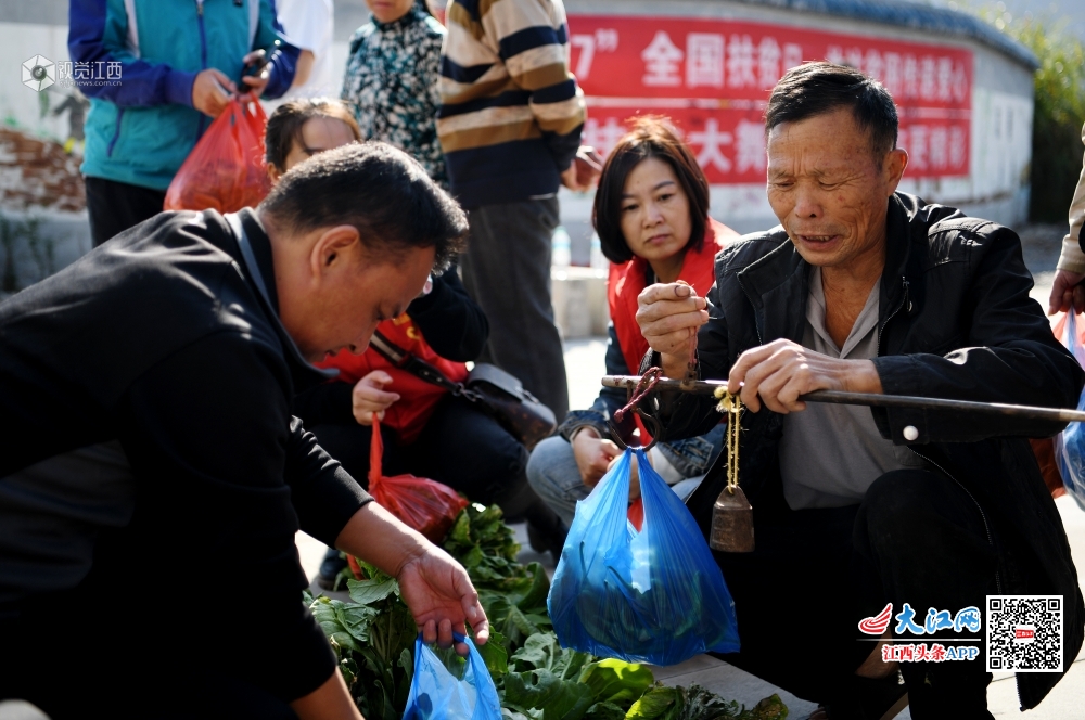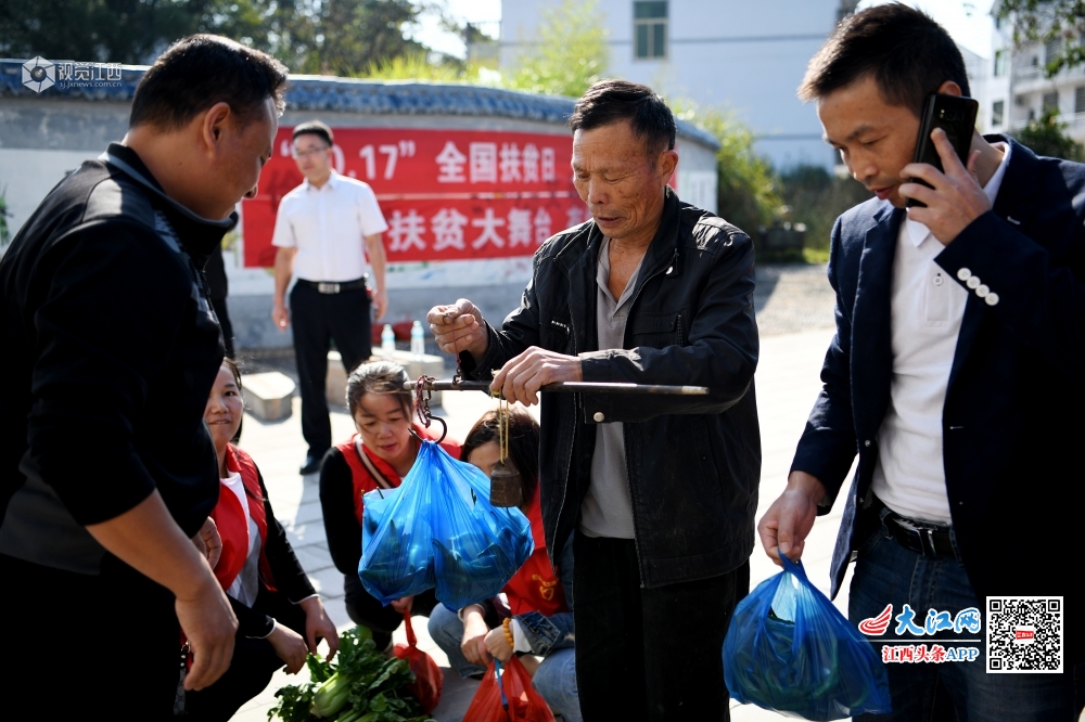 2019年10月16日,在江西省上饶市铅山县新滩乡后畈村,市民在购买农产品。为汇聚社会各方力量,激励贫困群众积极发展生产,早日实现脱贫致富。近年来,铅山县积极开展“扶贫集市”爱心认购活动,以购代捐的形式帮助贫困户增收,拓展贫困户农副产品销售渠道。