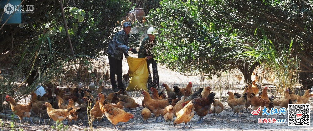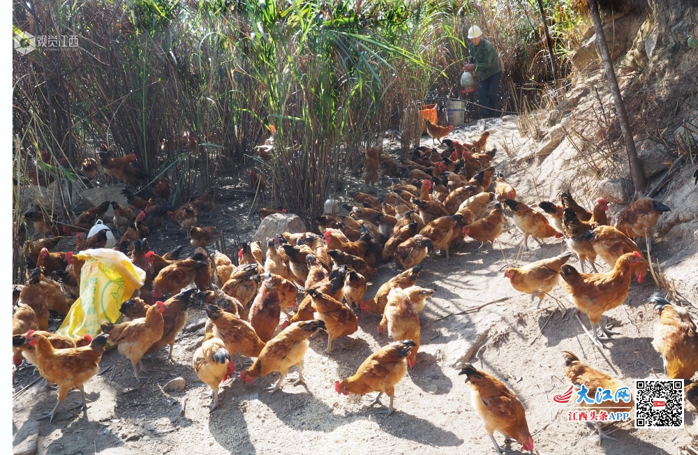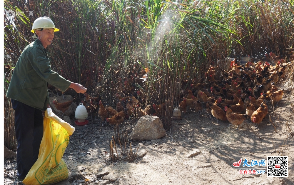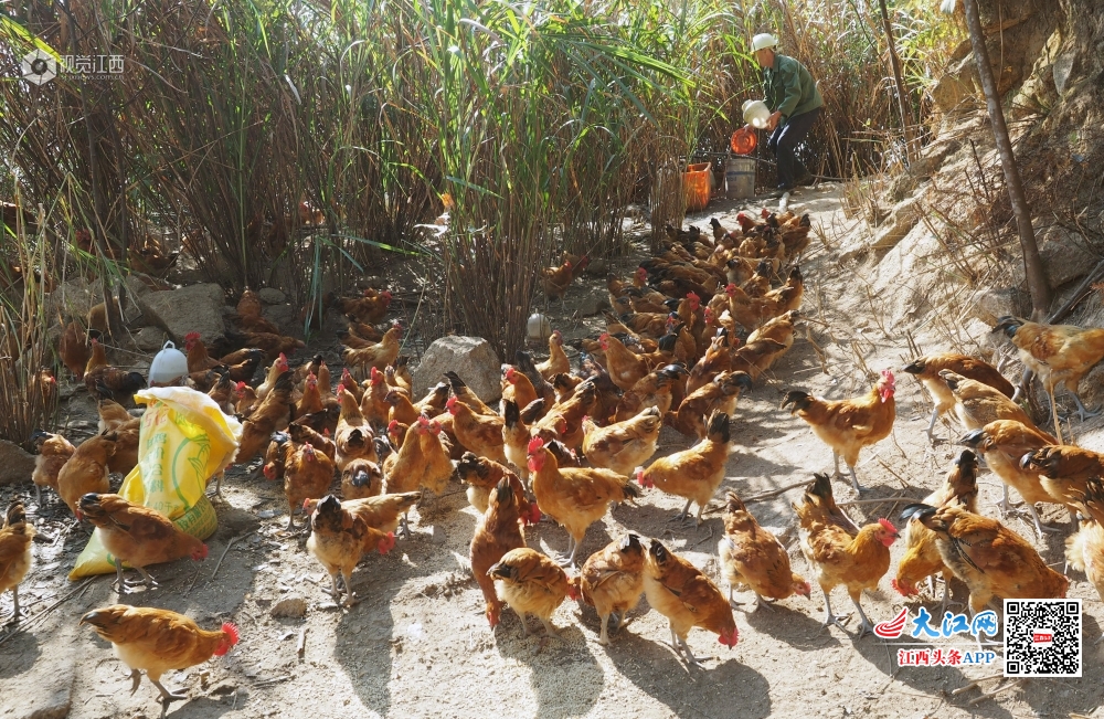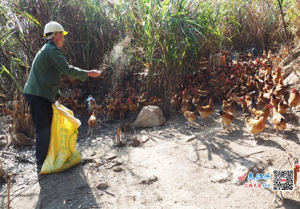 2019年10月16日,江西省南丰县三溪乡庙前村塔岭村小组贫困户吴水旺正在给“山鸡”喂食。今年以来,南丰县三溪乡把脱贫攻坚工作作为“不忘初心,牢记使命”主题教育的重点内容来抓,积极探索“党支部+合作社+贫困户”产业帮扶模式,引导贫困农户利用自然条件优势发展林下养鸡、高山蔬菜等特色种养业,助推精准扶贫到户。
