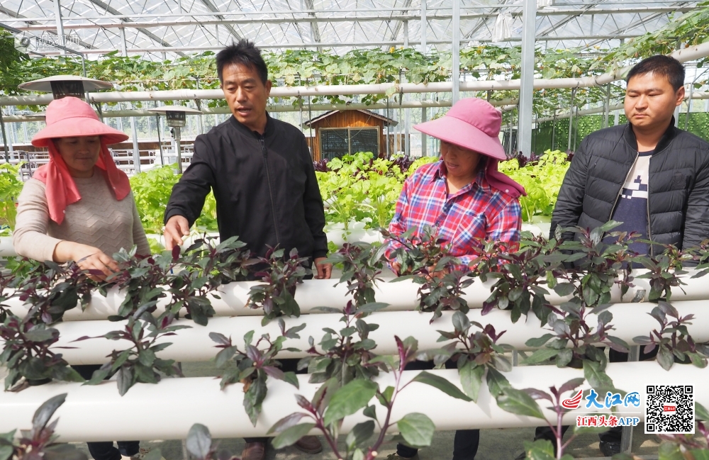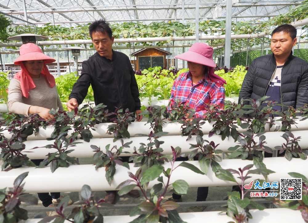 2019年11月5日,在江西省南丰县太和镇农业科技示范园无土水培蔬菜种植“扶贫车间”,“土专家”张昌银(左二)正在向贫困农户传授水培蔬菜种植技术。为了帮助贫困农户加快脱贫步伐,南丰县太和镇成立了以农业科技示范园为龙头的蔬菜种植、甲鱼养殖、白莲栽培“扶贫车间”,聘请经验丰富的“土专家”担任技术指导,吸纳了建档立卡的43户贫困农户以土地、劳动力就业、带动种植等形式入股,不仅使入股贫困户年收益达到3万元,而且“技术扶贫”带动了周边农户发展种养产业脱贫致富。
