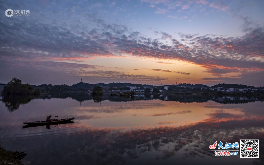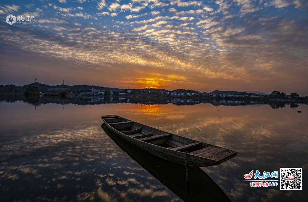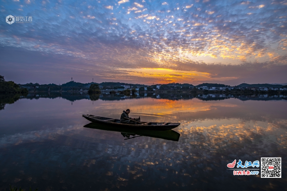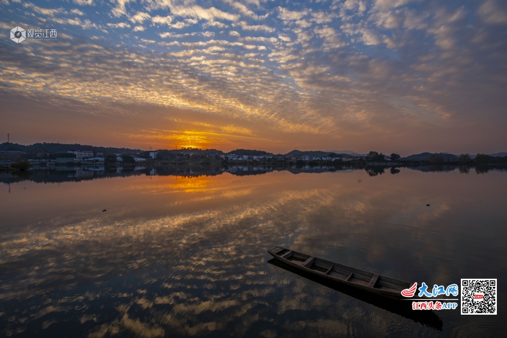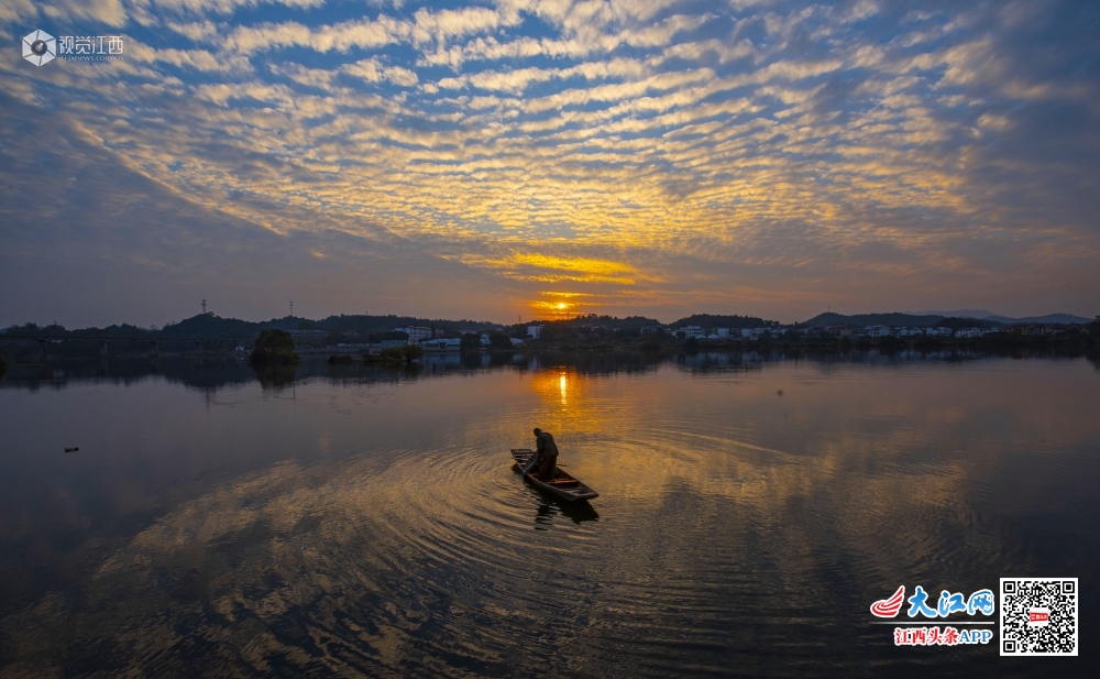 11月11日,新余市仙女湖上空徐徐飘动的云彩和变幻的霞光与湖面上的渔舟交相辉映,如诗如画,现场景色美轮美奂,分外壮观。