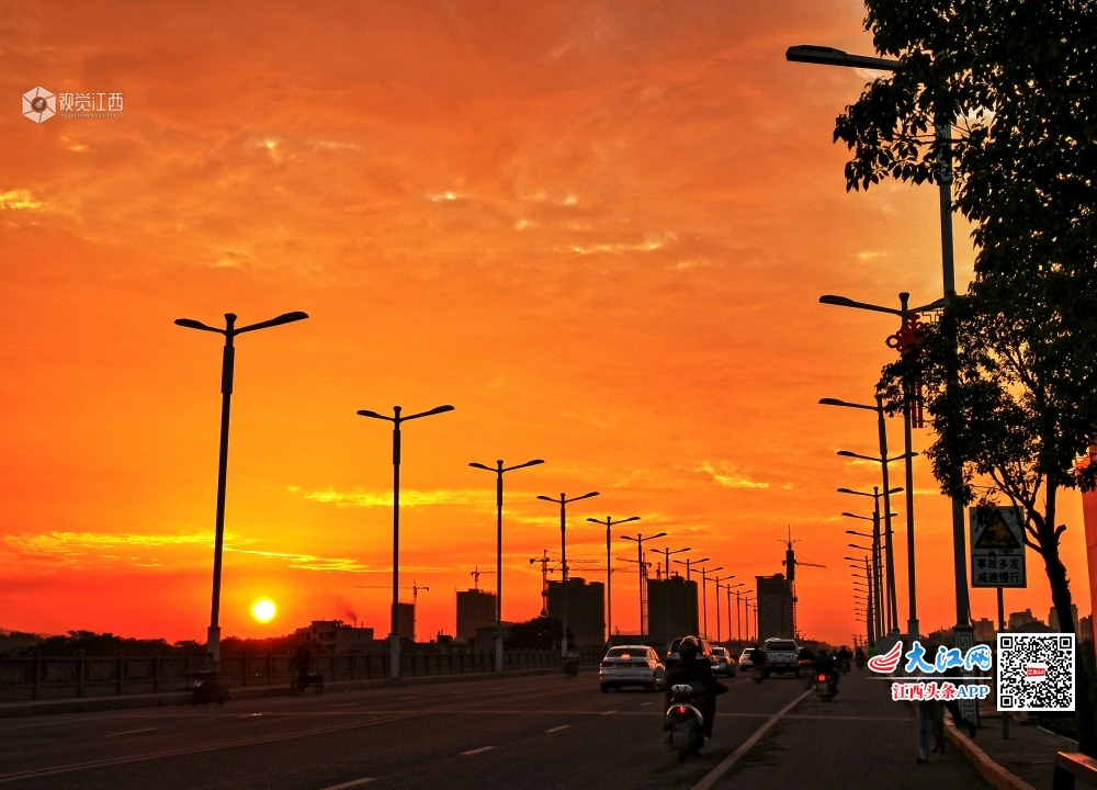 当天,日落时分,大大的太阳,看起来很是温柔。红彤彤的太阳把天空云彩映照霞光满天,美丽如画。