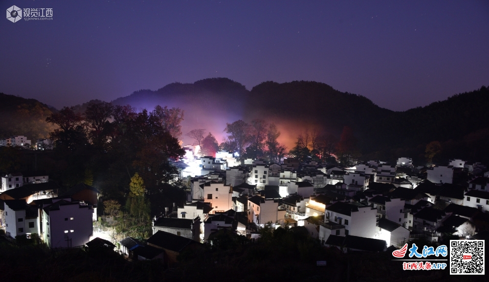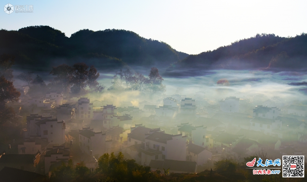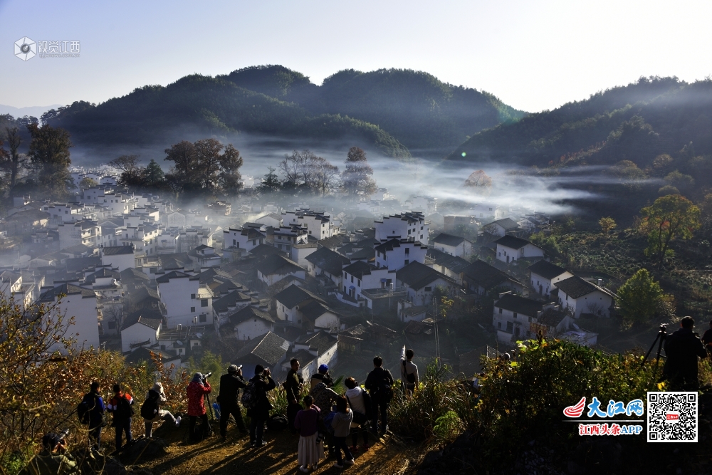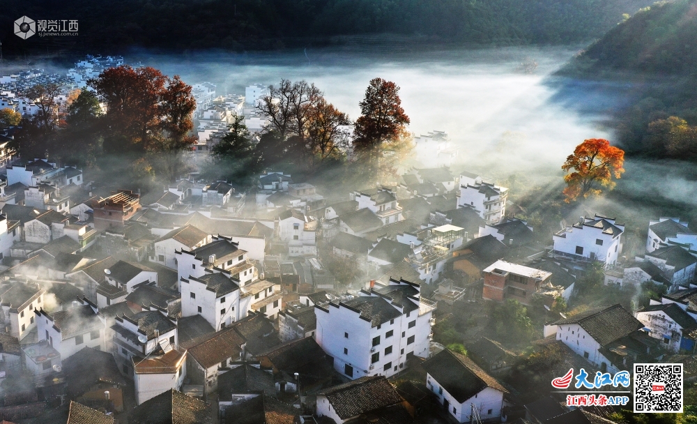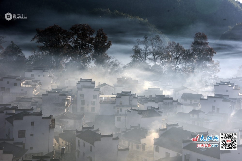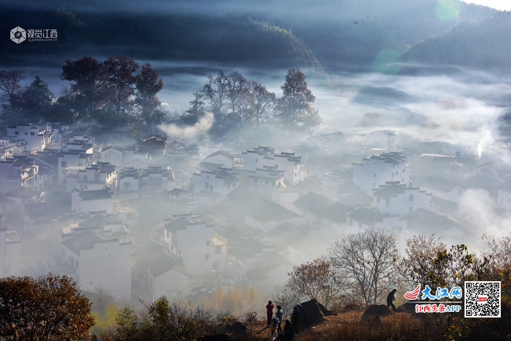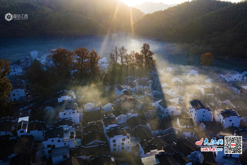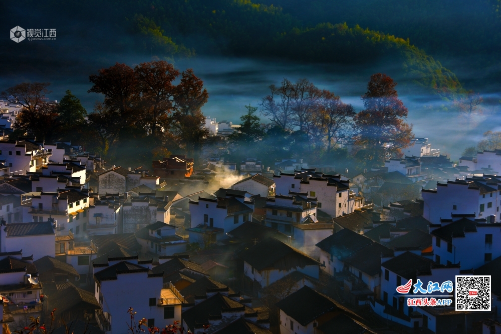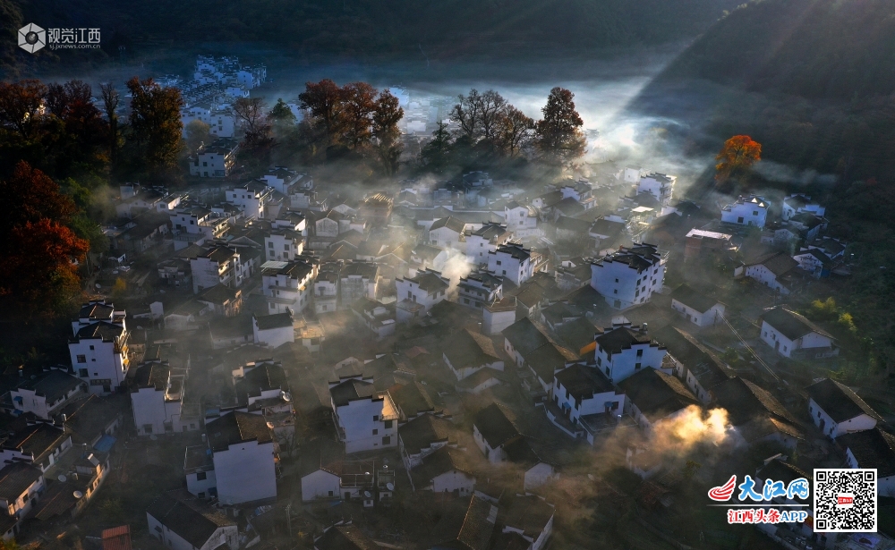 2019年11月16日,江西省上饶市婺源县大鄣乡石城古村炊烟弥漫,在冬日阳光照射下,白墙黛瓦,层林尽染,五彩缤纷的树叶与萦绕飘逸的晨雾相应成景,宛如人间仙景,美不胜收,吸引了中外游客。