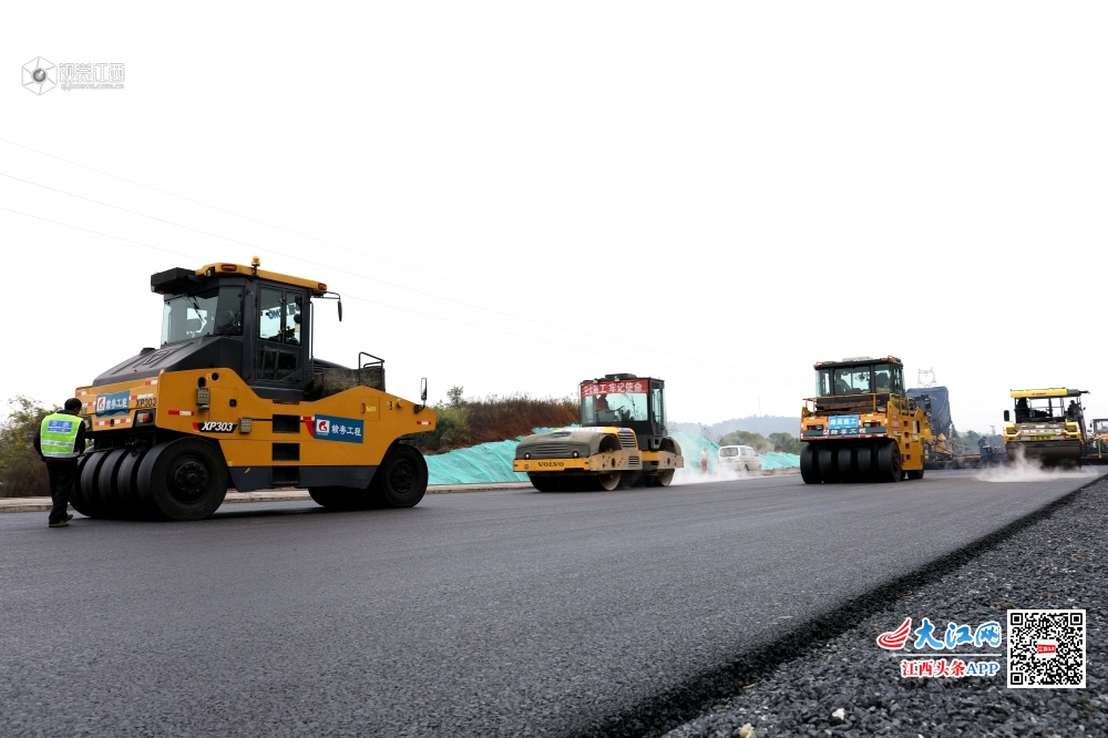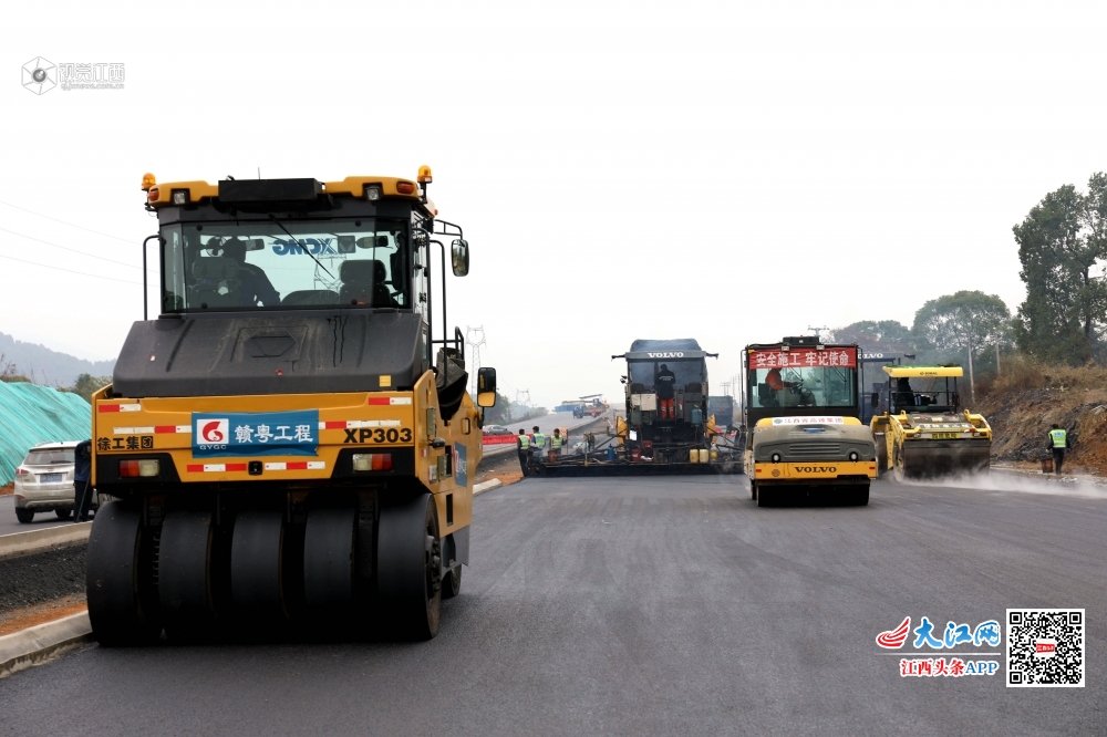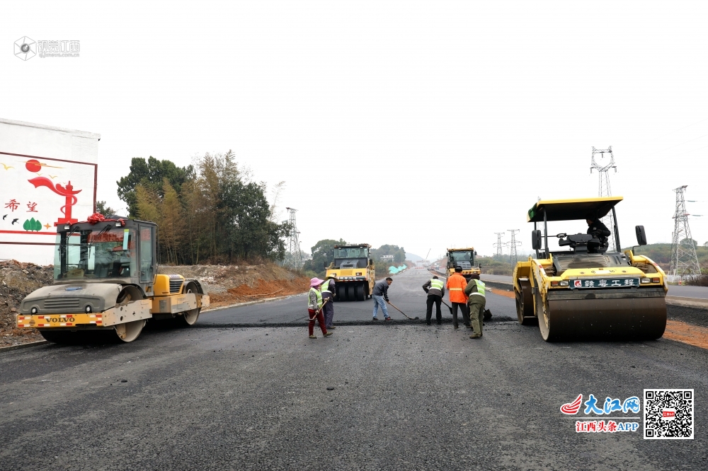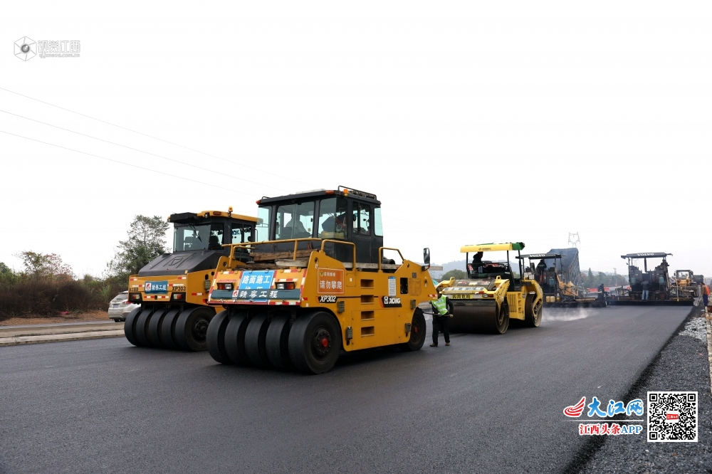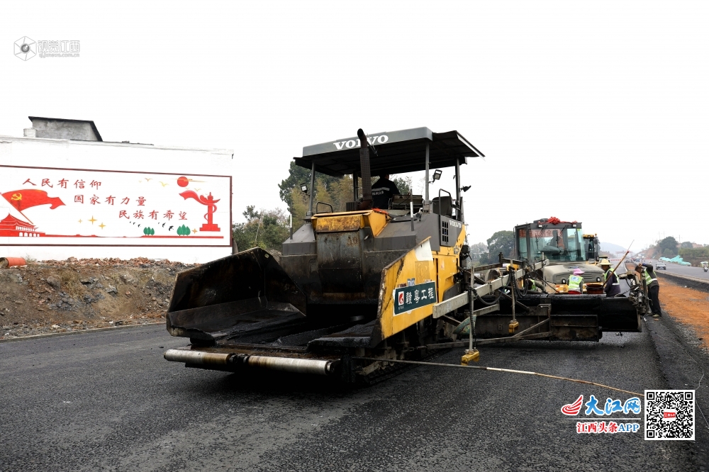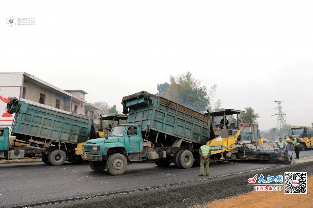 11月28日,省重点建设工程省道S222线分宜县绕城段一级公路改建工程分段摊铺沥青、划标线同步进行施工。路牙石、绿化等施工项目正全面推进。图为省道S222线分宜下坊江背路段的摊铺机、压路机、运输车正在紧张作业,忙而有序。